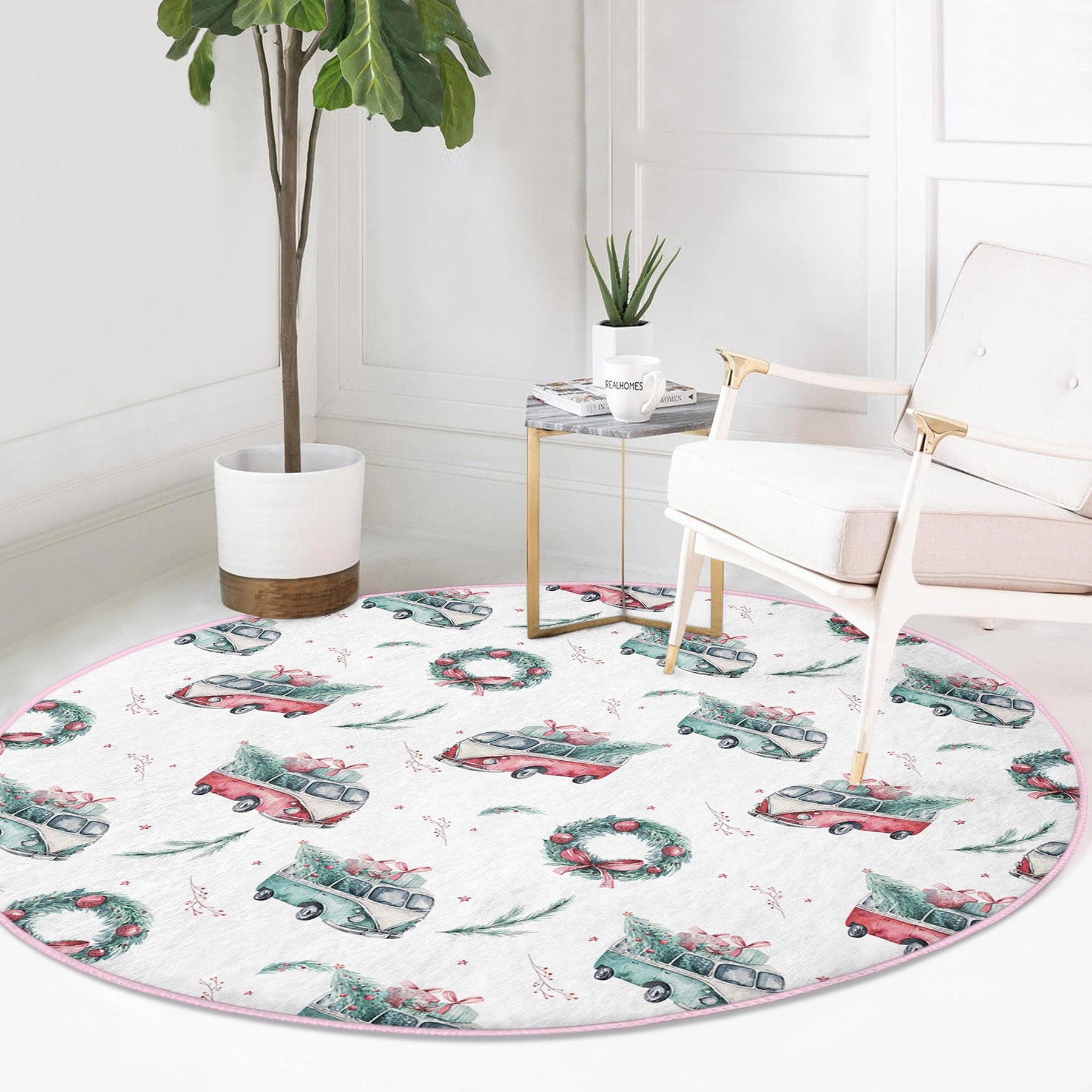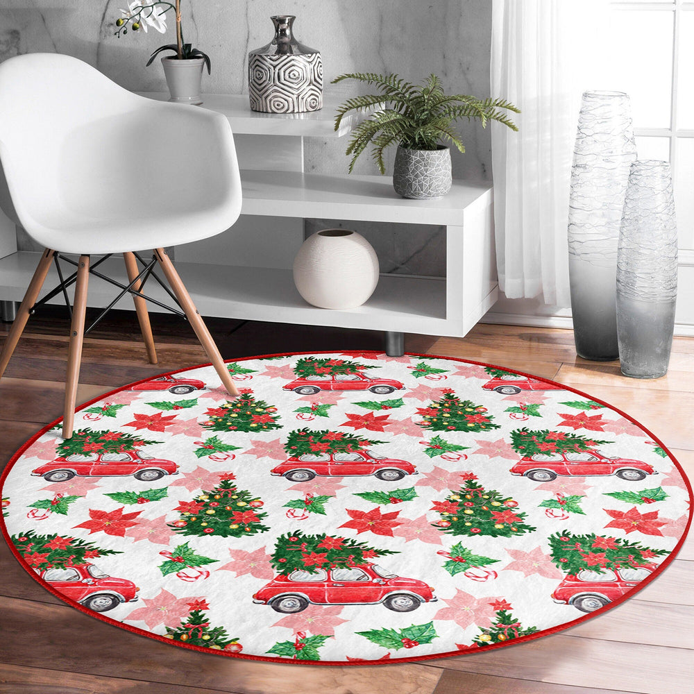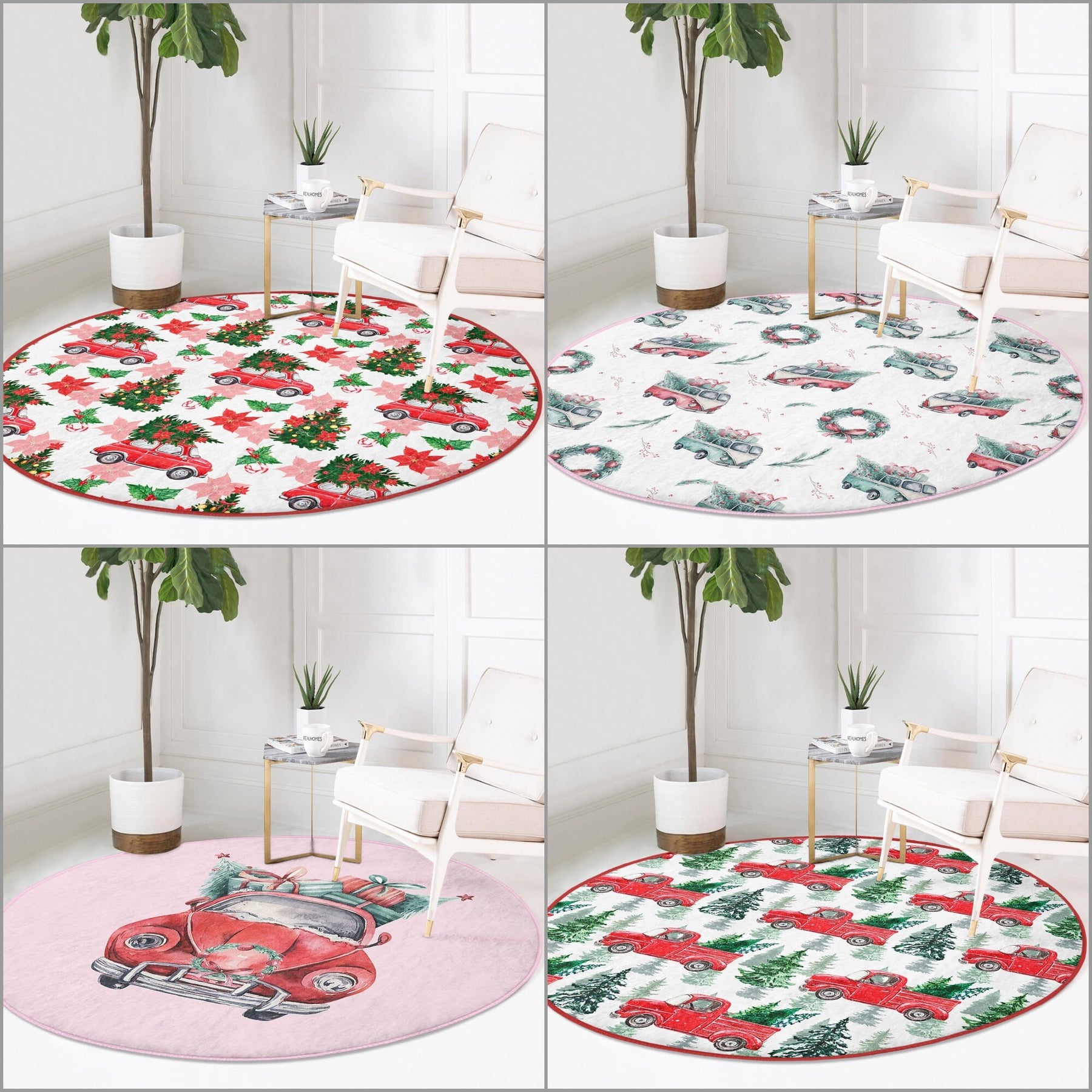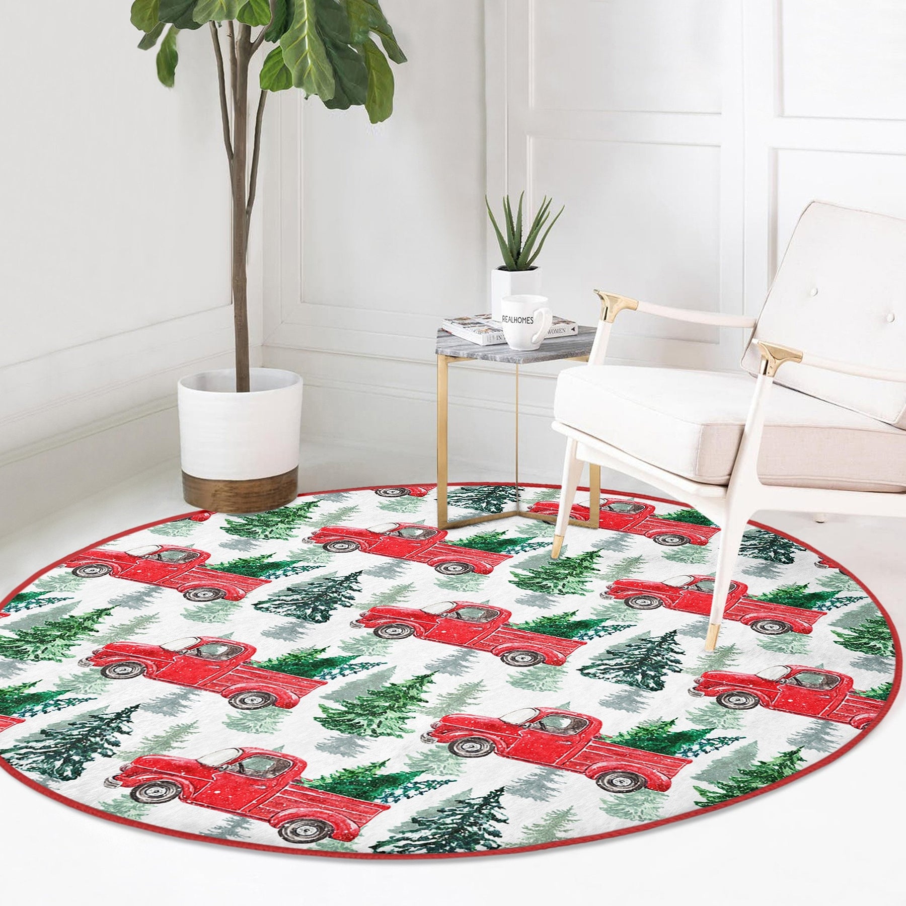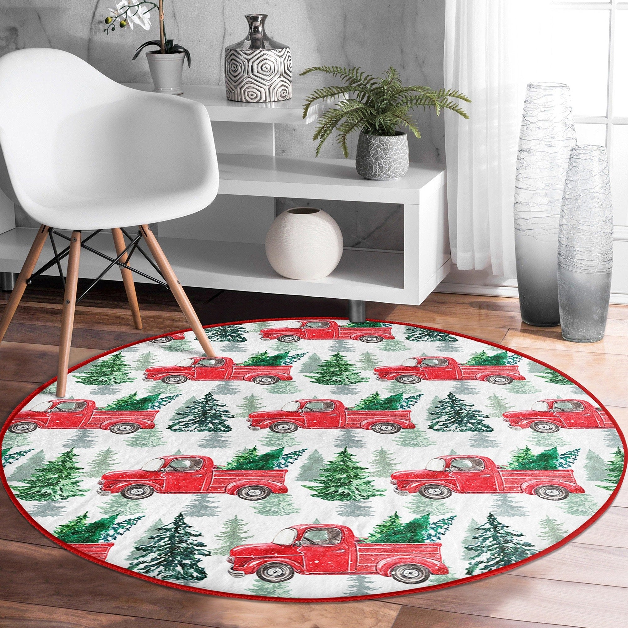 These elegant round floor rugs with Red Truck and Pine Tree prints;