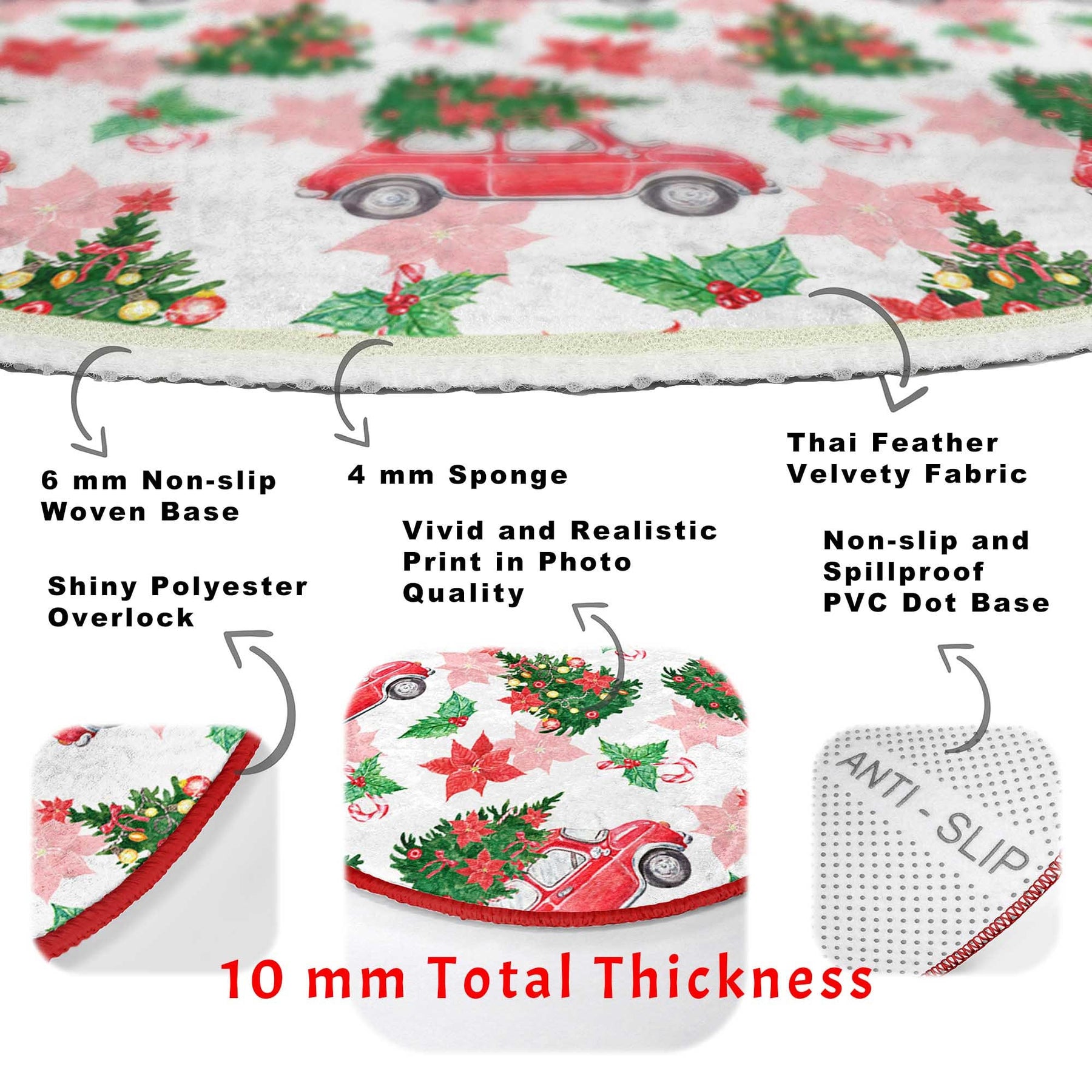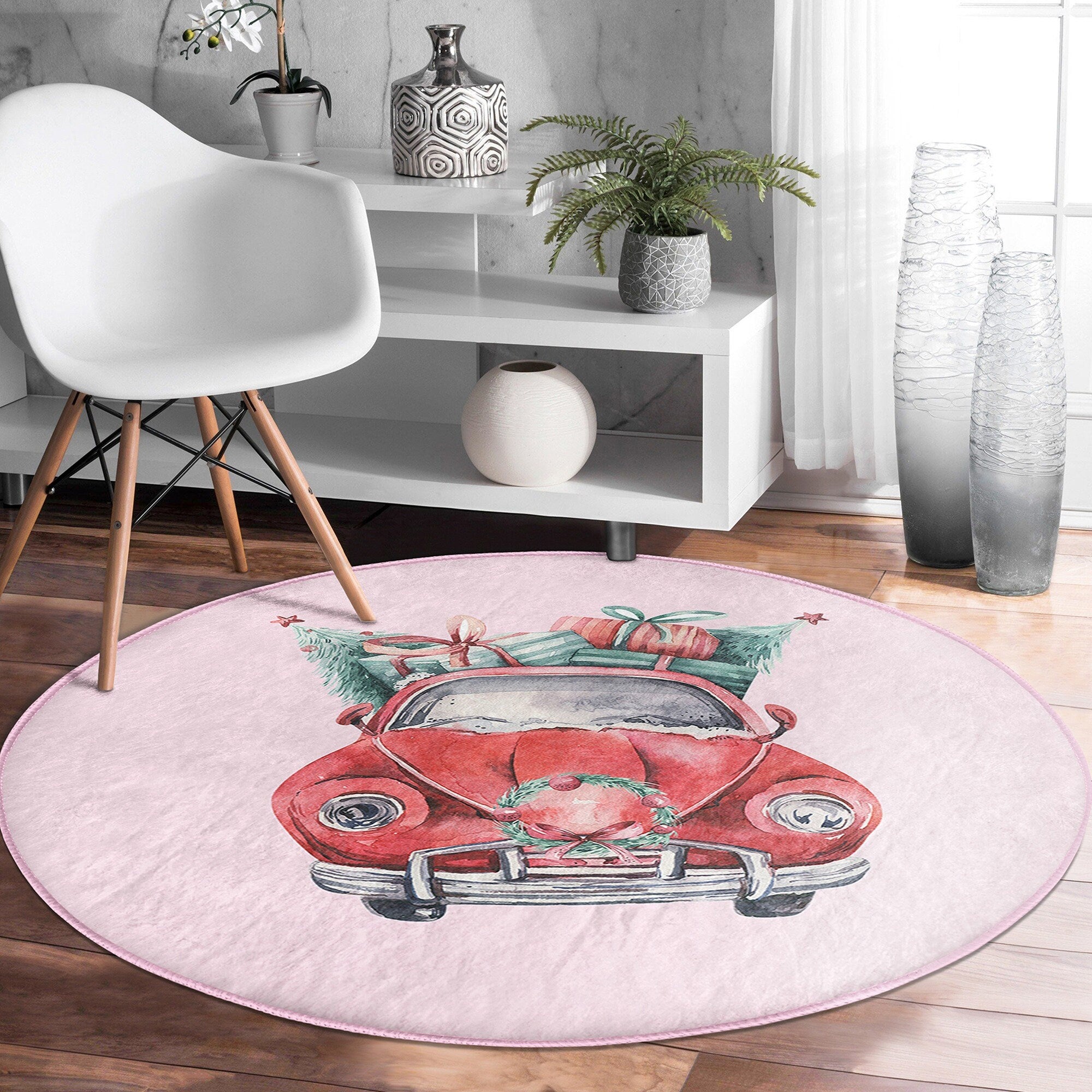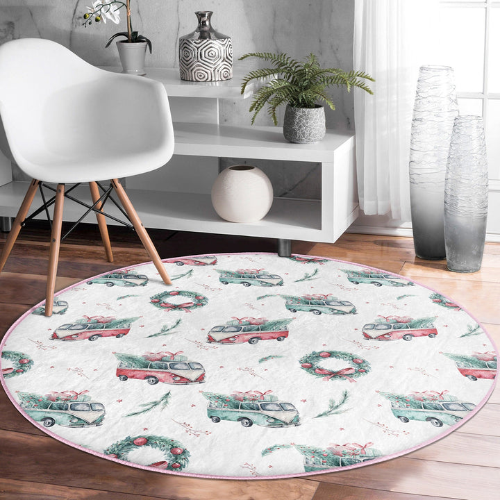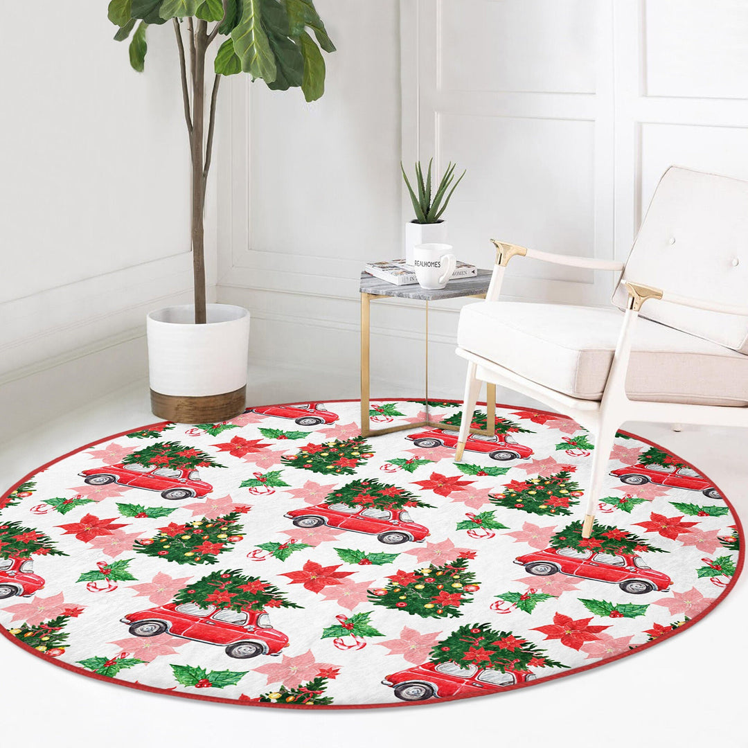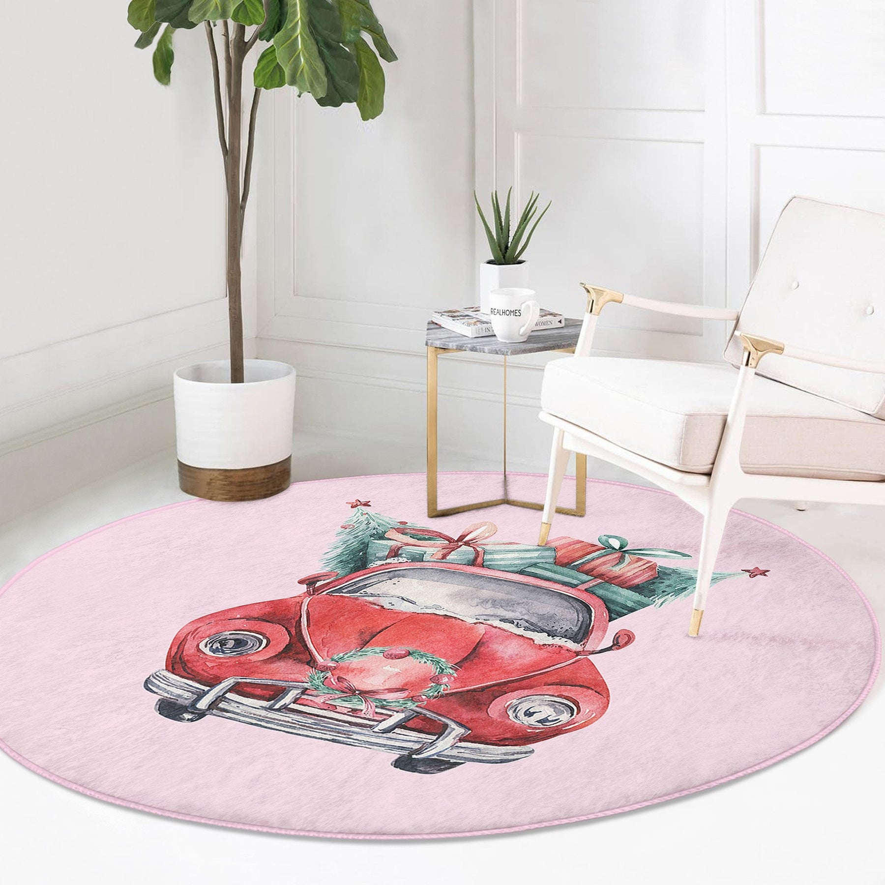These elegant round floor rugs with Red Truck and Pine Tree prints;
