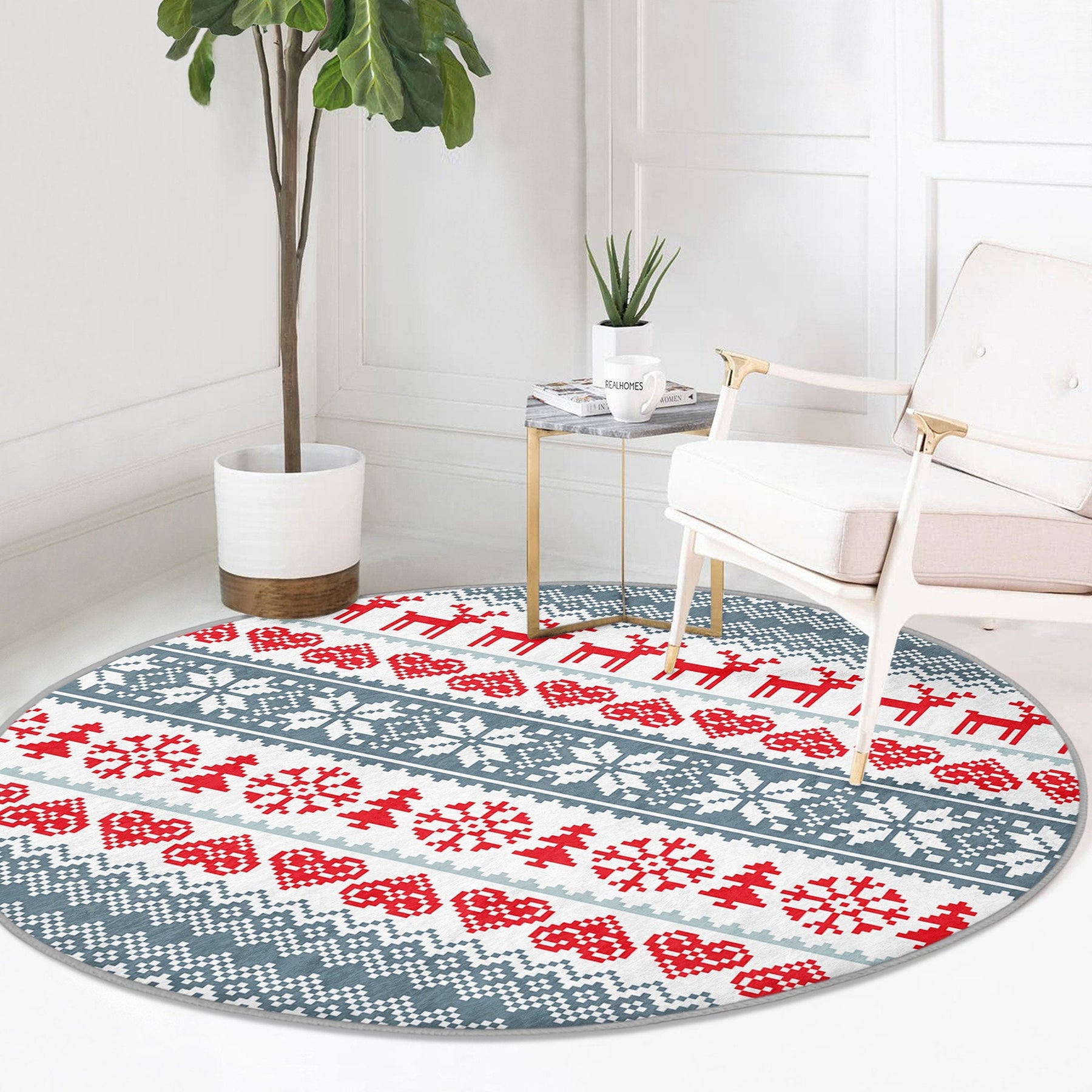 These elegant round floor rugs with Merry Xmas, Pine Tree, Xmas Deer and Snowflake prints with pixel art;