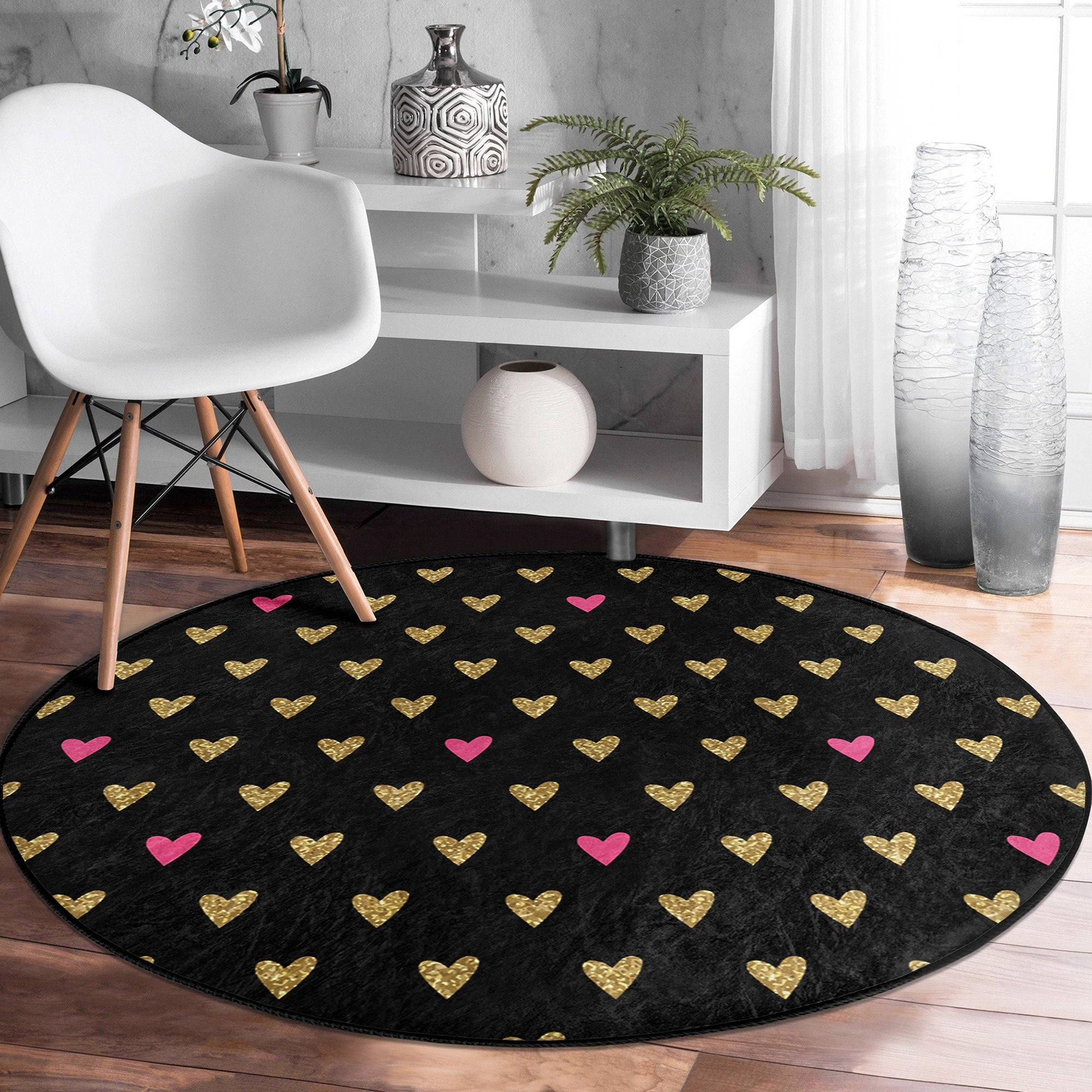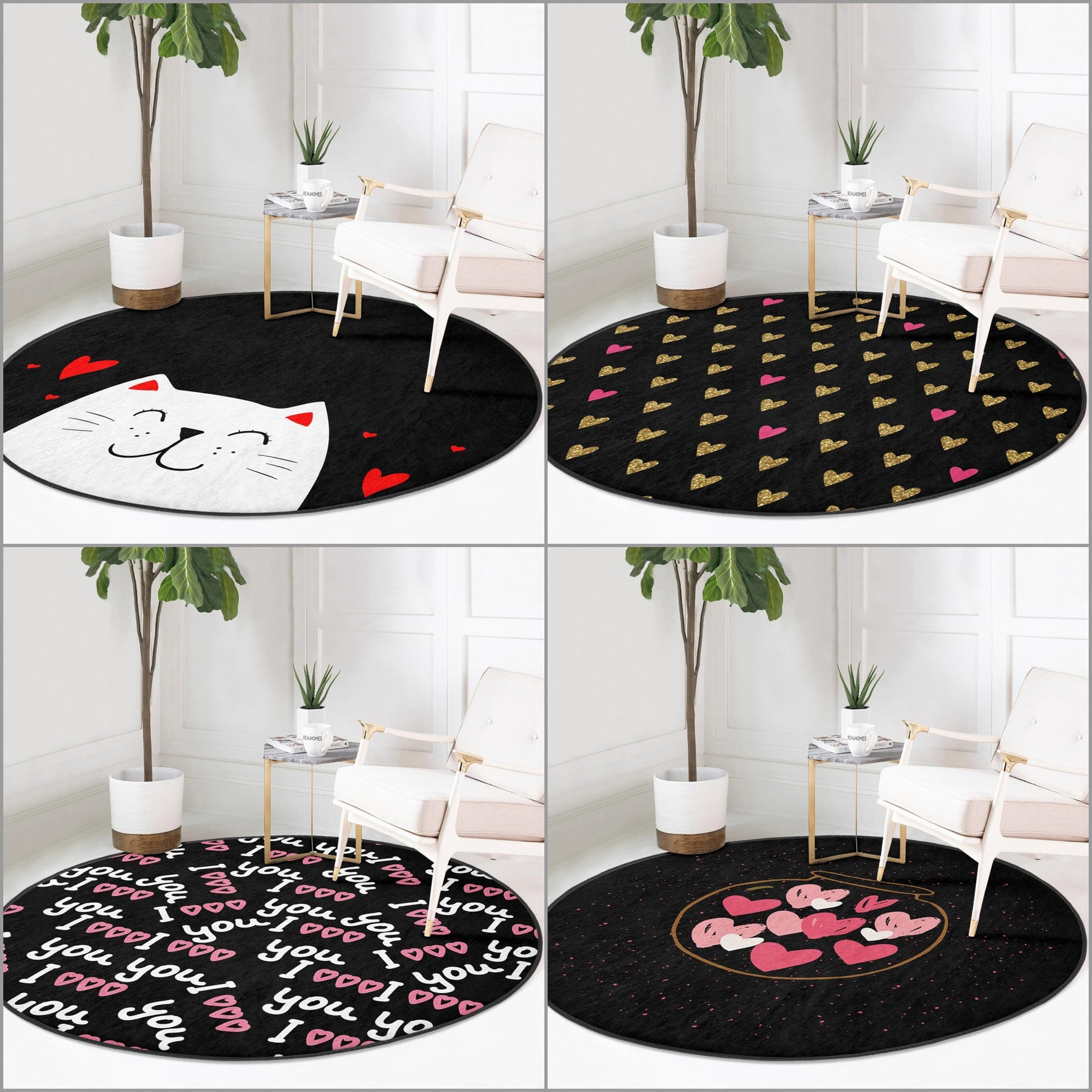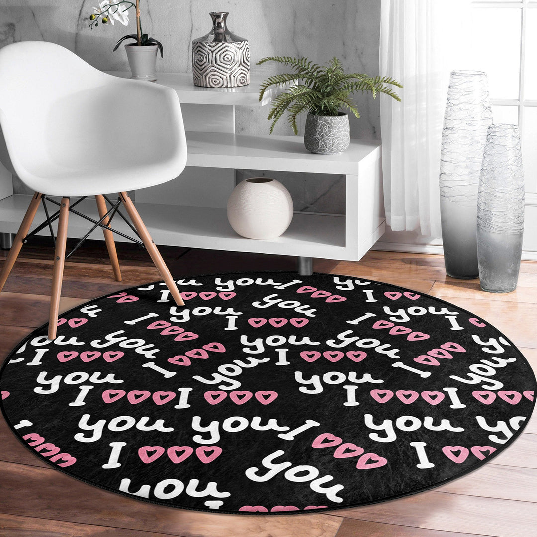 These elegant round floor rugs with I Love You, Heart and Cat prints;