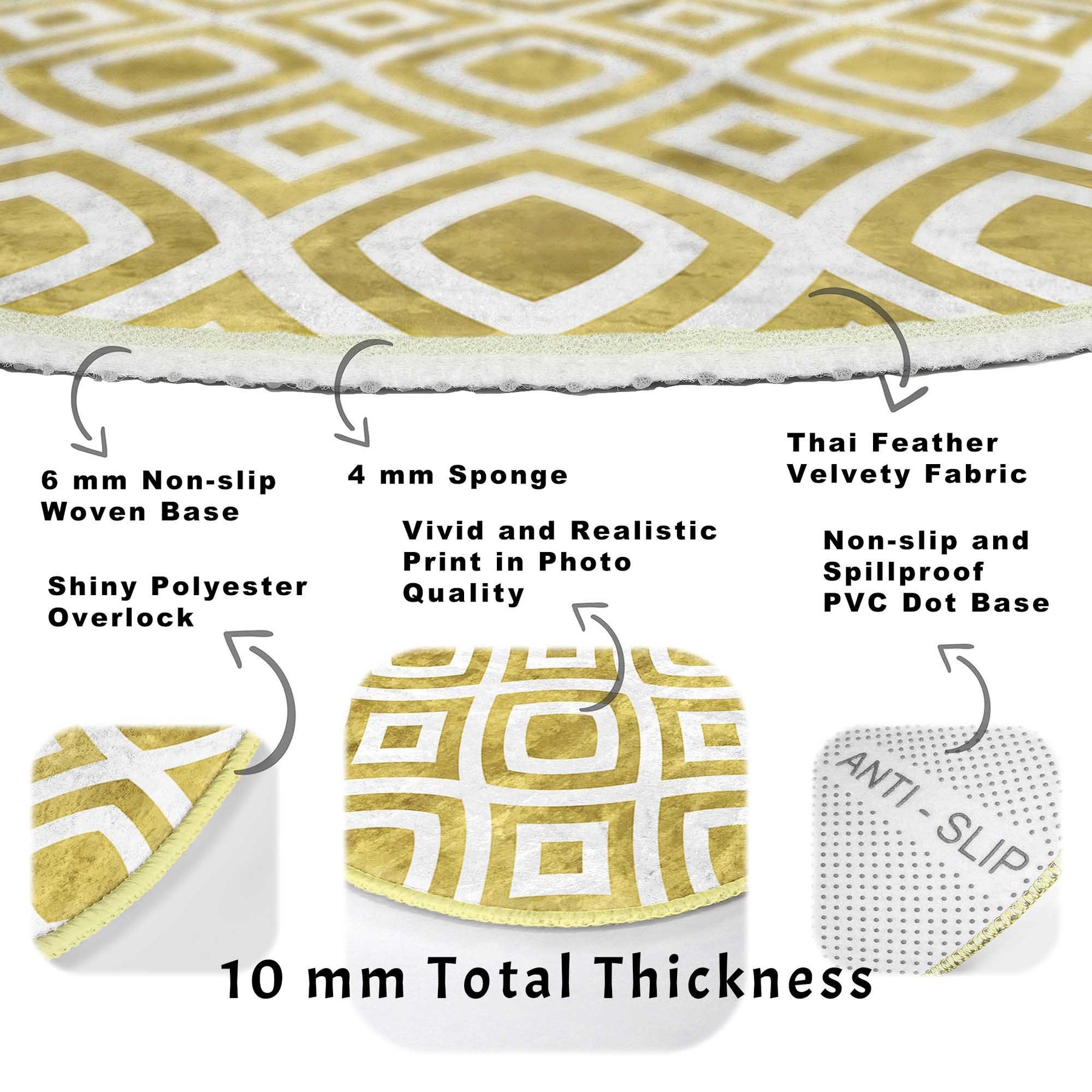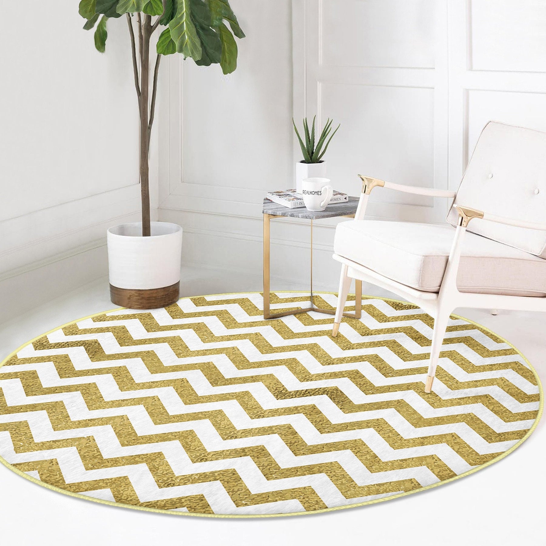 These elegant round floor rugs with gold beige and black geometric IKAT/Zigzag and seamless patterns;