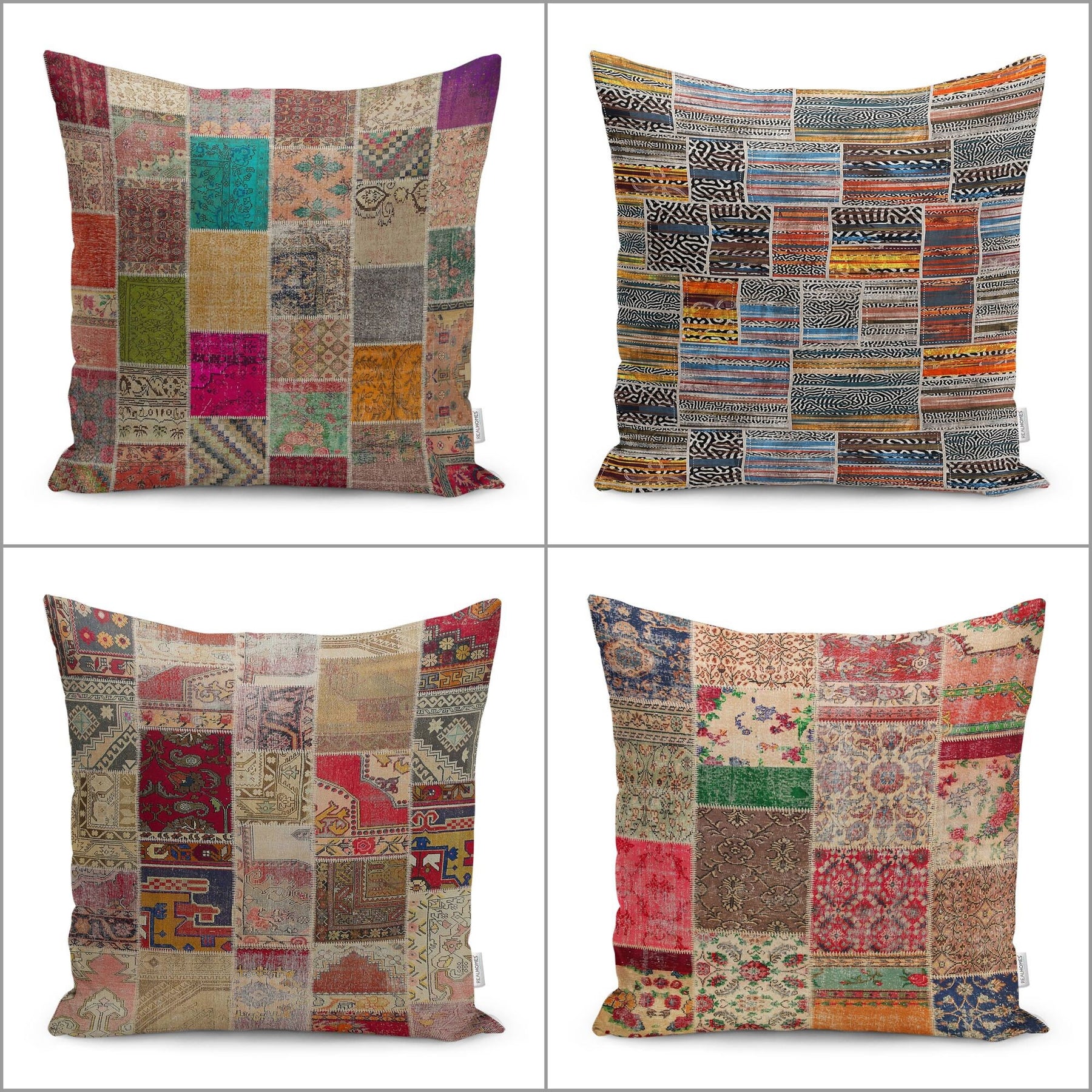 These elegant square decorative farmhouse throw pillow covers with patchwork style Turkish Kilim Pattern;