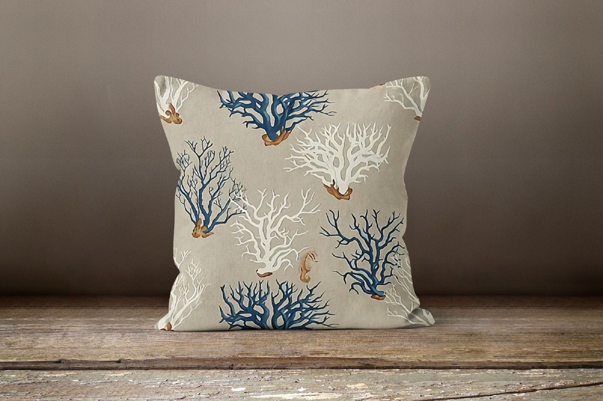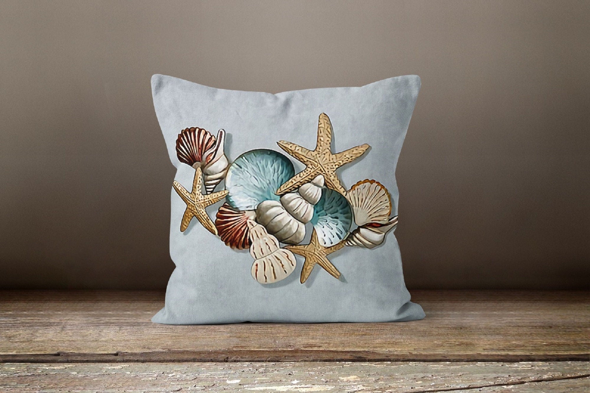 These square blue and gray decorative farmhouse/beach house throw pillow covers with starfish, seashells and seaweed;
