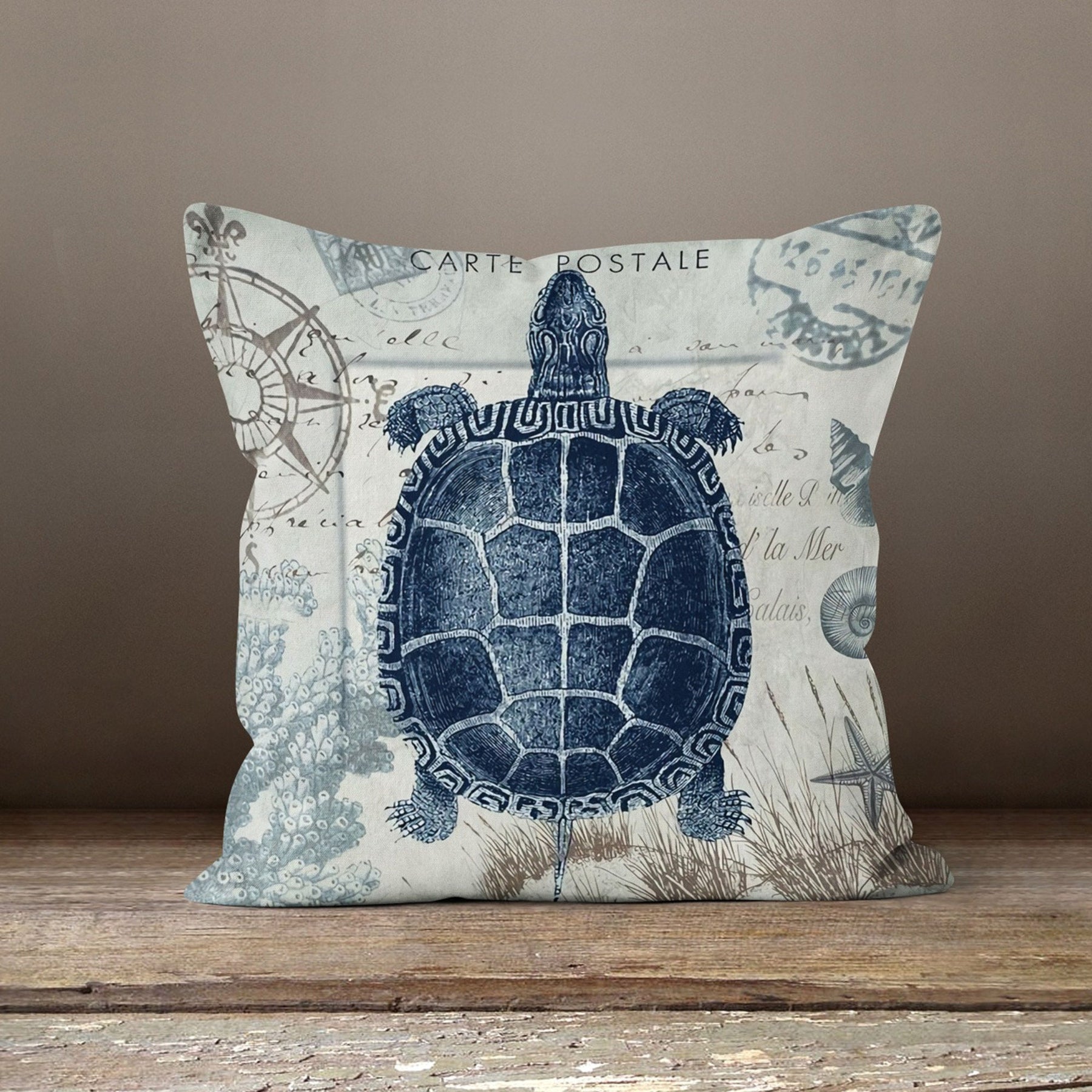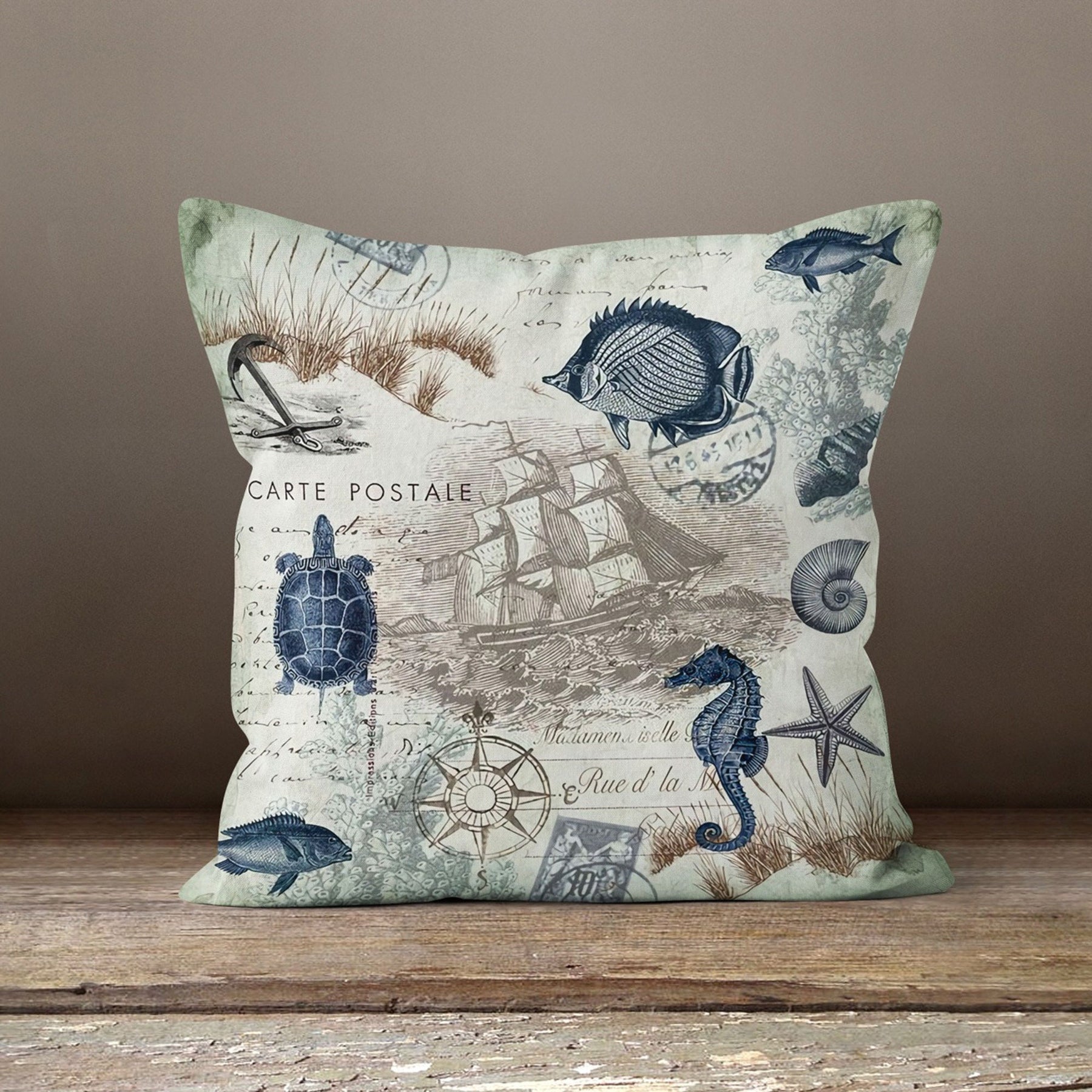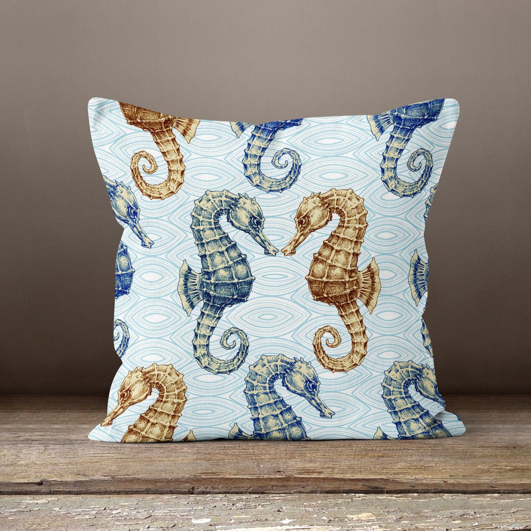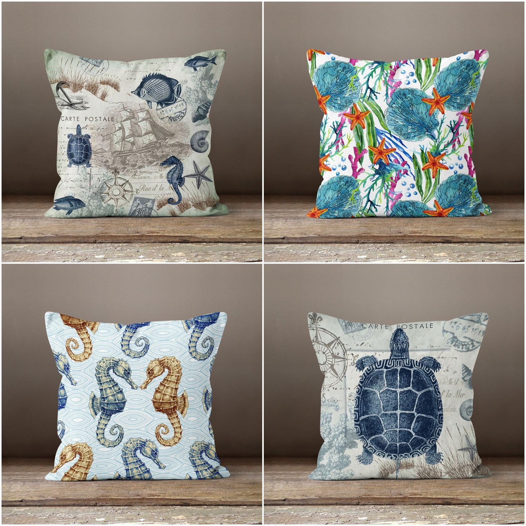 These square decorative beach house throw pillow covers with seahorse, sea turtle, starfish and fish print;