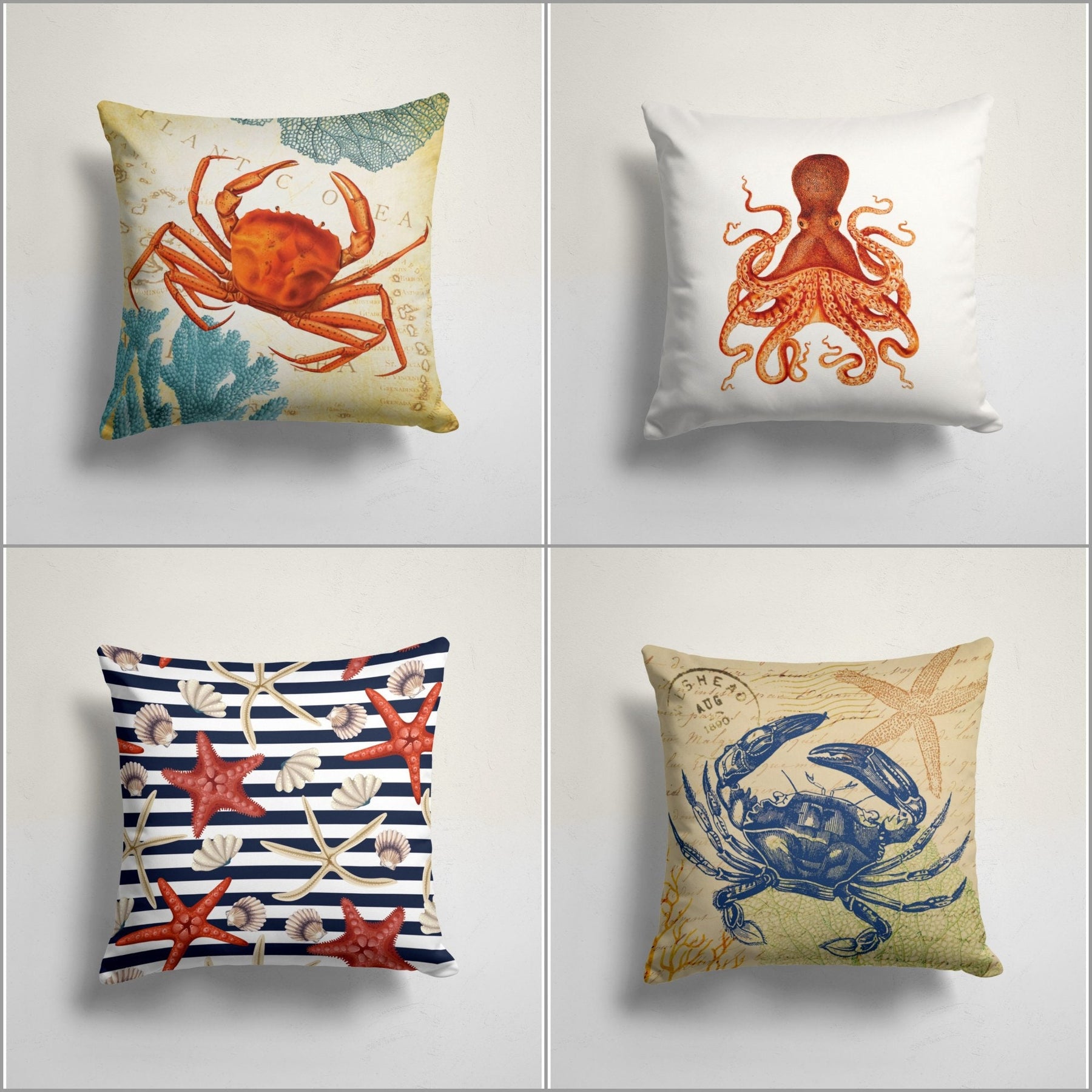These square blue and gray decorative beach house throw pillow covers with octopus, crab, starfish and seashell;