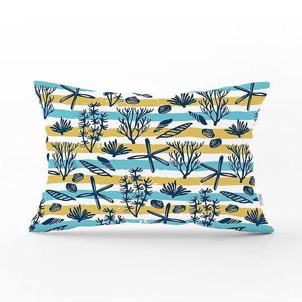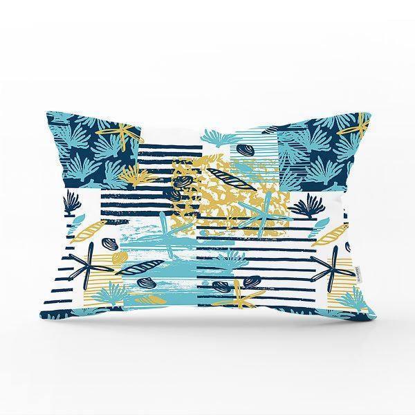 Beach House Pillow Cover|Rectangle Coastal Cushion Case|Decorative Sea Creatures Pillow|Turquoise Seahorse Oyster Seashell and Coral Pillow