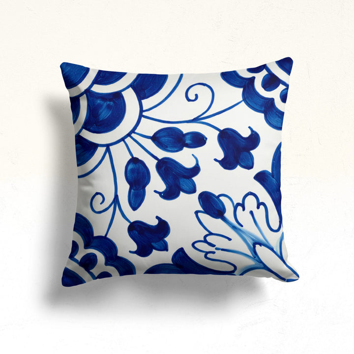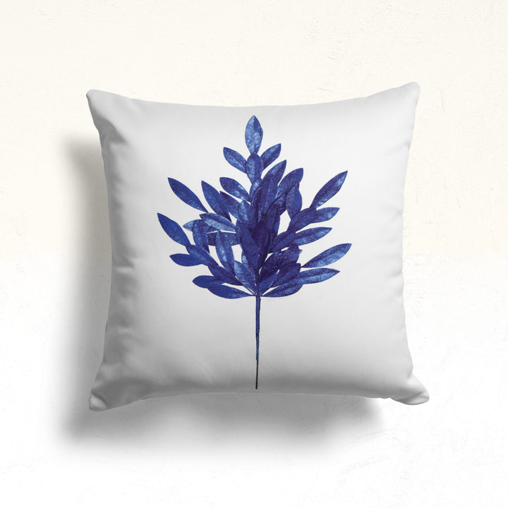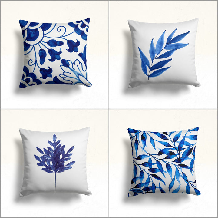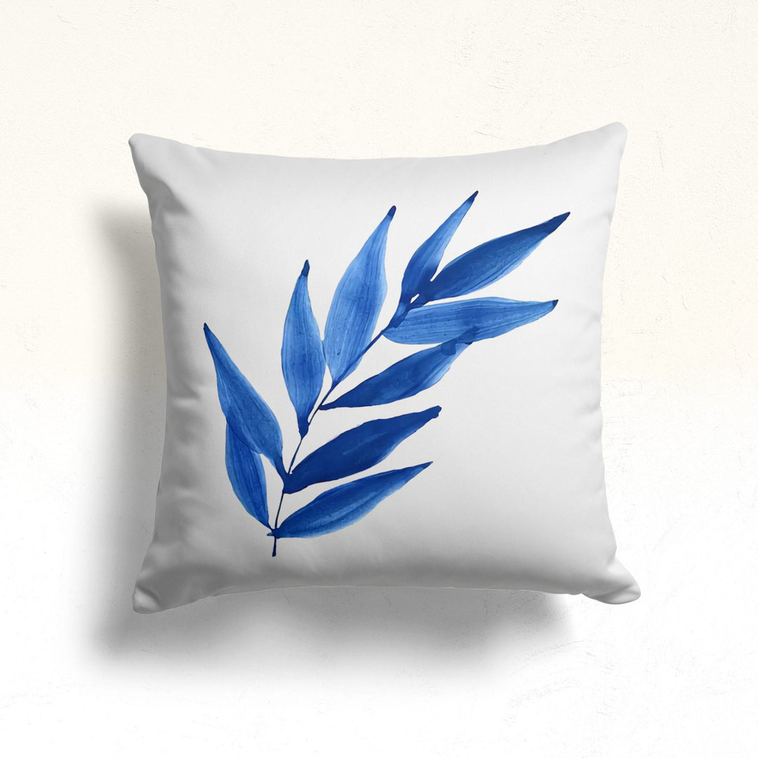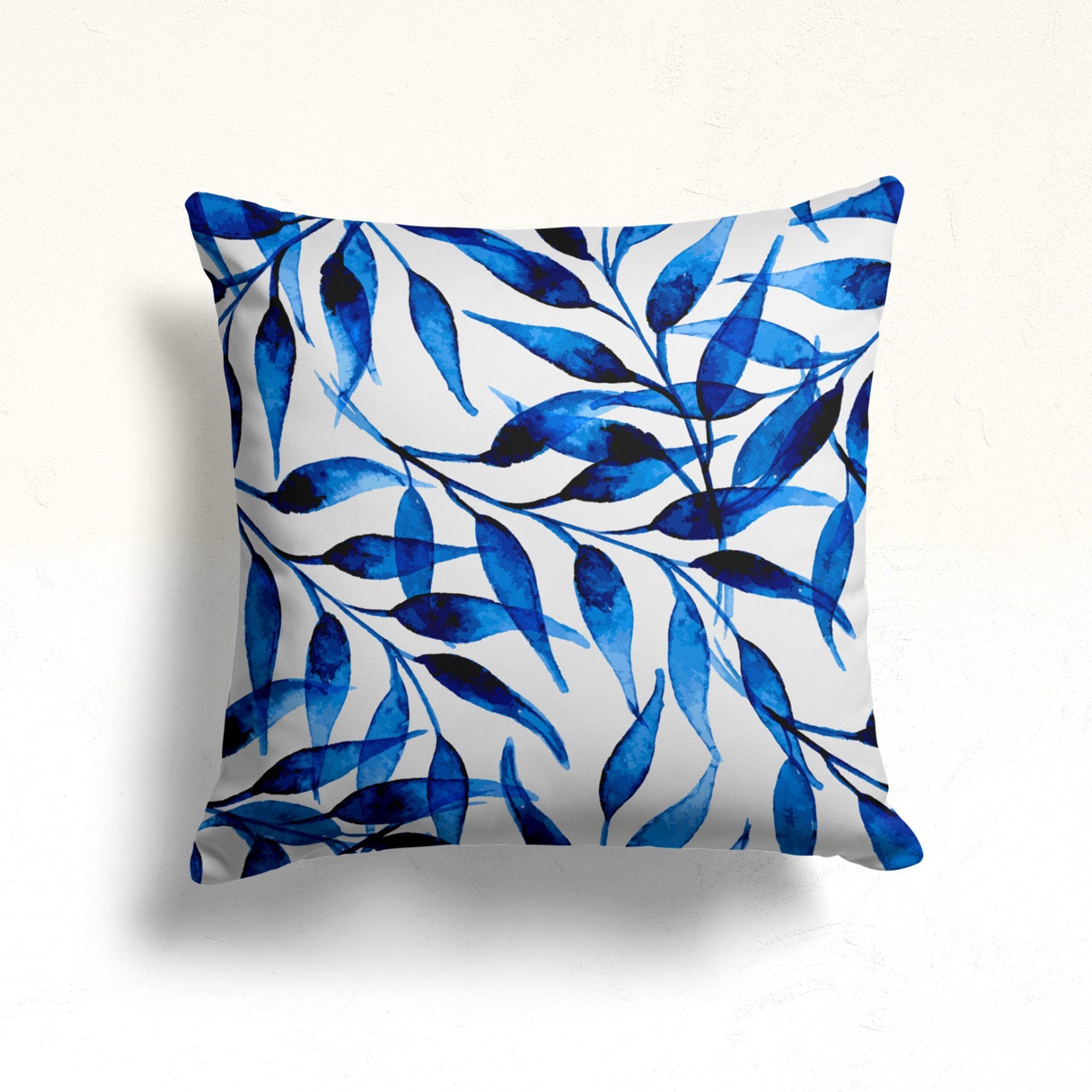 These elegant square decorative throw pillow covers with blue leaf prints;