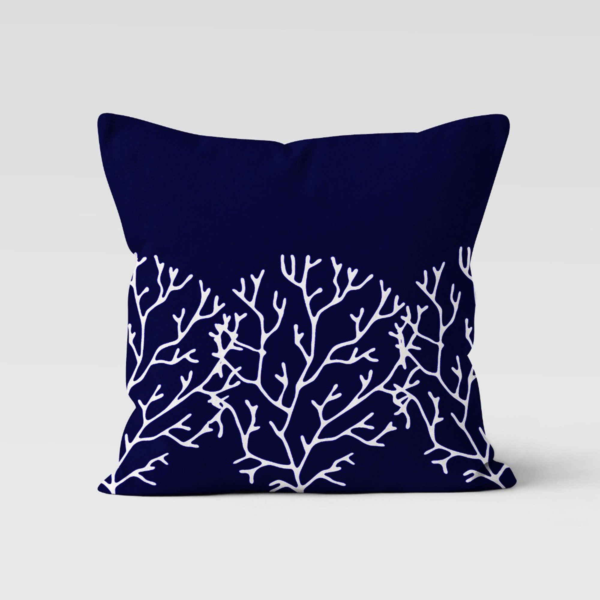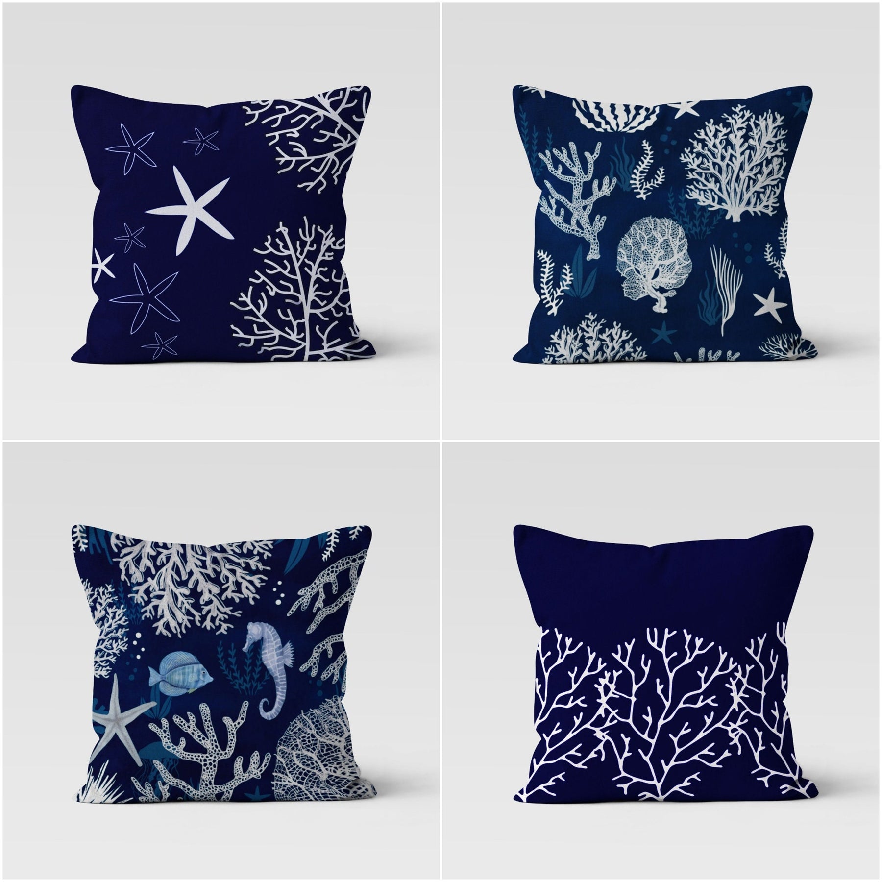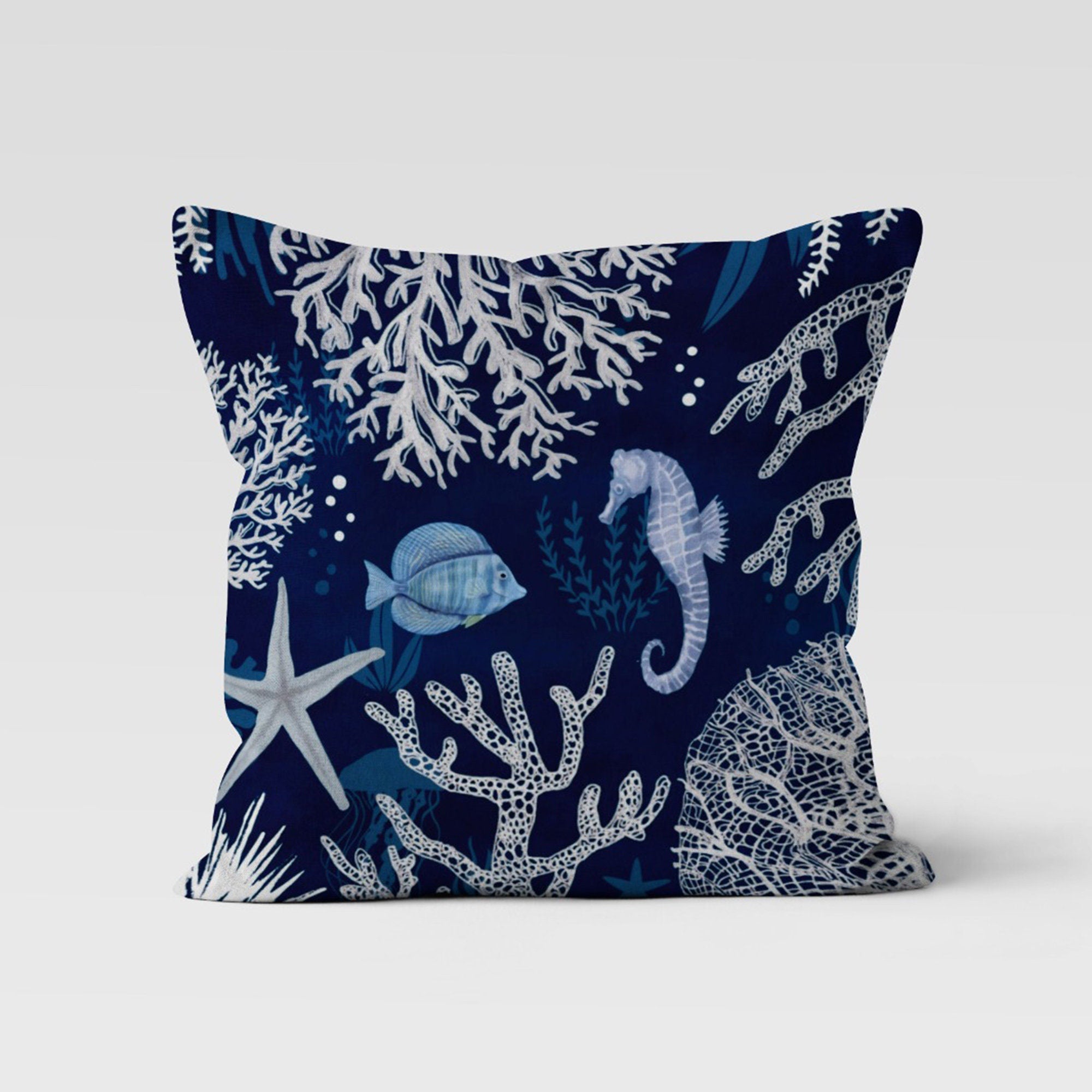 These square blue and white decorative beach house throw pillow covers with coral, starfish, seahorse and fish;