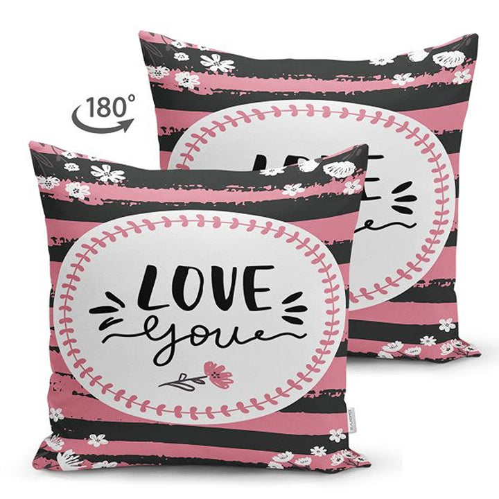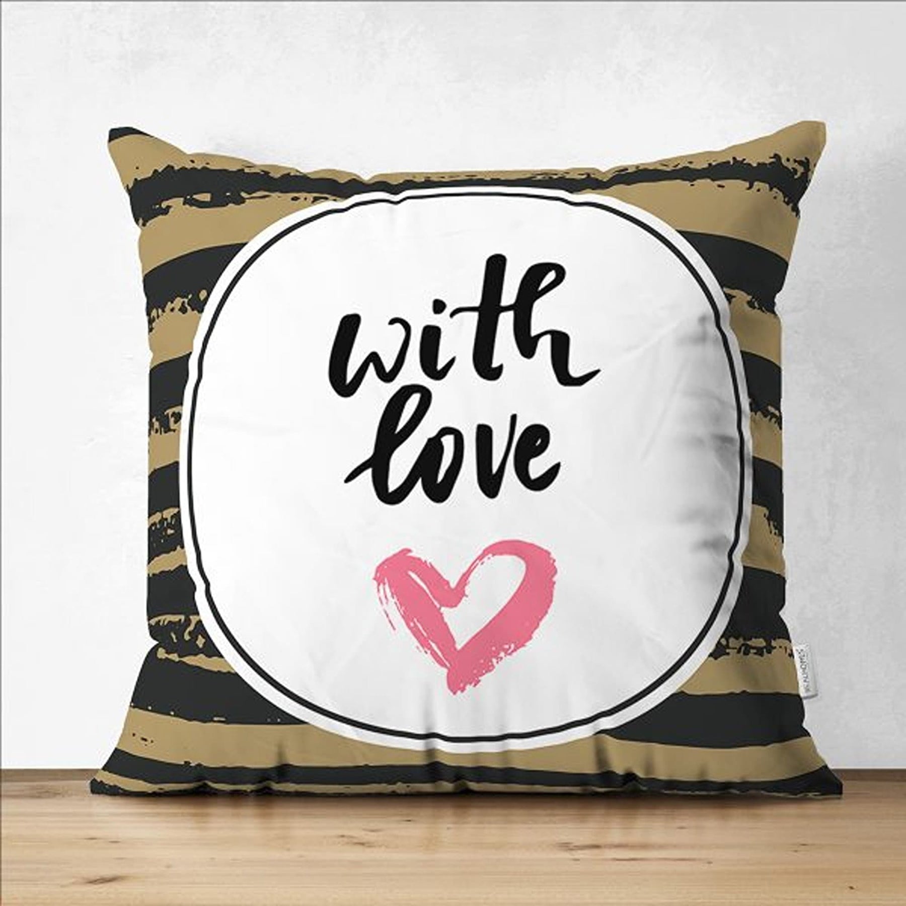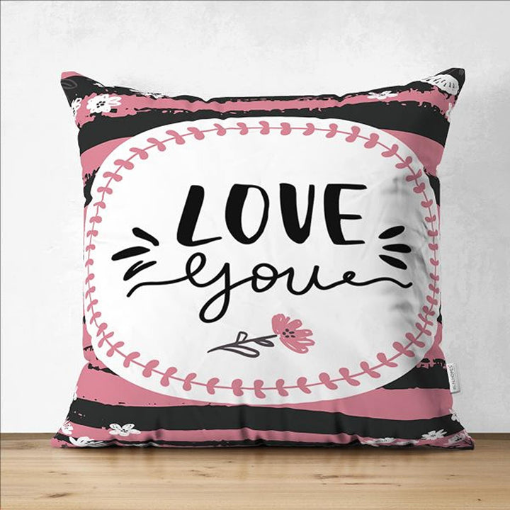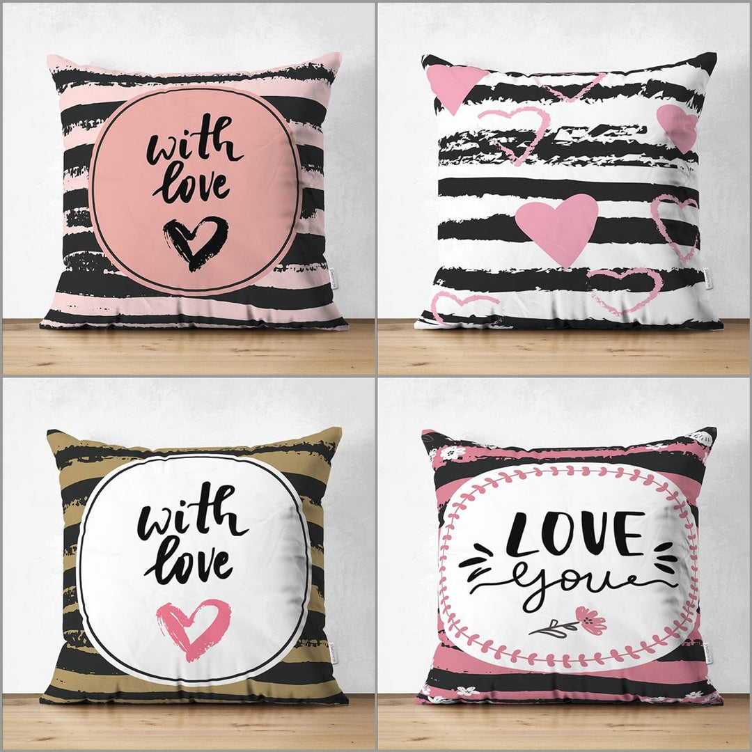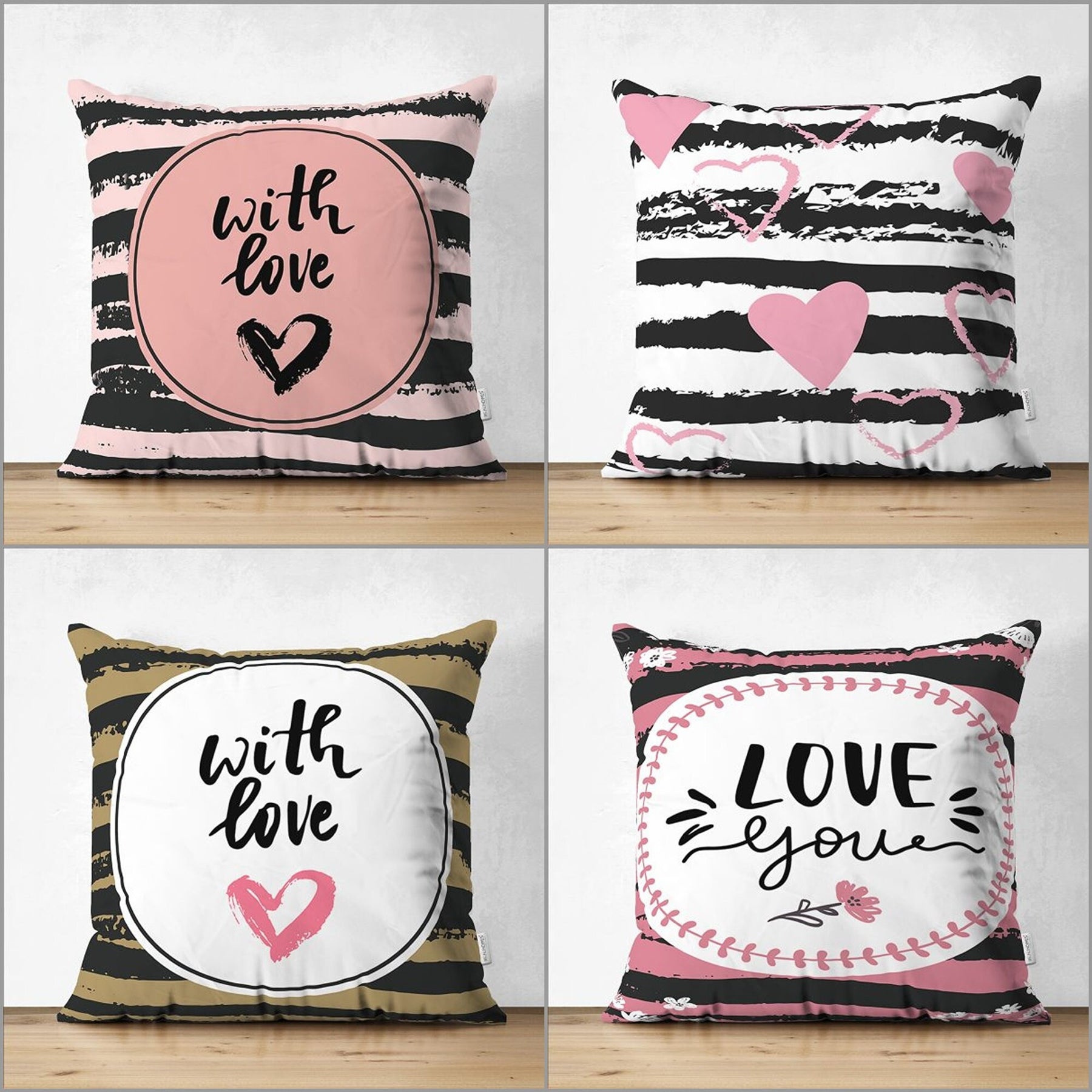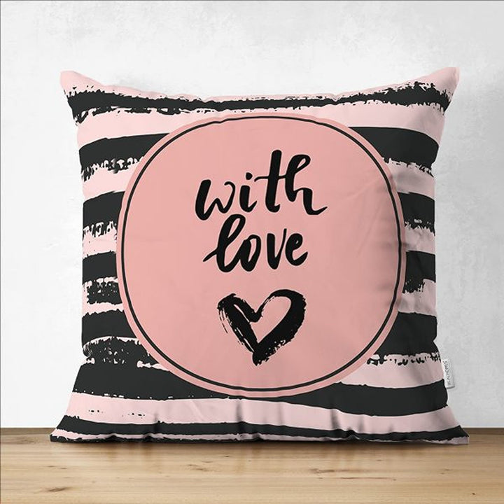 These elegant square decorative pillow covers with With Love, Love You and Heart prints with stripes;