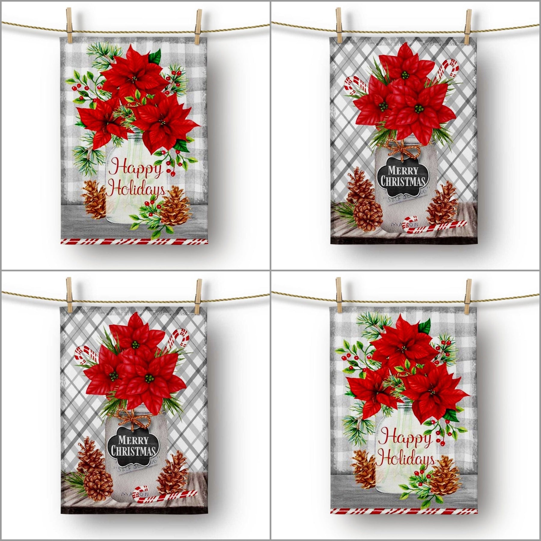 These elegant decorative rectangle kitchen/dish/hand/tea towels with Merry Xmas, Happy Holidays, Red Poinsettia print;