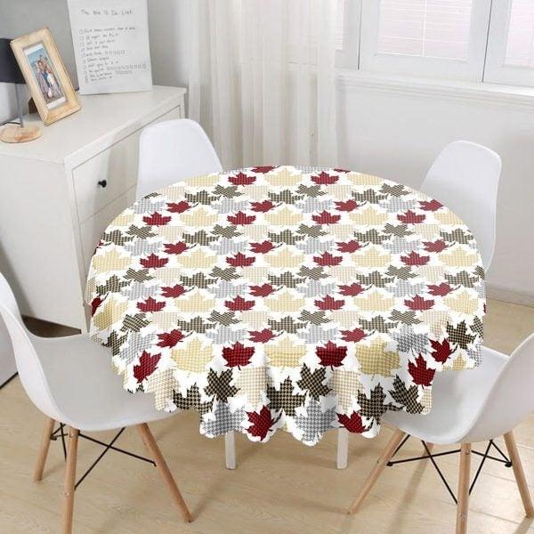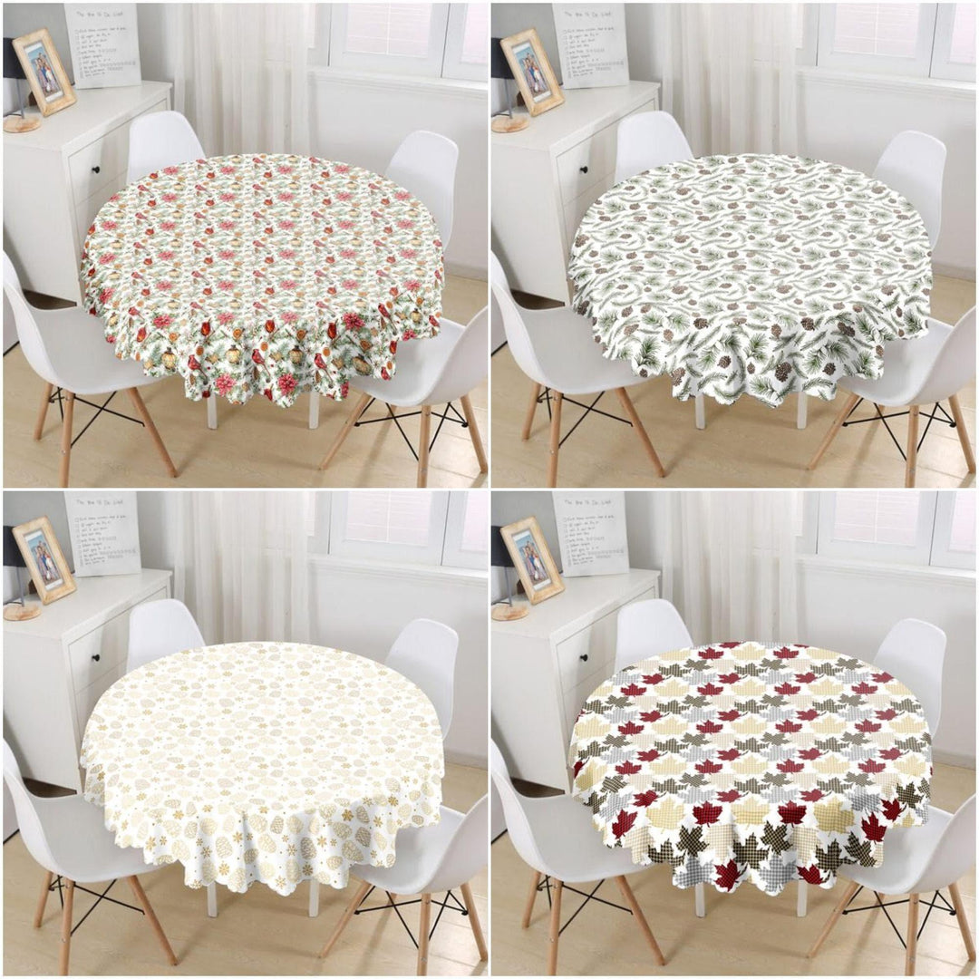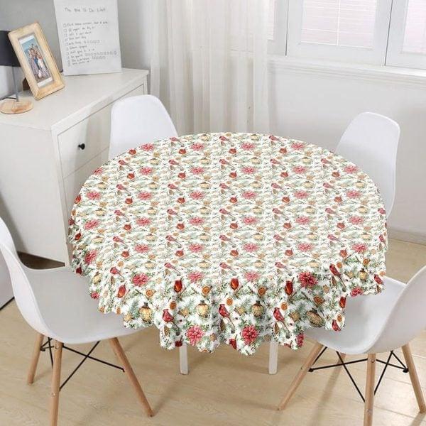 This high quality farmhouse style round tablecloth with floral cardinal bird, pine cone, checkered leaves and pine tree needles;