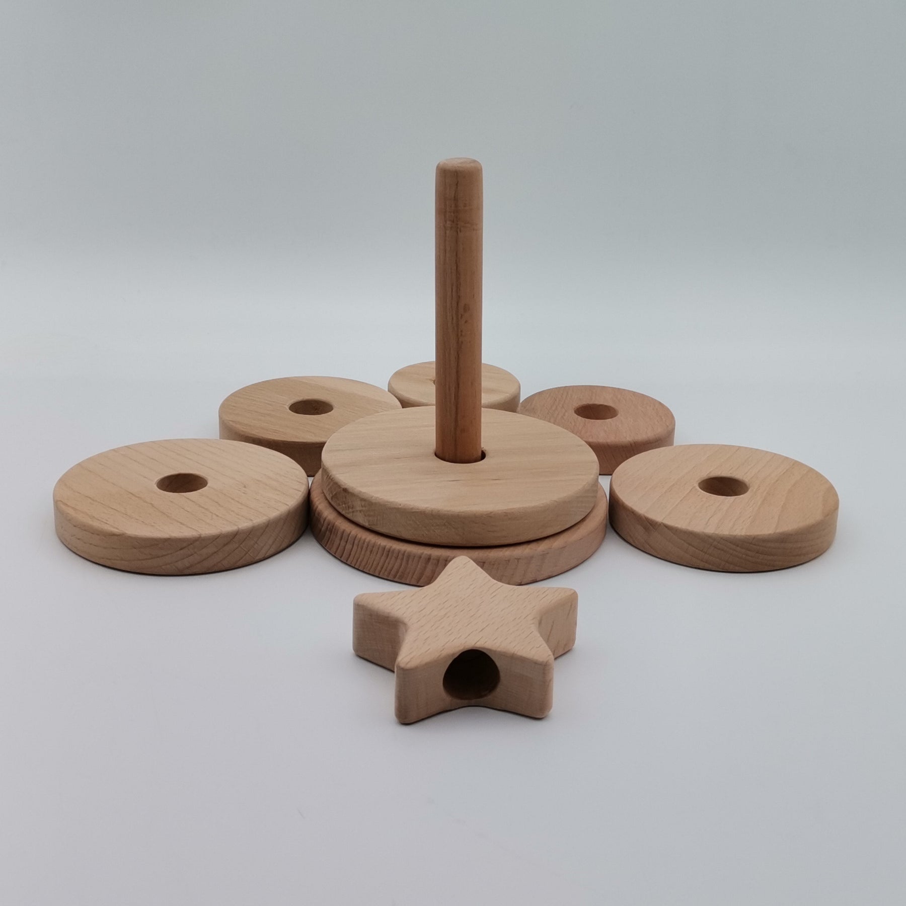 Imagine this natural toy, made of 100% beech wood "Wooden Sorting and Stacking Tower with Star" in your kids' room to see your kids' happiness while playing with it ! Perfect natural and eco-friendly educational pyramid toy for toddlers and kids.