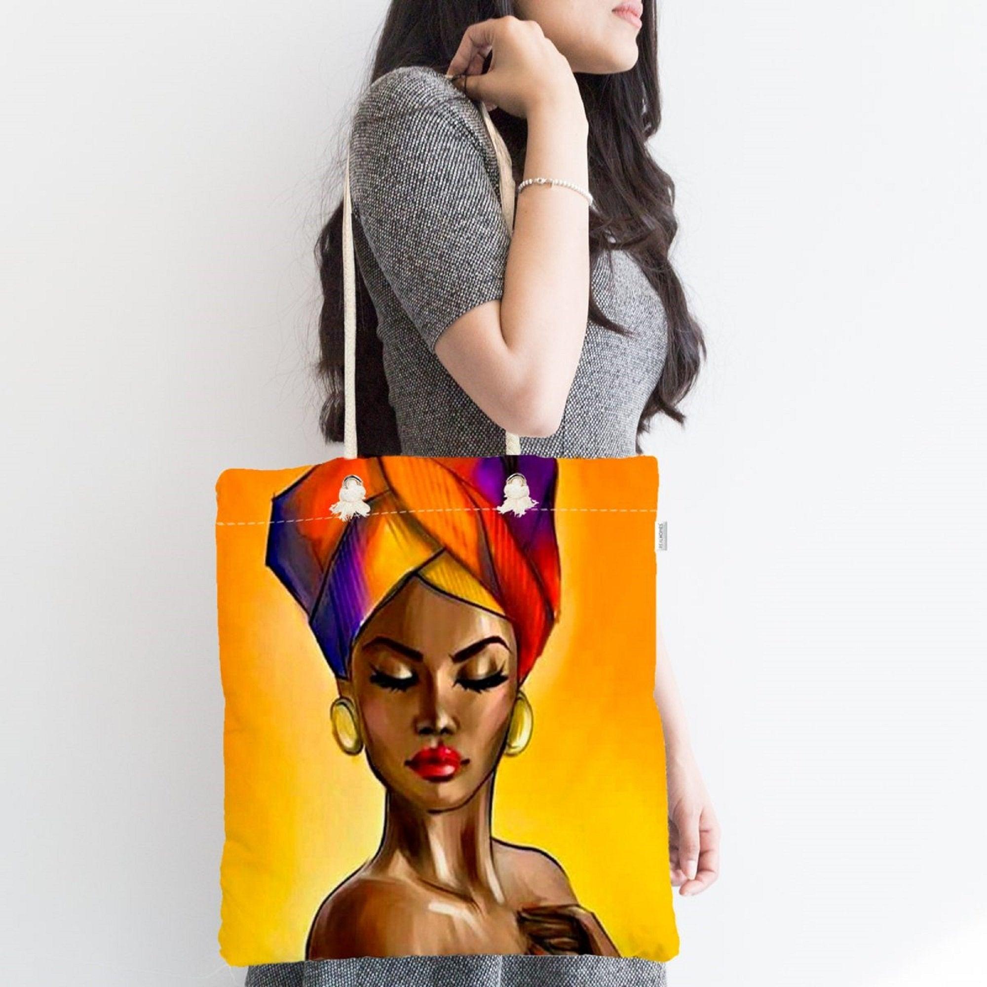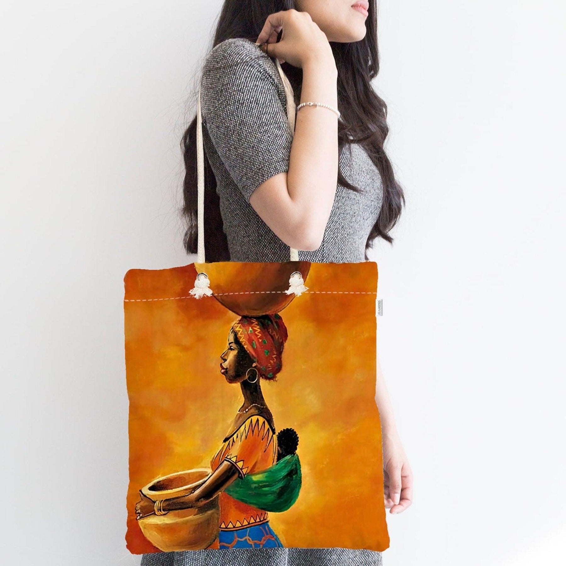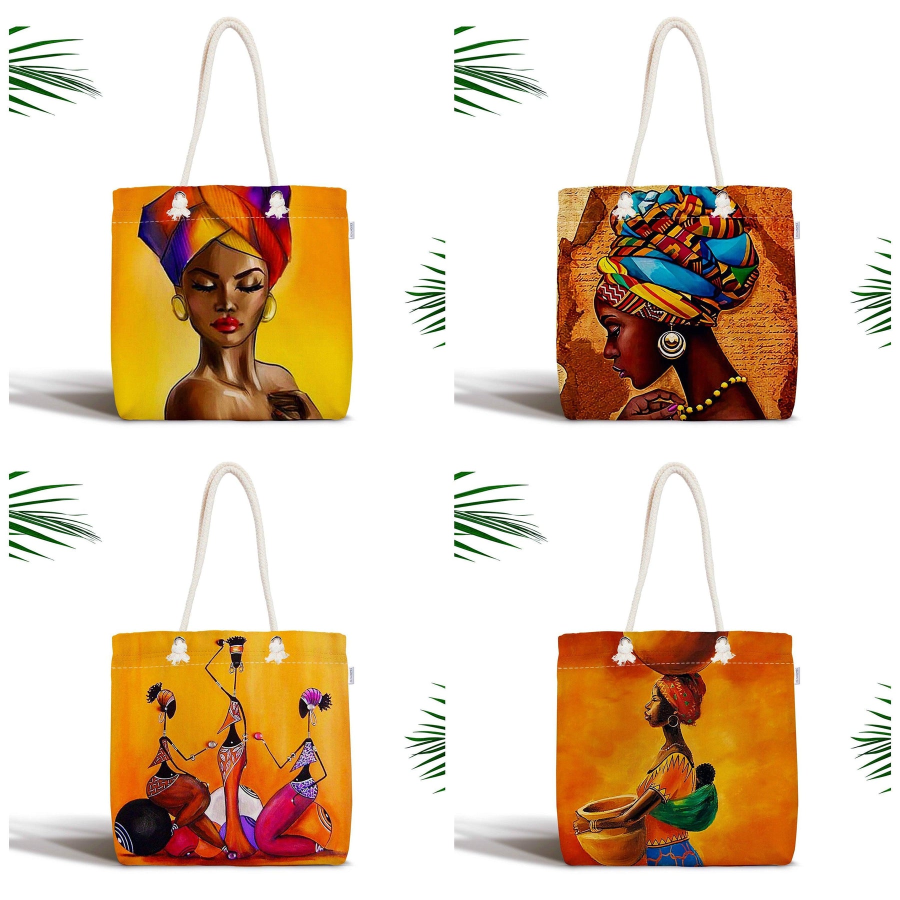 African Girl Fabric Bag|Fabric Shoulder Bag|Bohemian African Girl Beach Tote Bag|Digital Print Shopping Tote Bag for Women|Picnic Bag