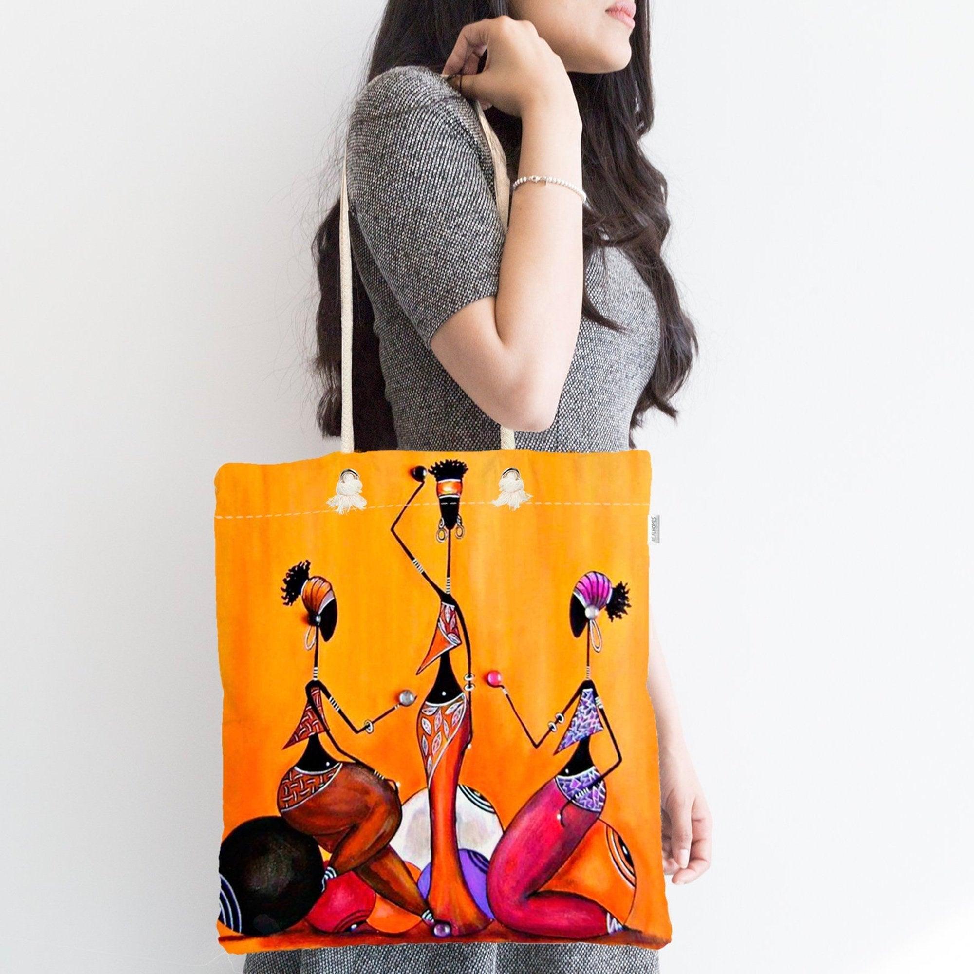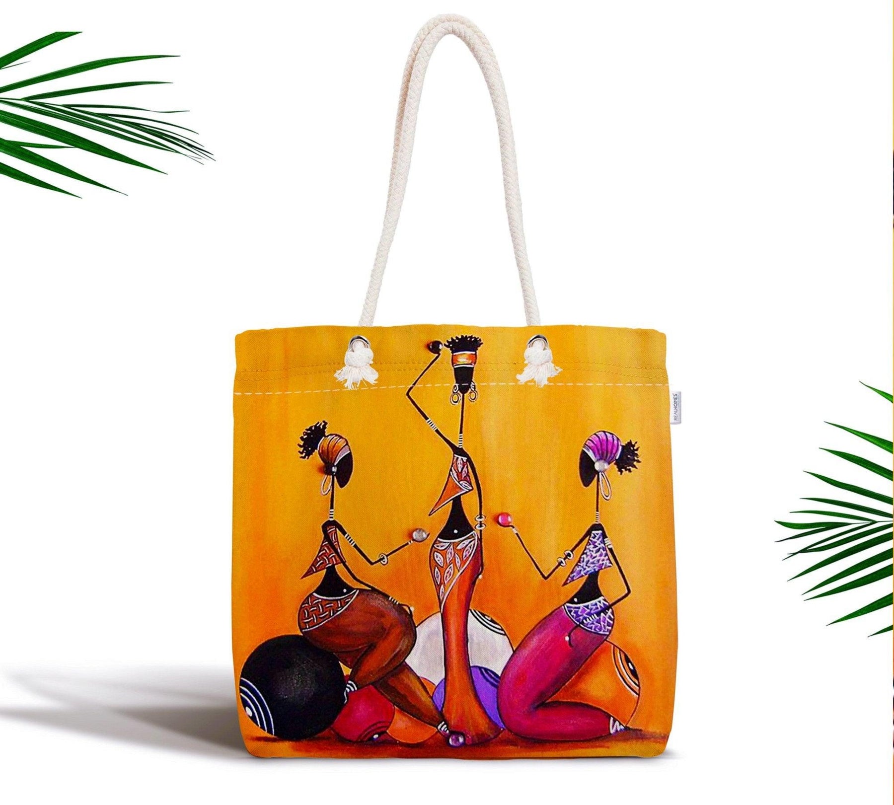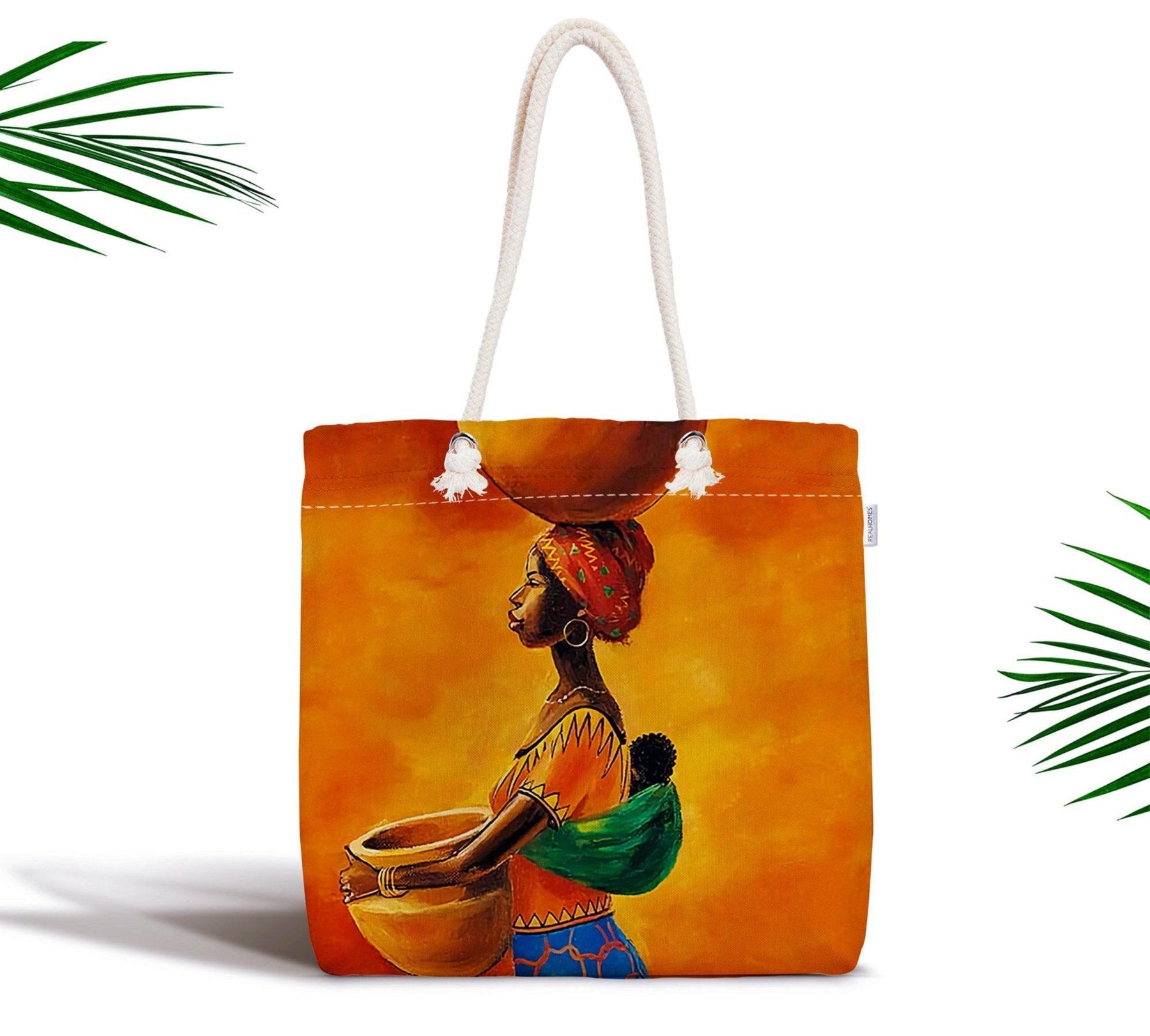 African Girl Fabric Bag|Fabric Shoulder Bag|Bohemian African Girl Beach Tote Bag|Digital Print Shopping Tote Bag for Women|Picnic Bag