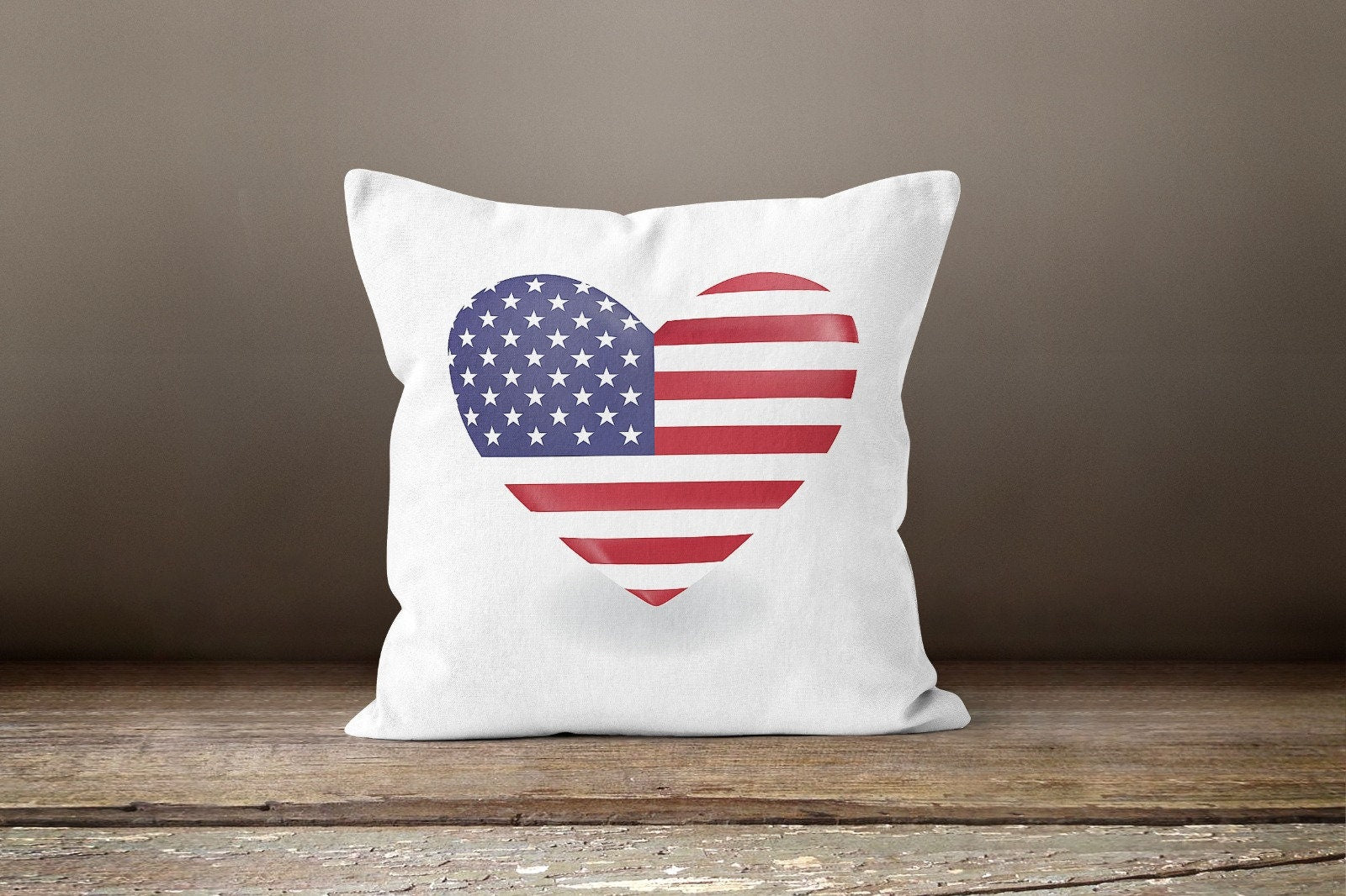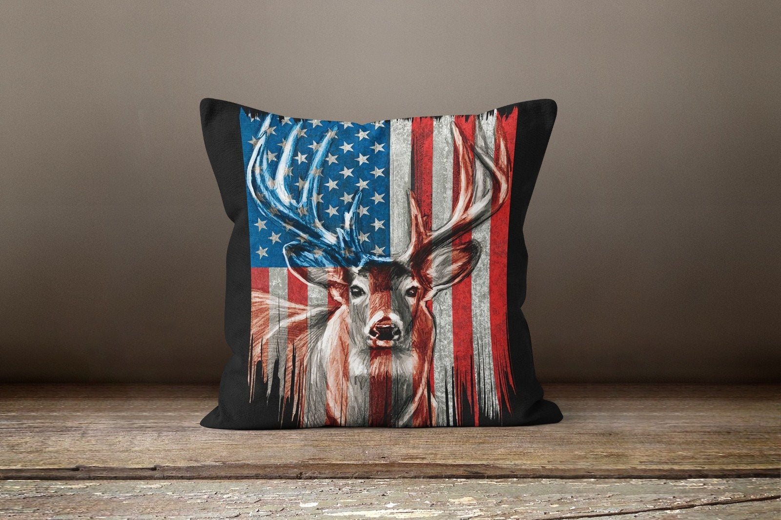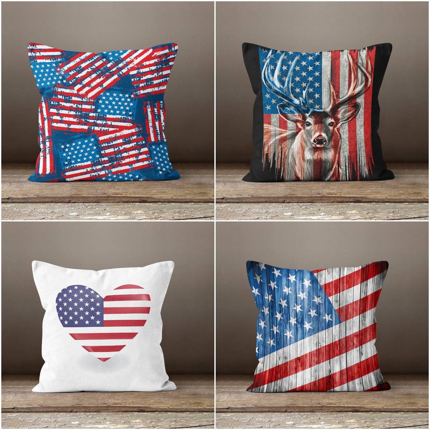 These elegant square decorative rustic farmhouse style vintage throw cushion covers with USA flags and heart design, flag with deer;