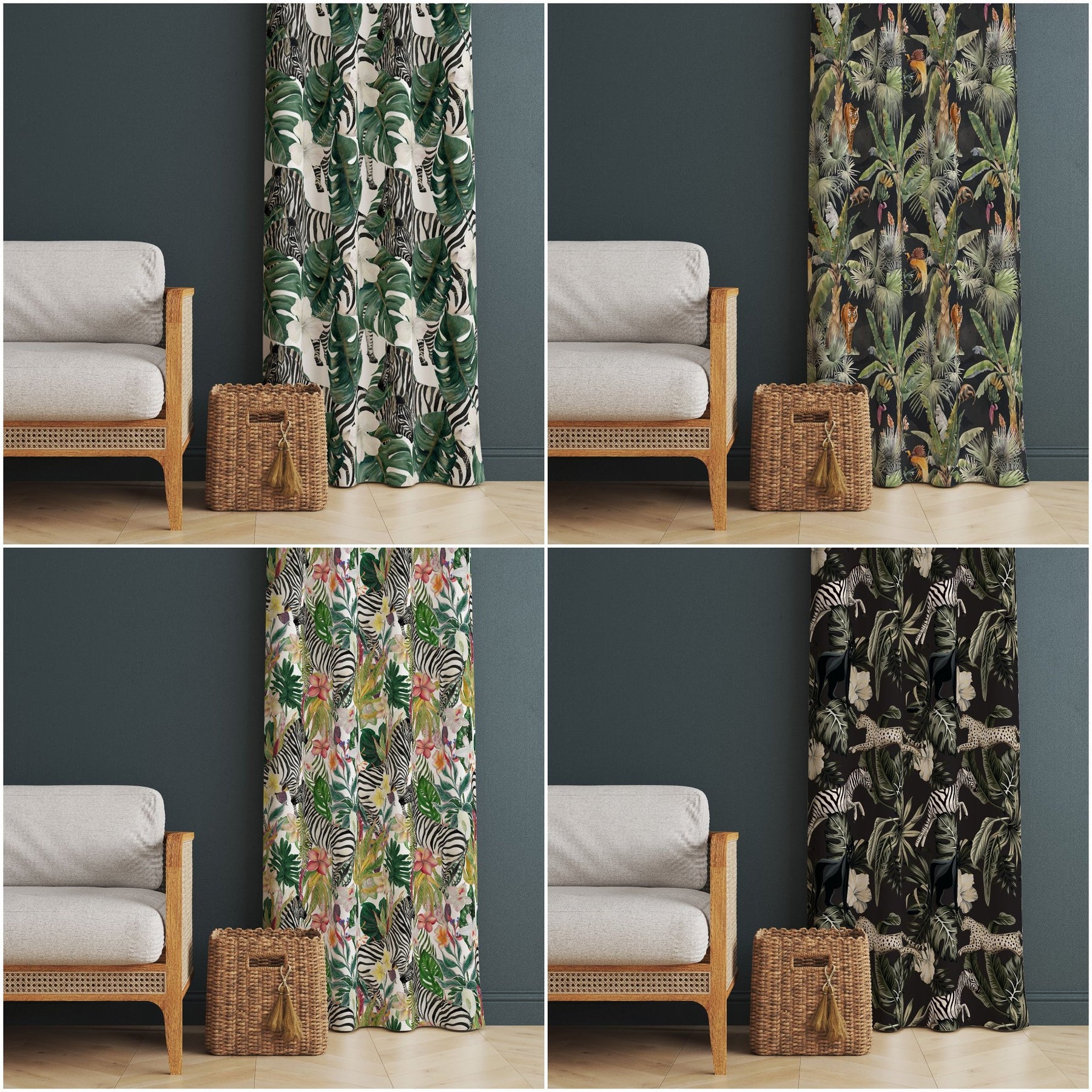 This high quality window curtain with tropical leaves, animals, zebra, tiger prints;