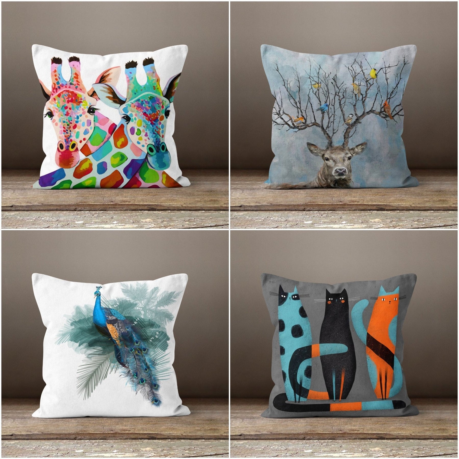 These elegant authentic square decorative farmhouse throw pillow covers with peacock, deer, cat and giraffe;