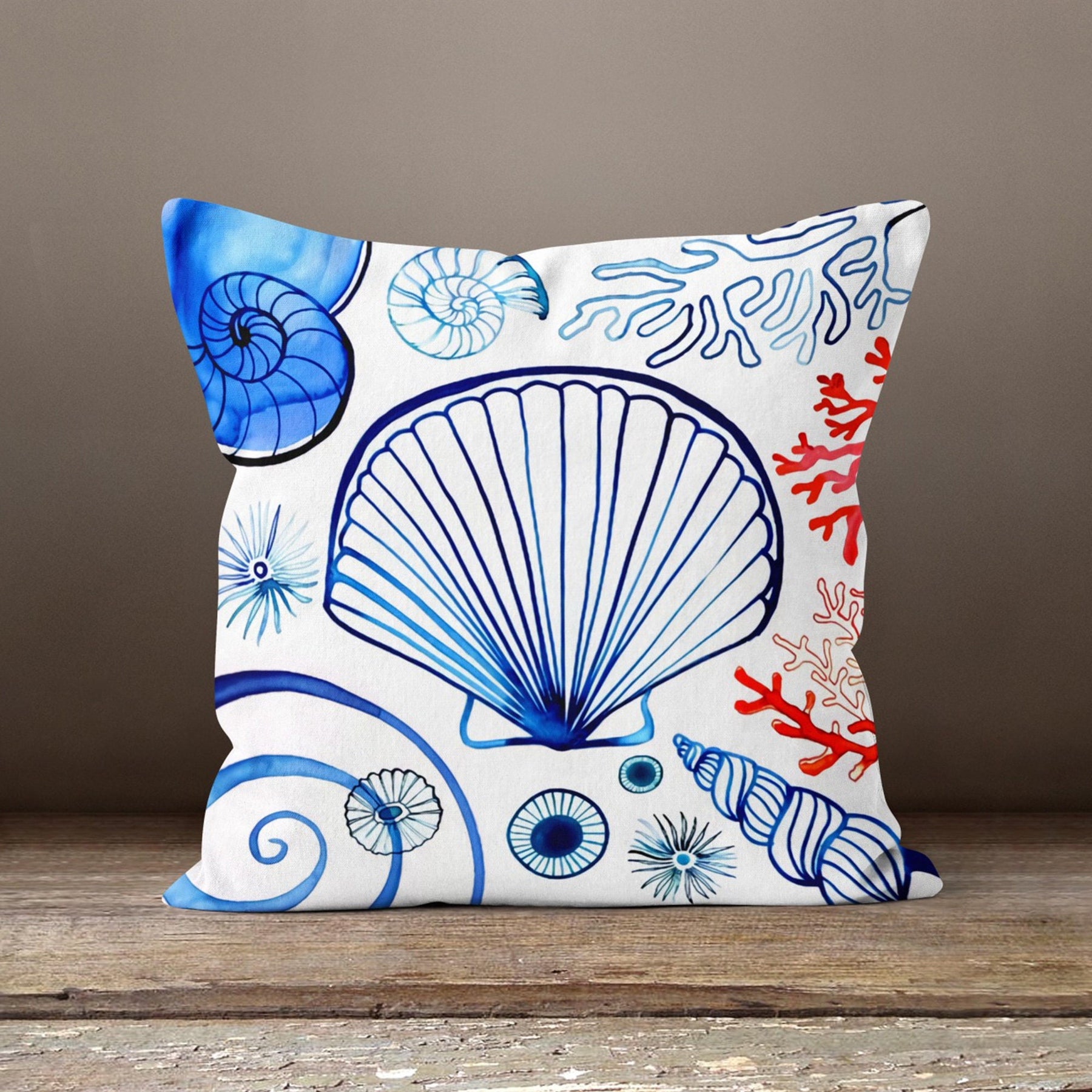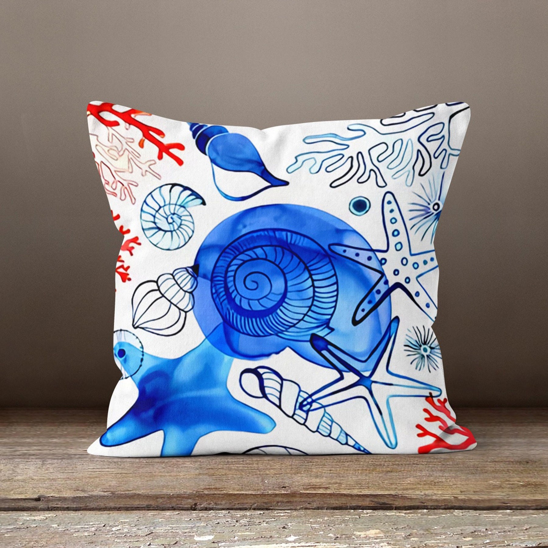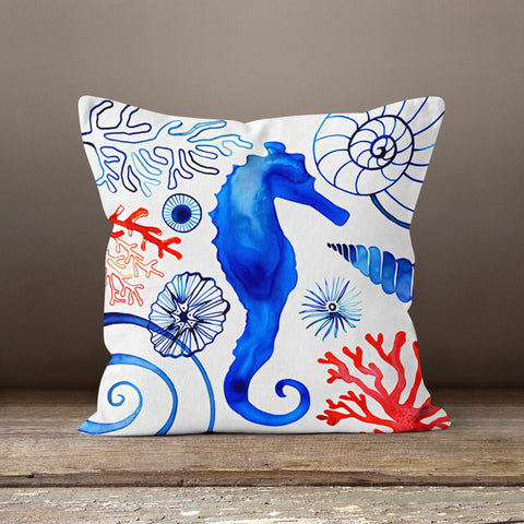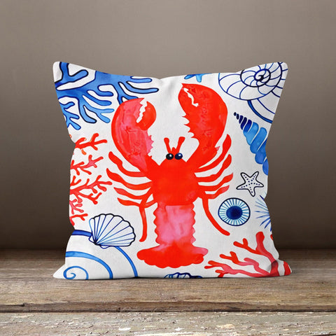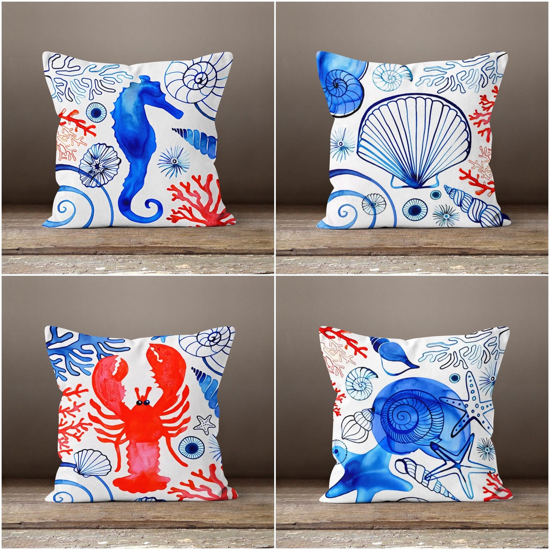 These square blue, red and white decorative beach house throw pillow covers with blue seahorse, seashell, red lobster, starfish, oyster and coral print;