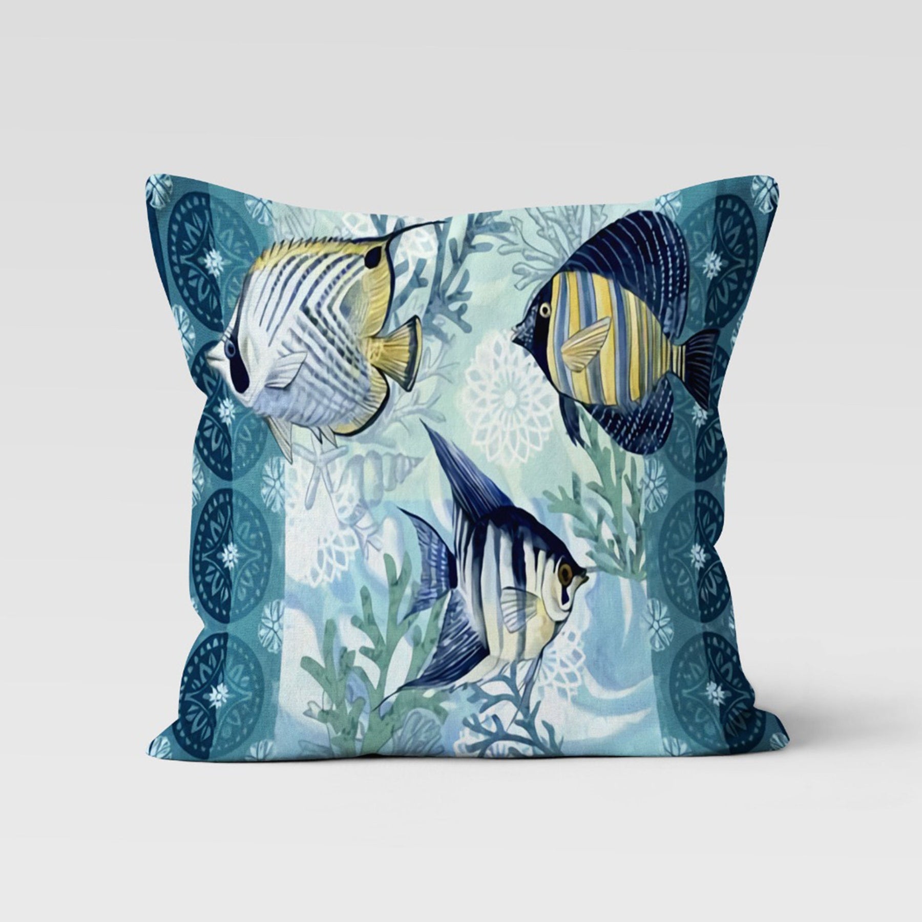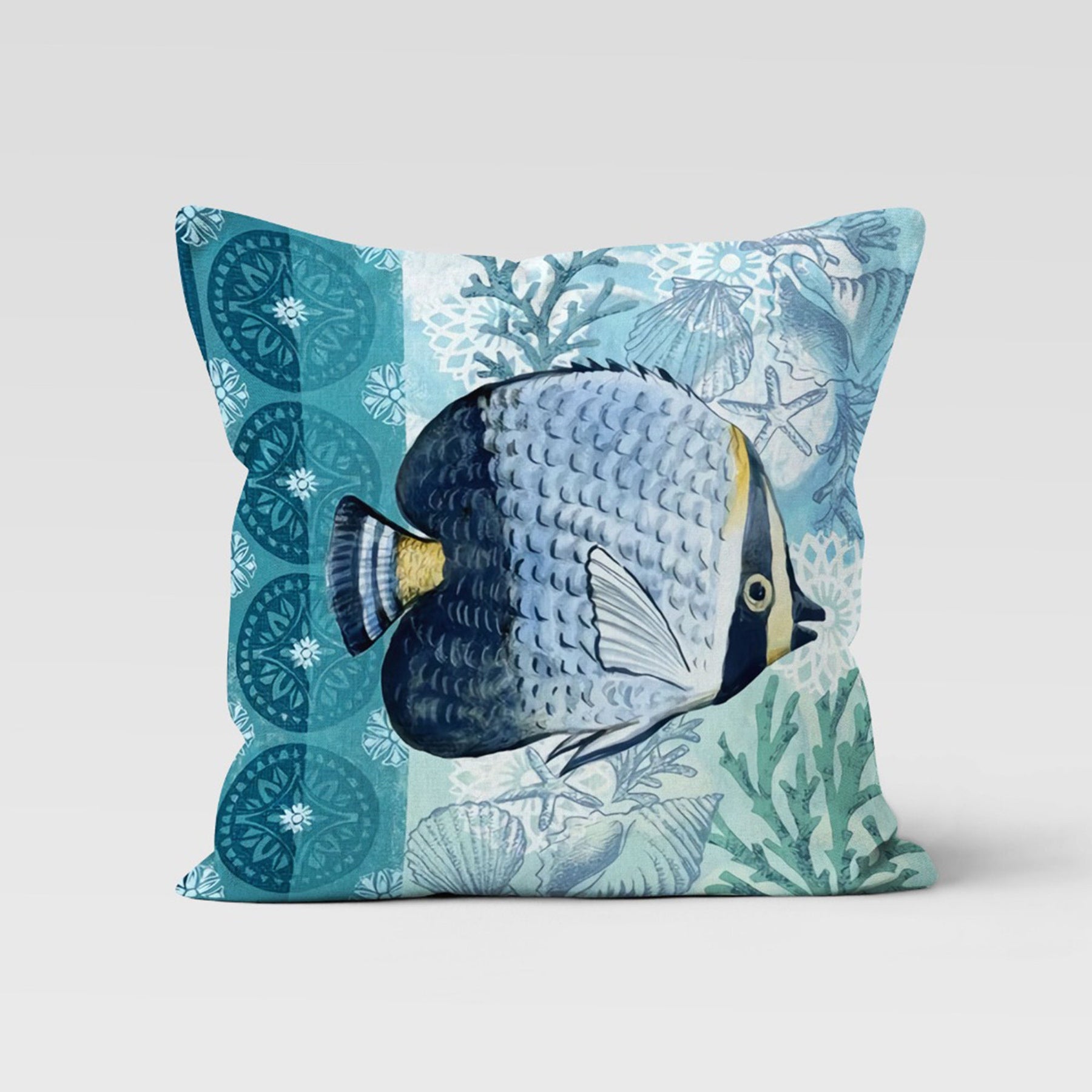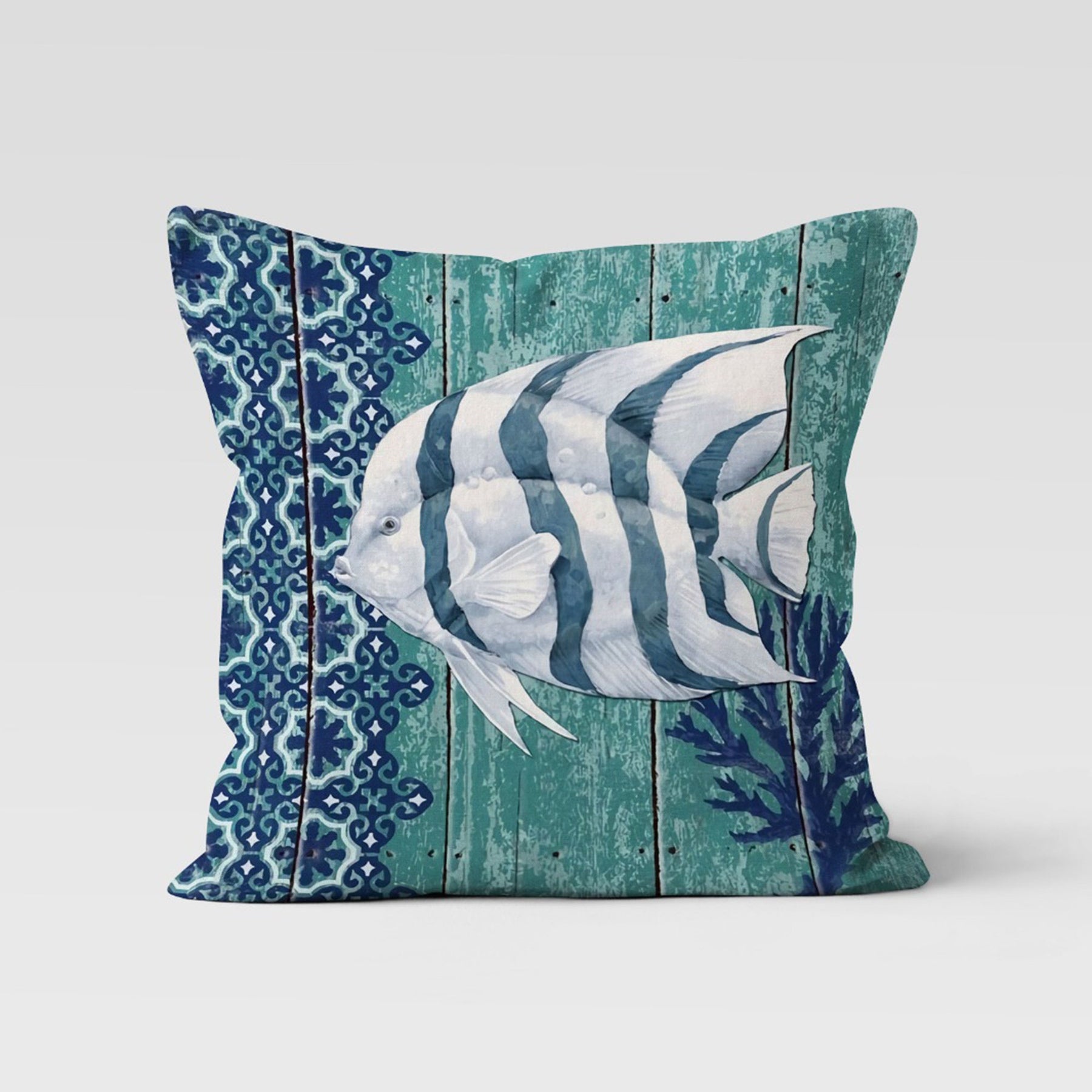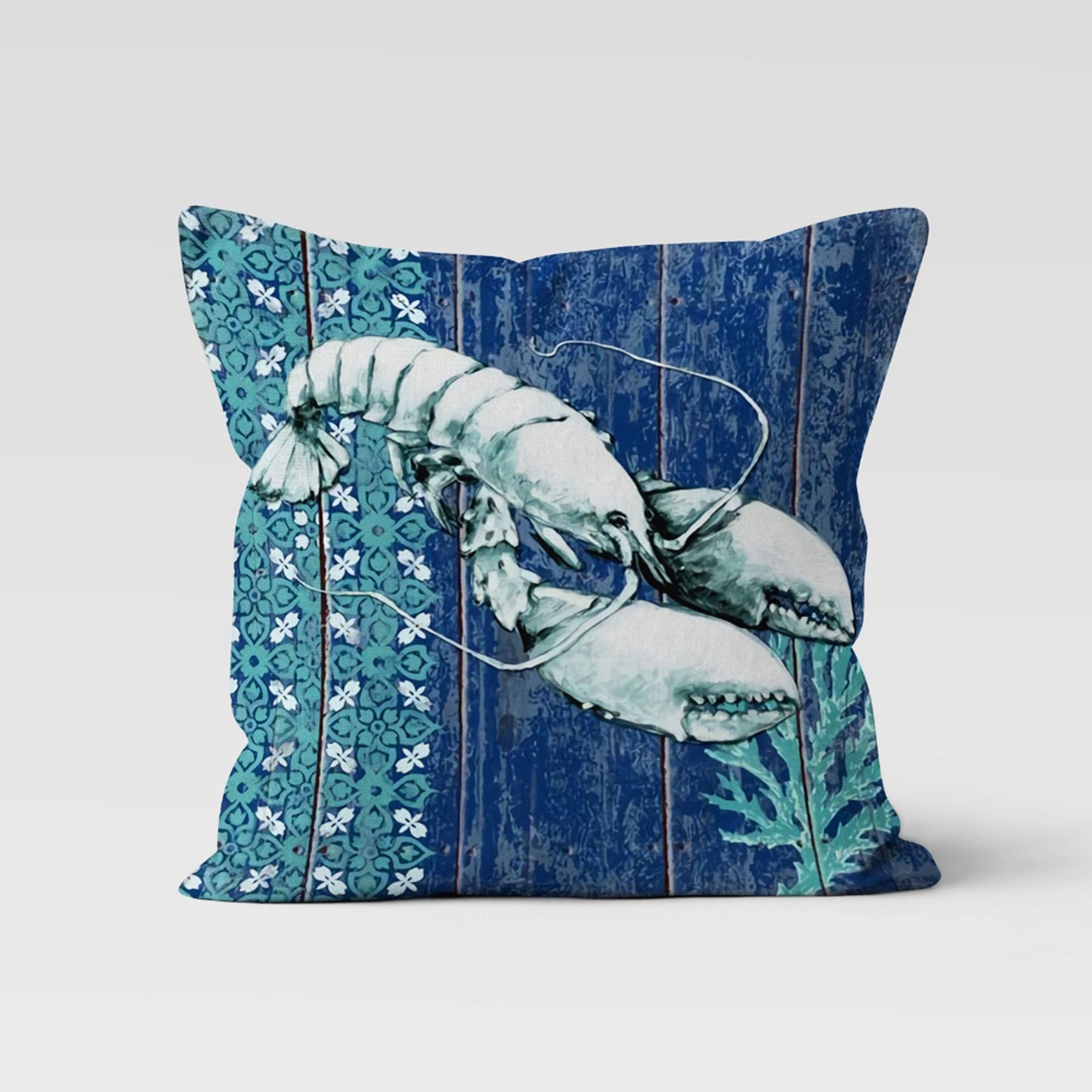 Turquoise Nautical Pillow with Fish and Lobster Print