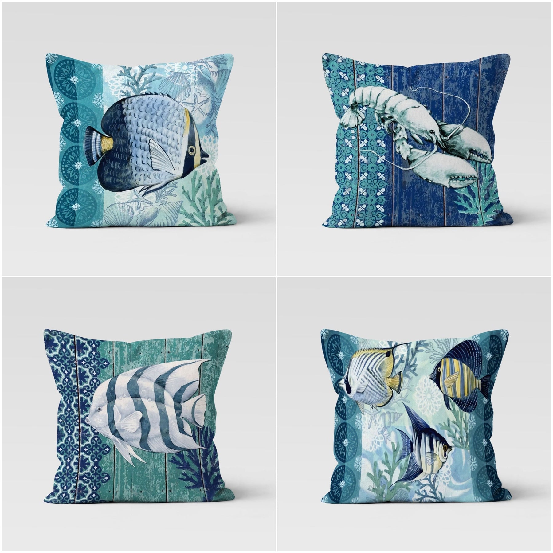 These square blue, turquoise and white decorative beach house throw pillow covers with fish and lobster prints;