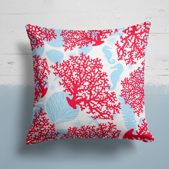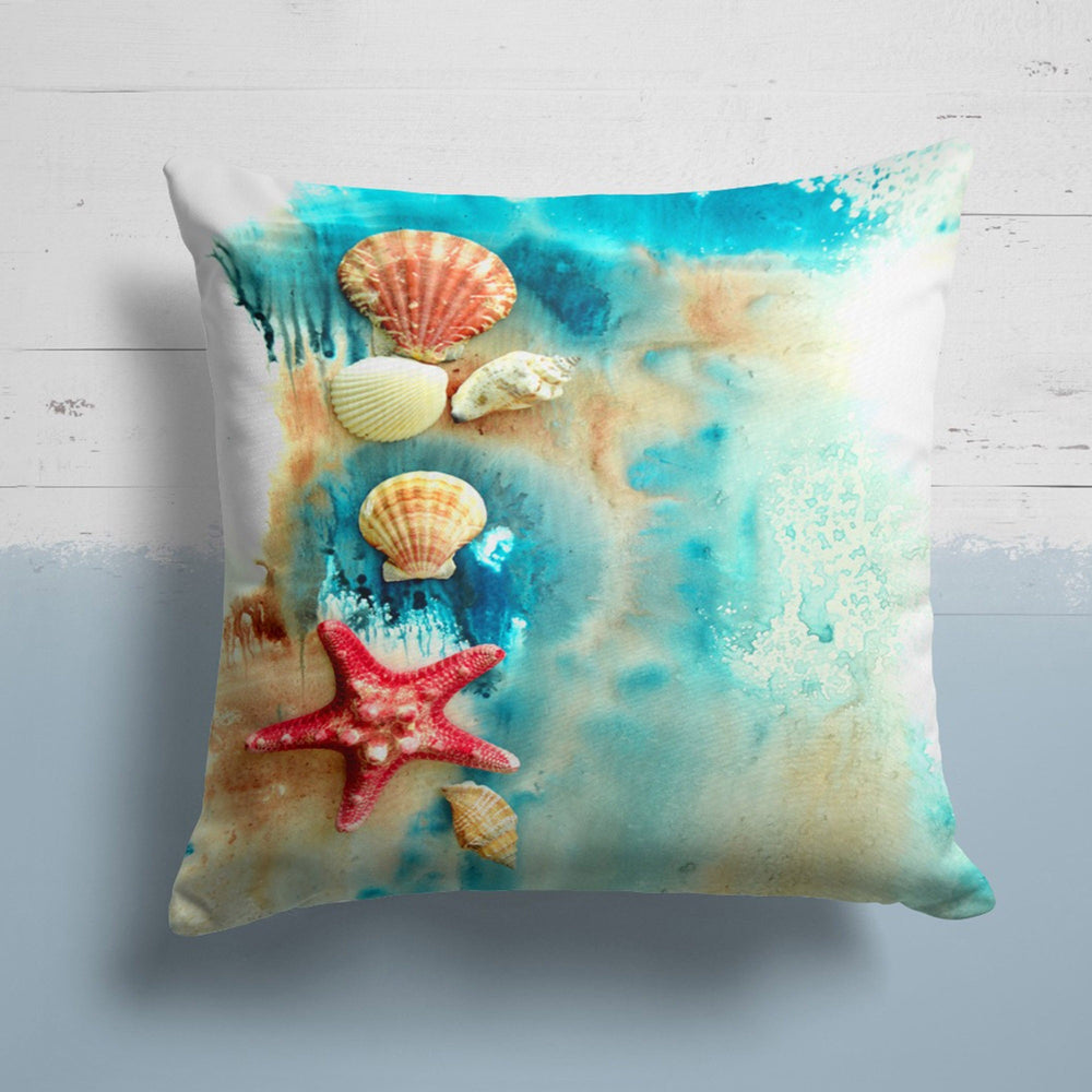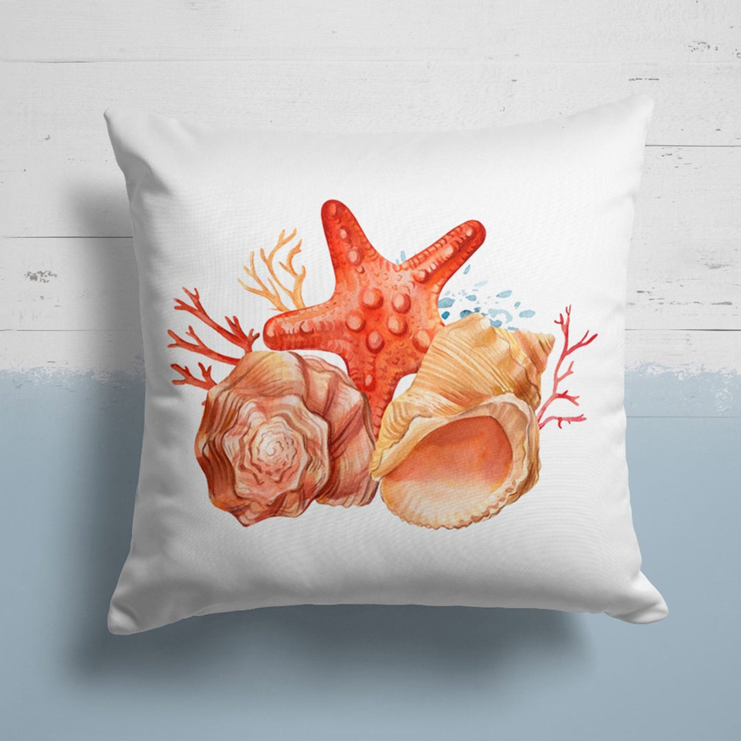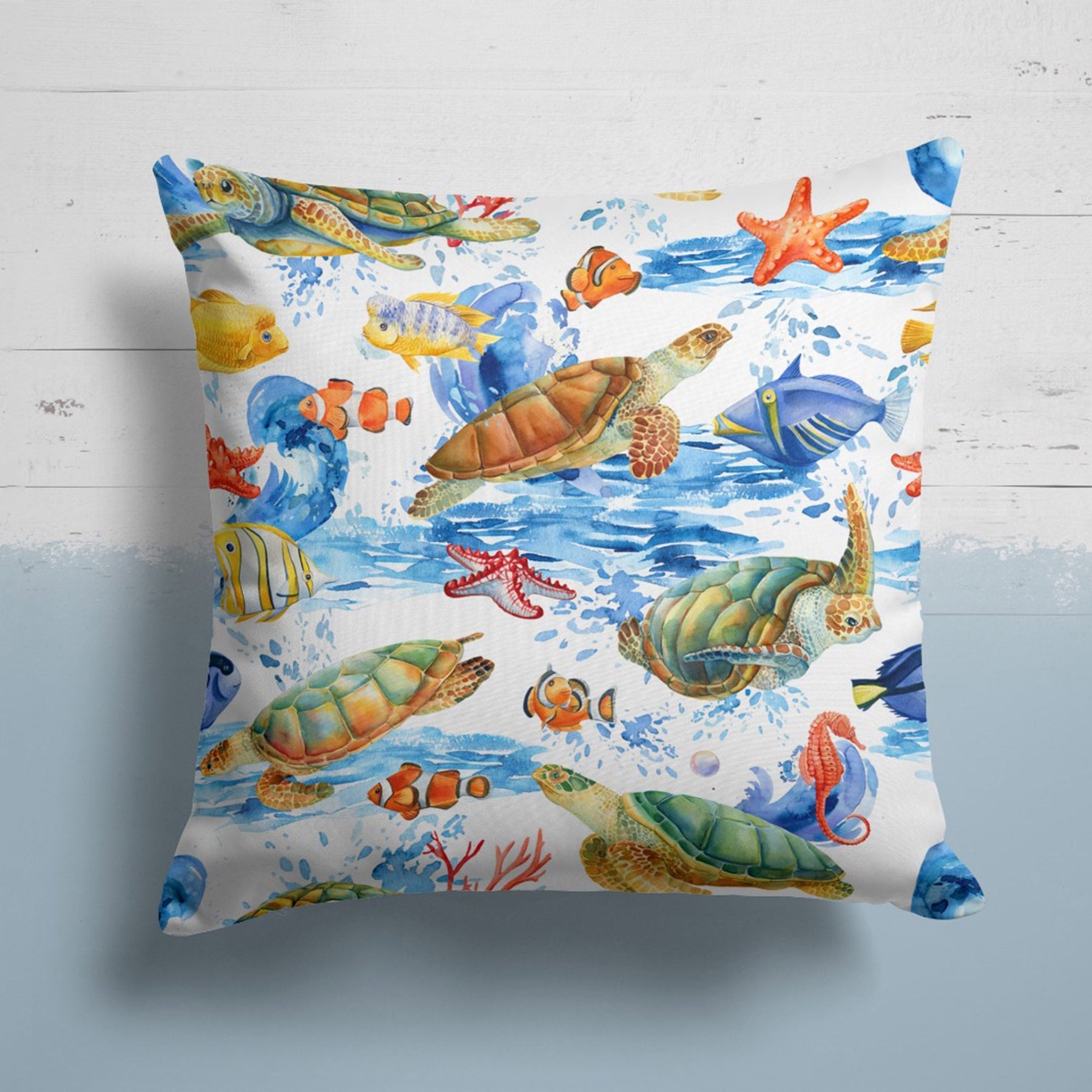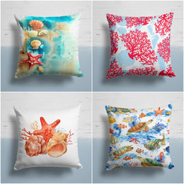 These square decorative beach house throw pillow covers with Red Coral, Orange Starfish, Sea Turtle, Fish and Seashell prints;