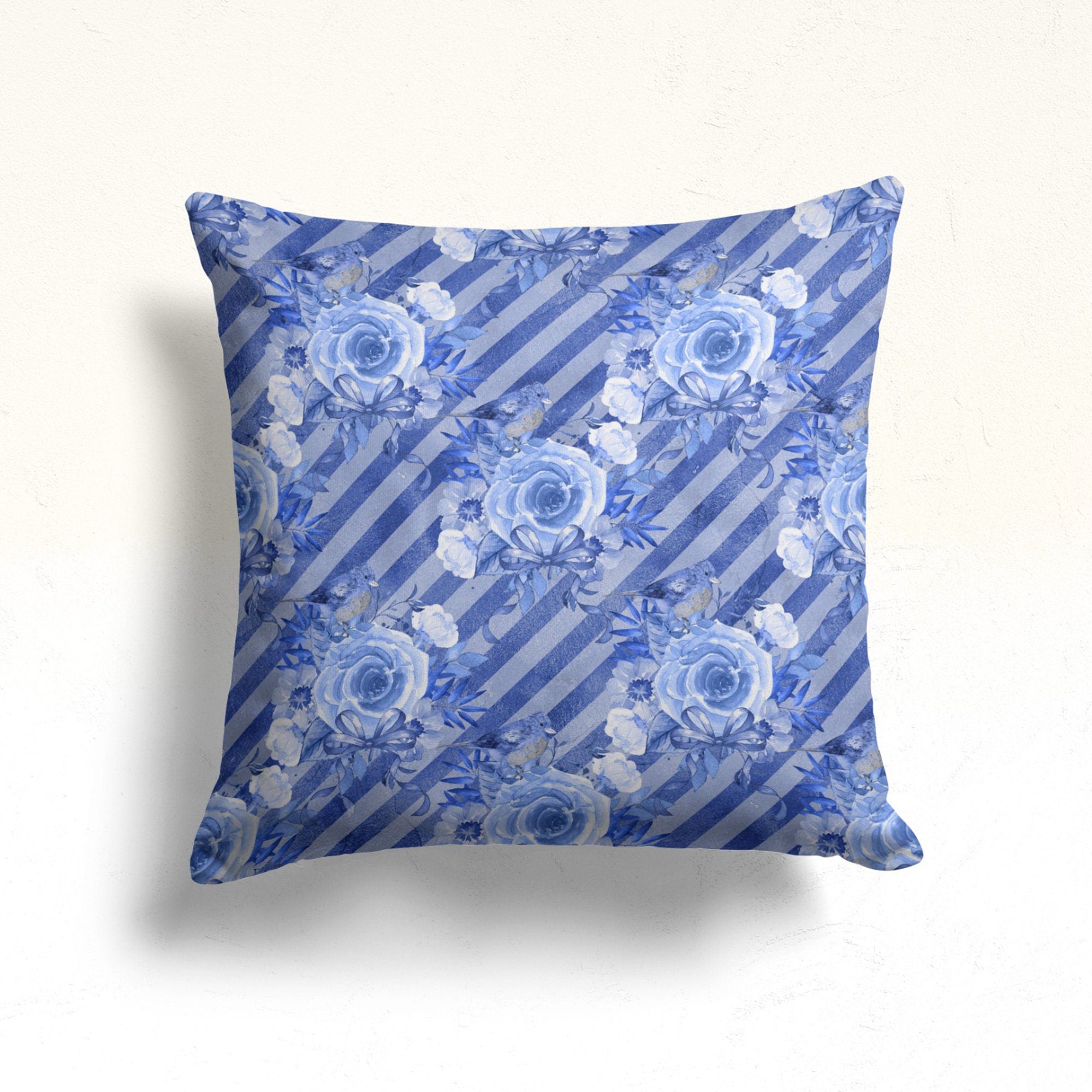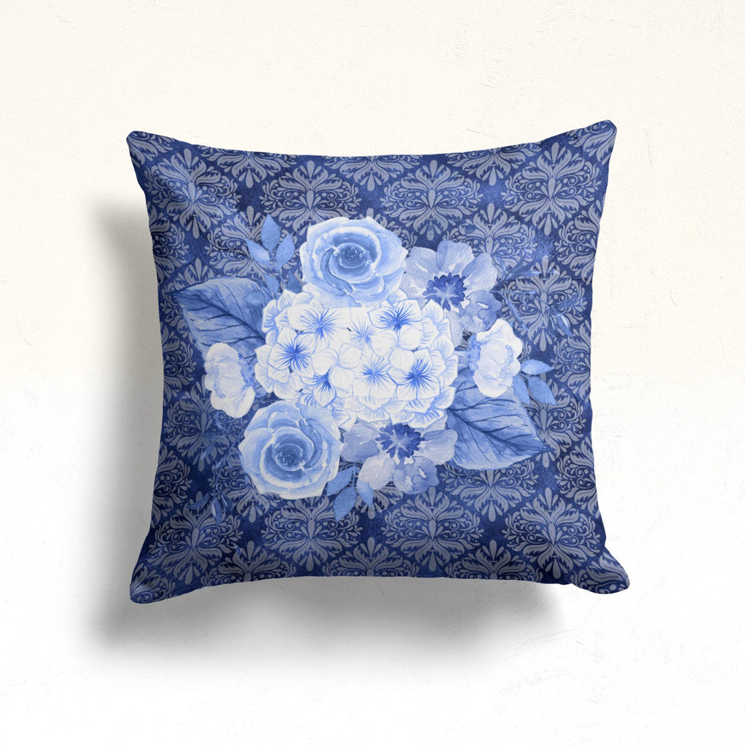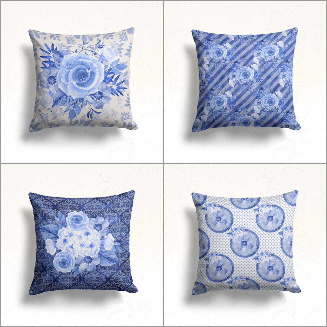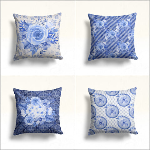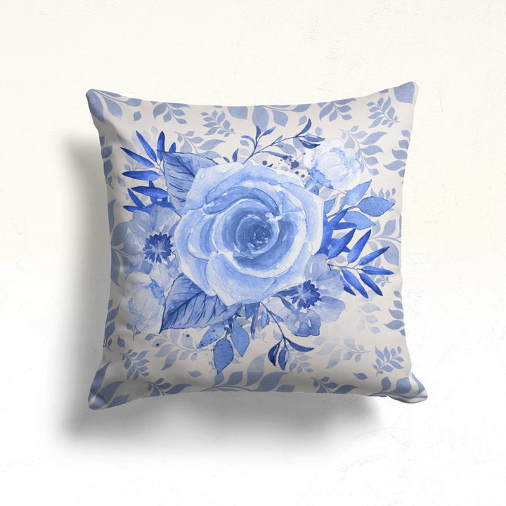 These elegant square decorative throw pillow covers with blue rose prints;