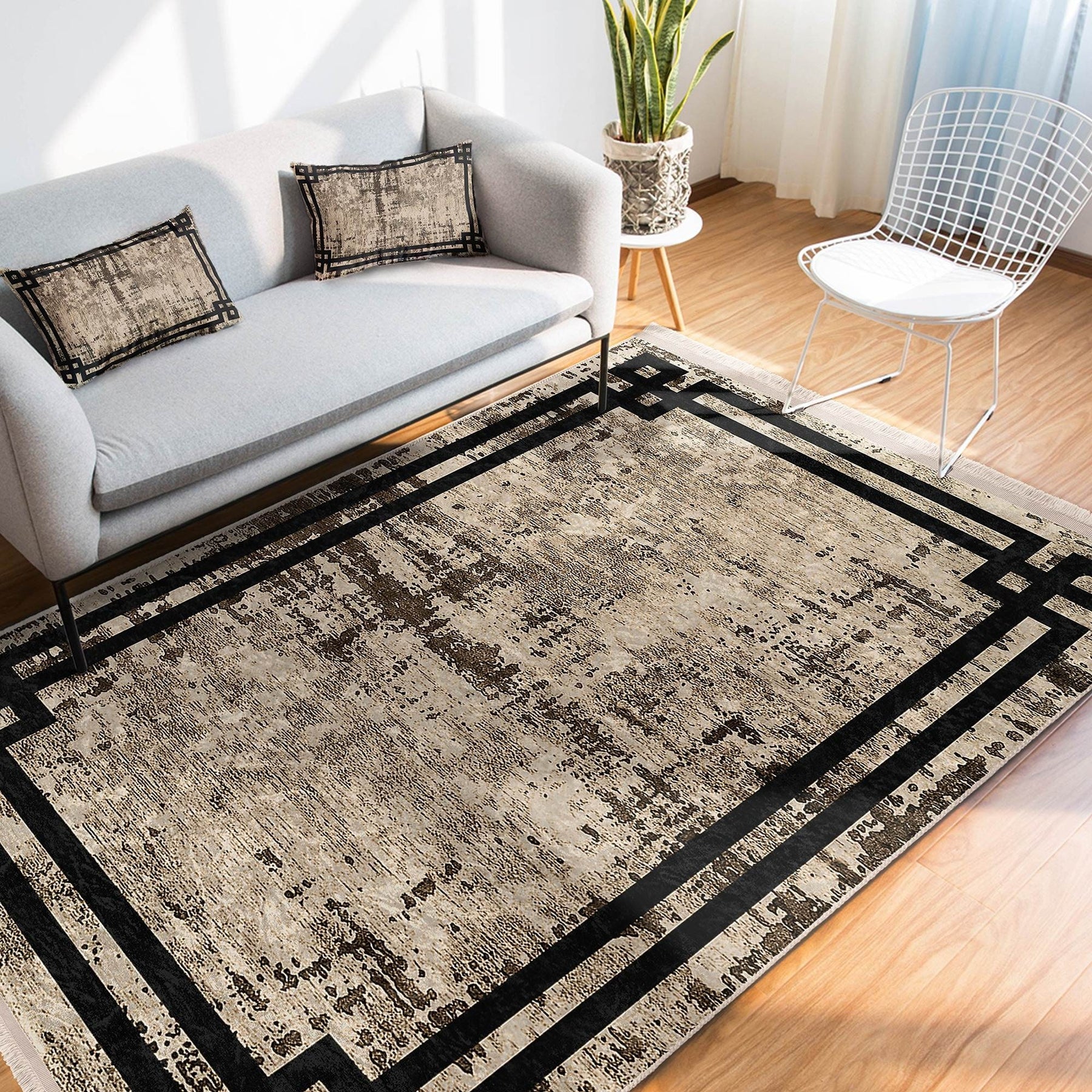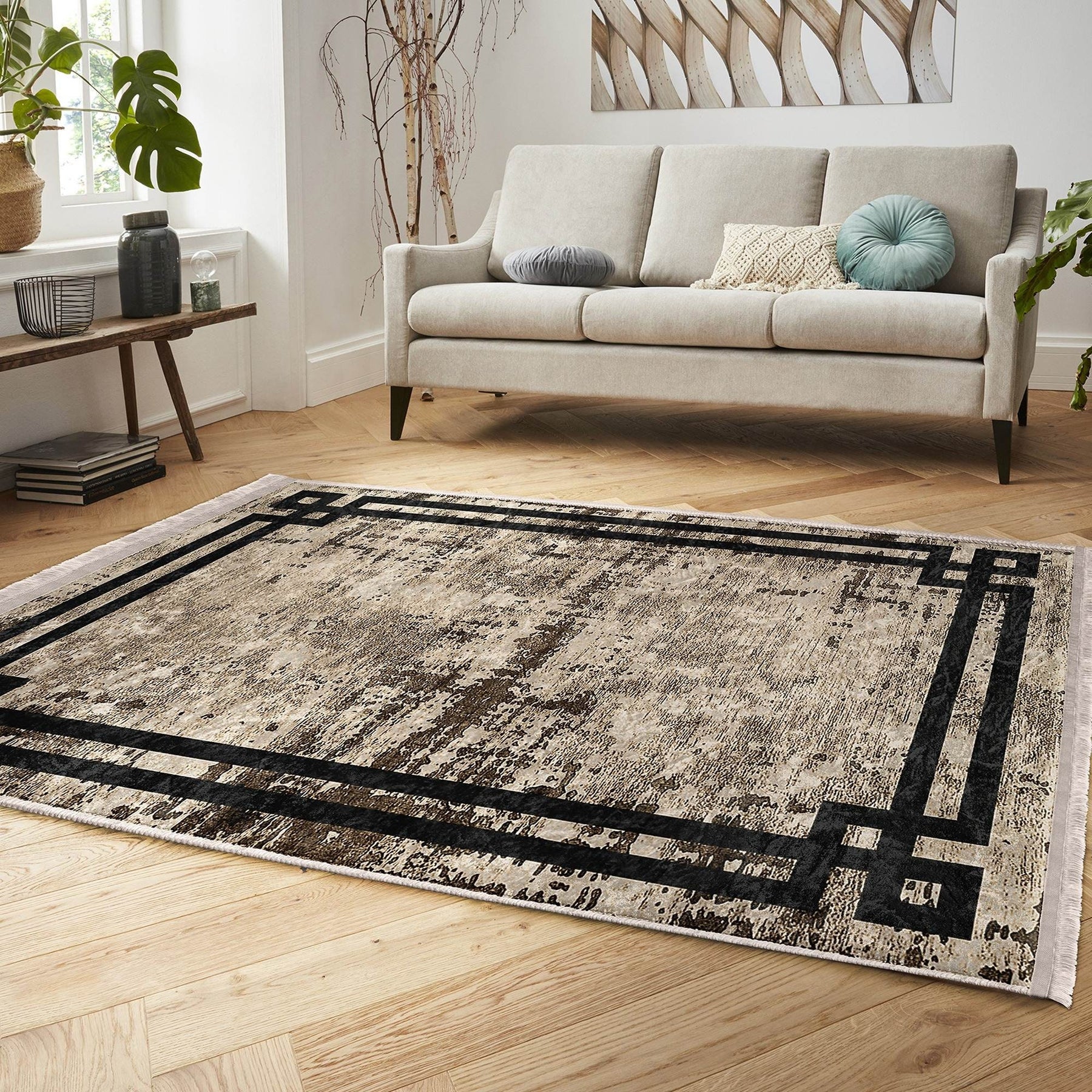 This elegant Machine-Washable floor rug with geometric bordered design;