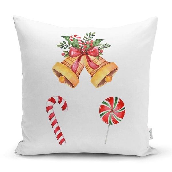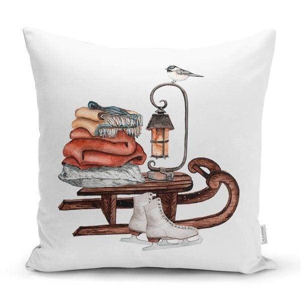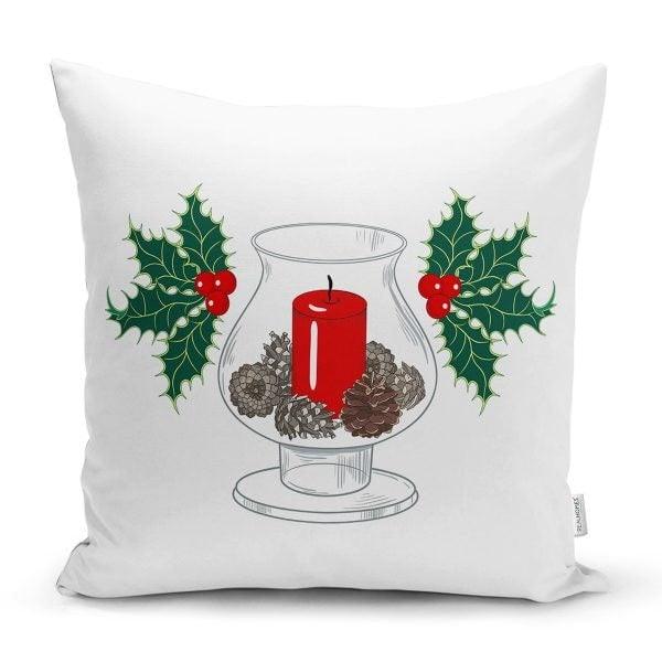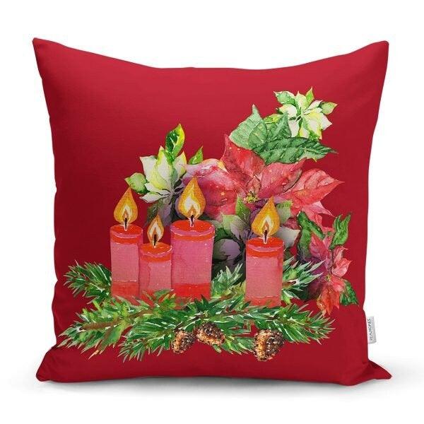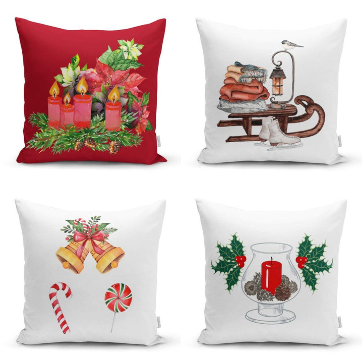 These elegant square decorative pillow covers with candles, snow sled, bird, Xmas bell, red flowers and green leaves;