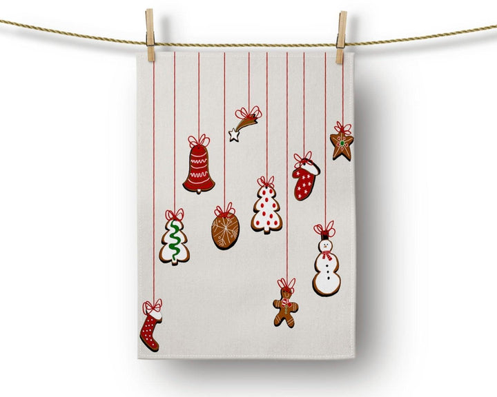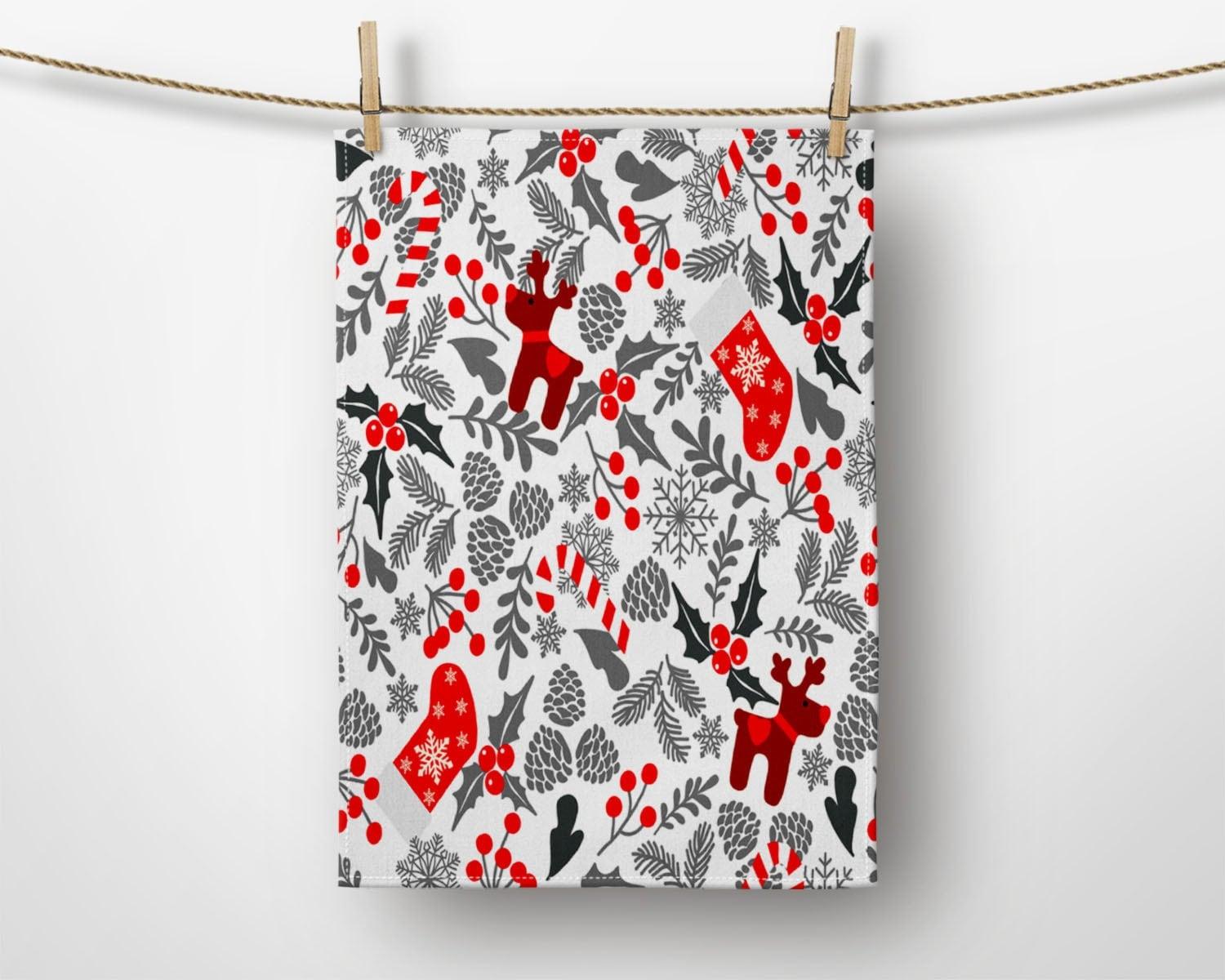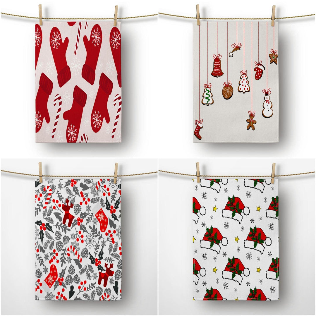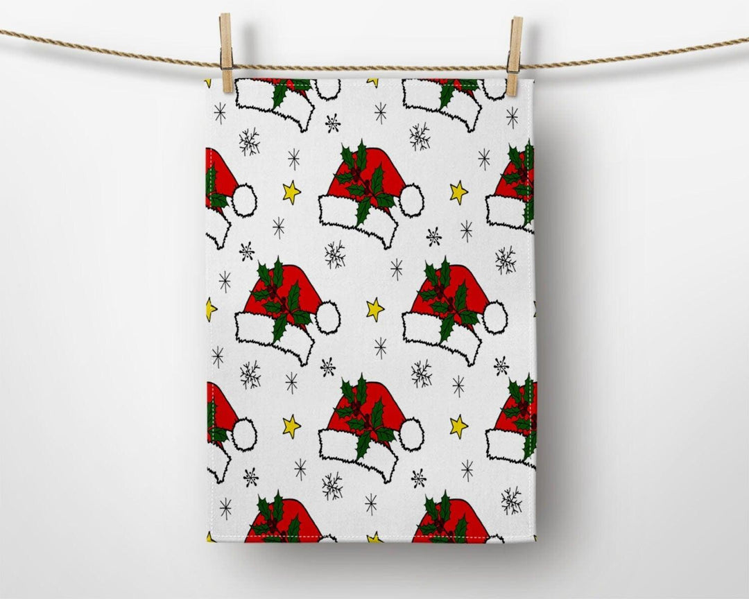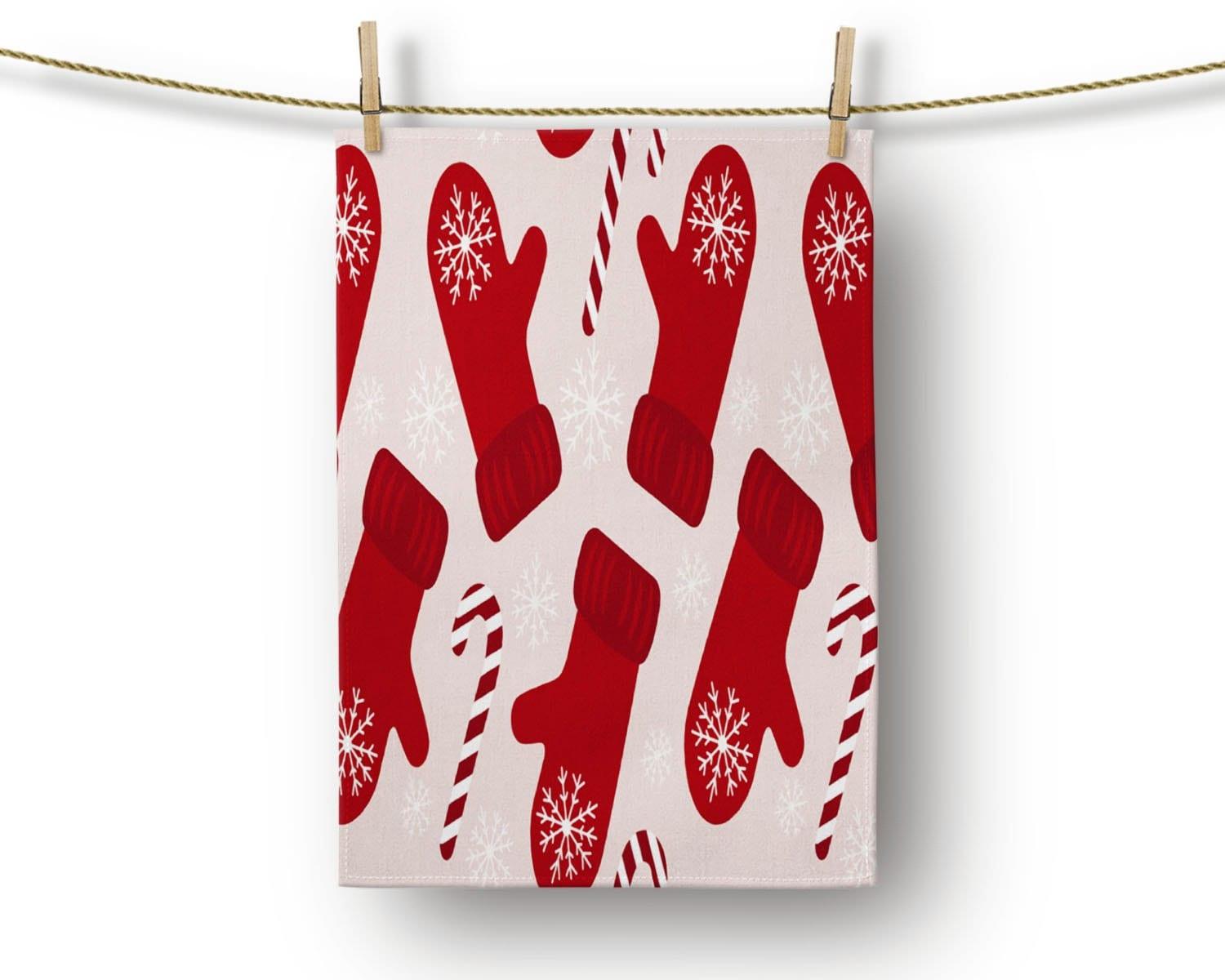 These elegant decorative rectangle kitchen/dish/hand/tea towels with Christmas Gloves, Hat of Santa Clause, gray leaves and Xmas ornaments;