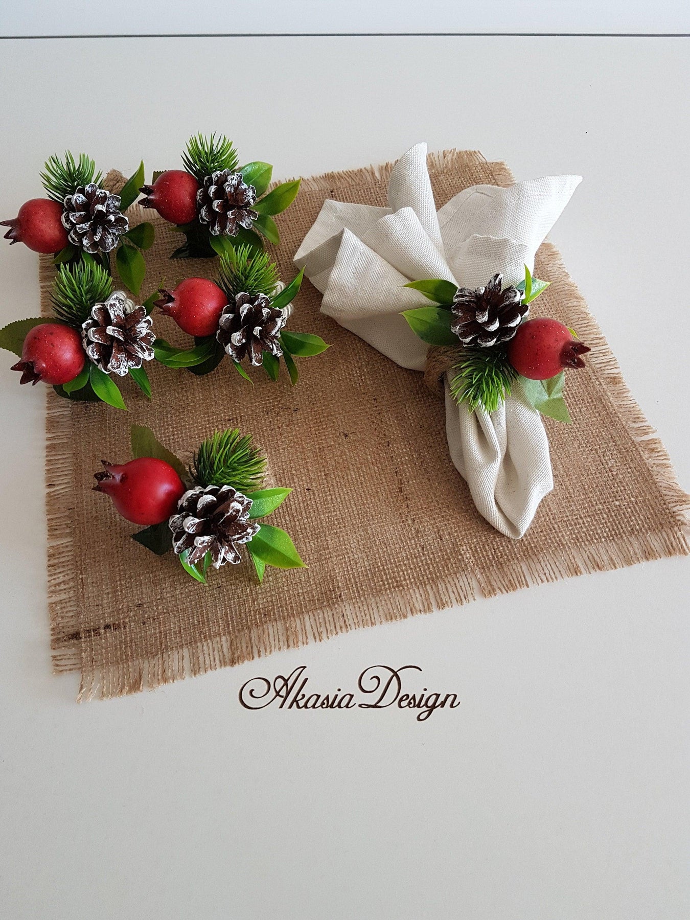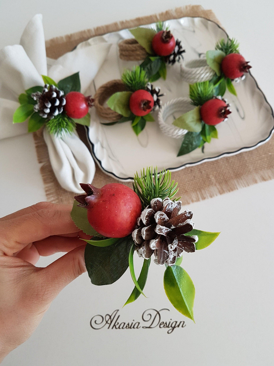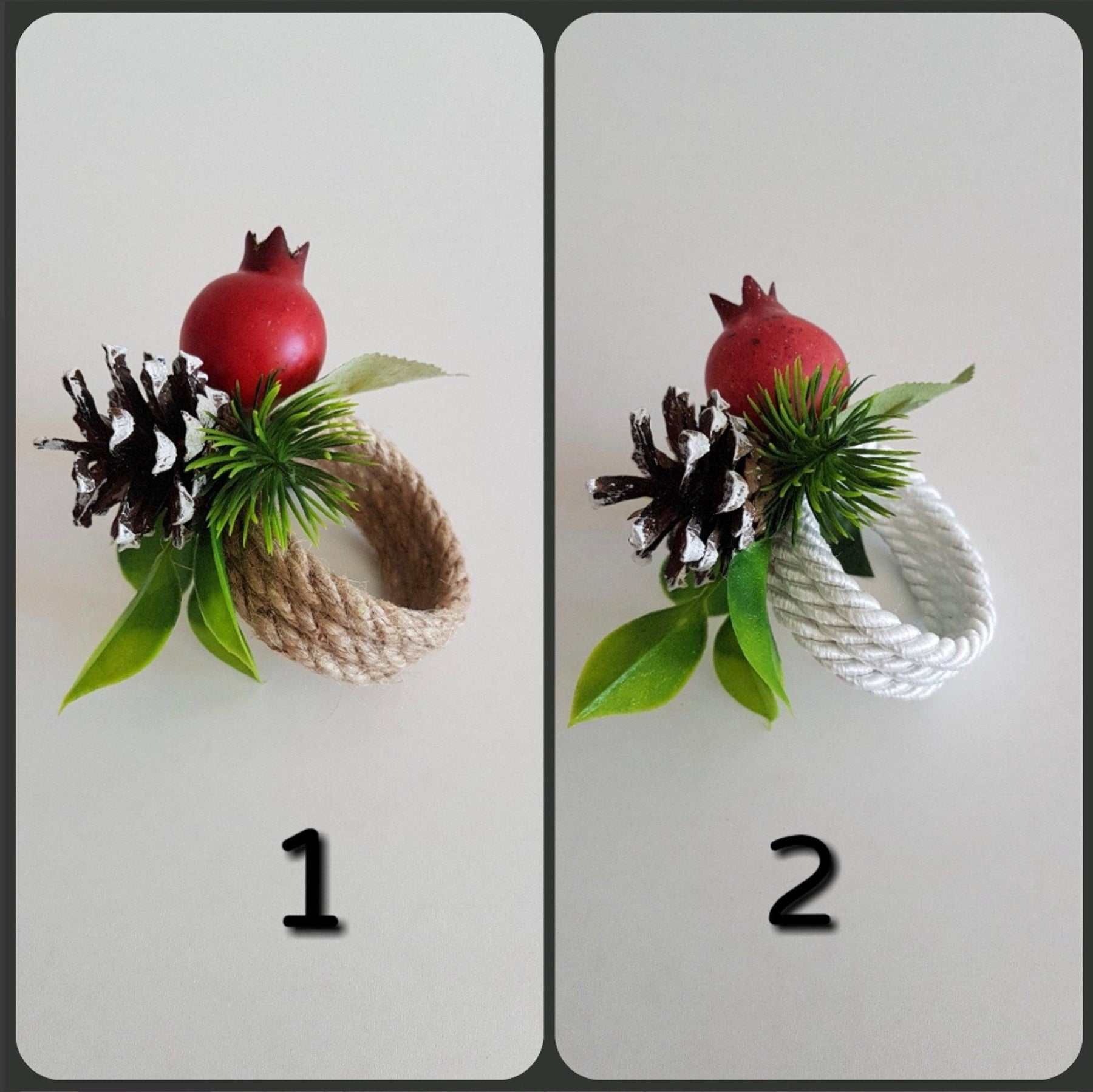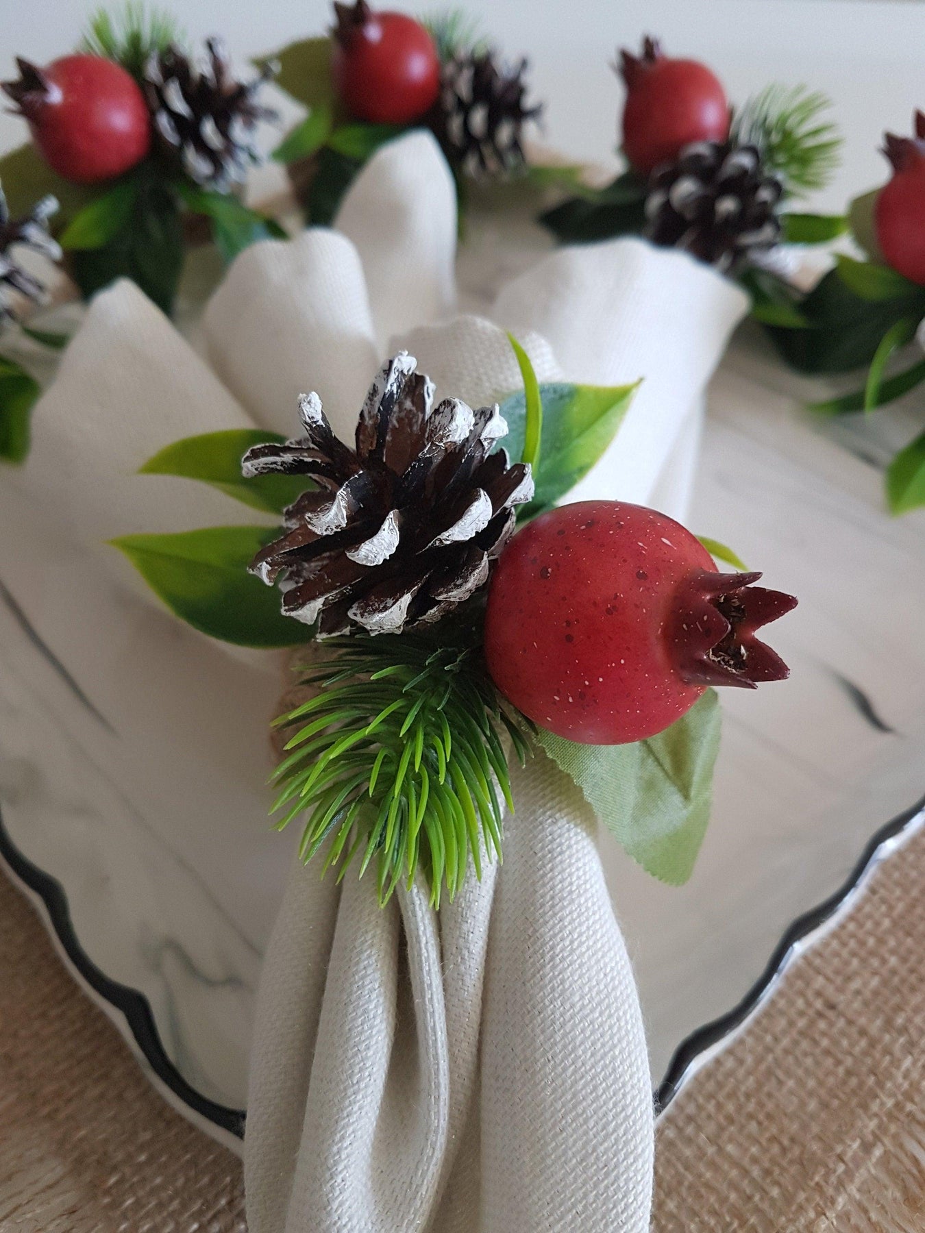 These rustic jute rope napkin rings with natural pinecones, faux pomegranate and artificial greenery are the perfect dining accessory and also a perfect kitchen decor.