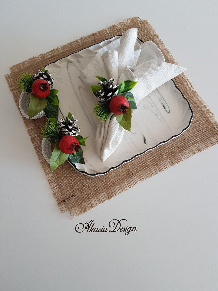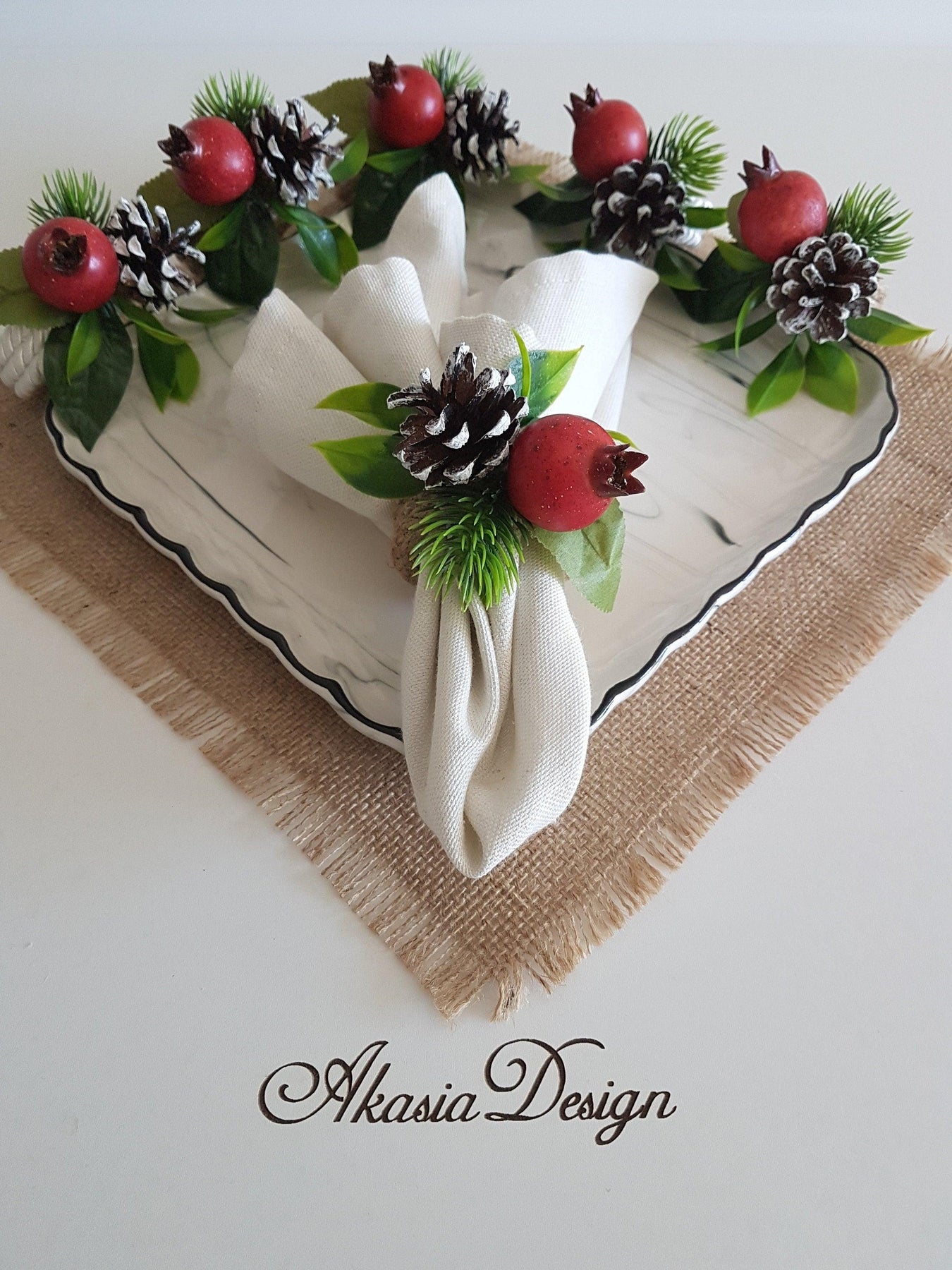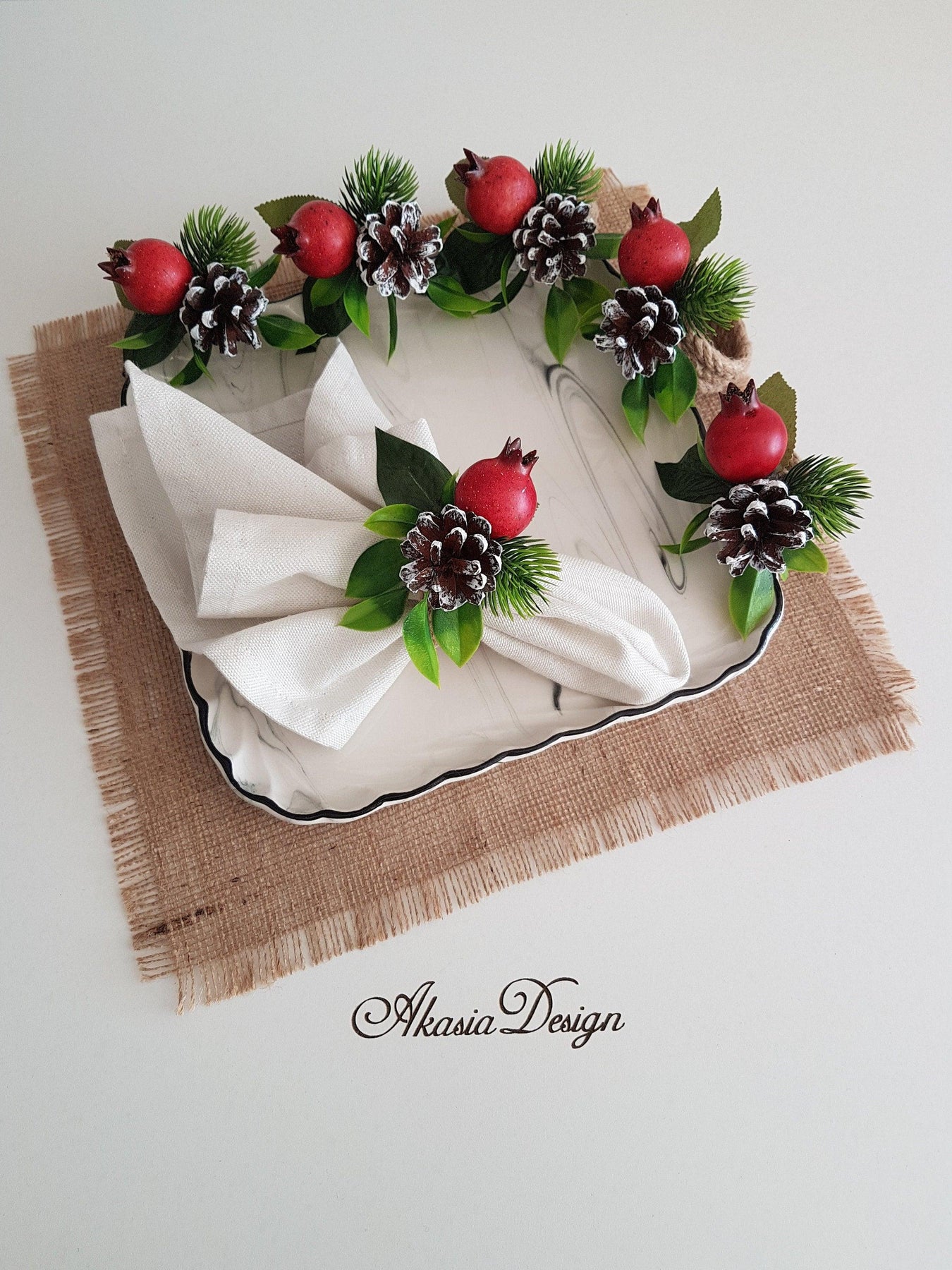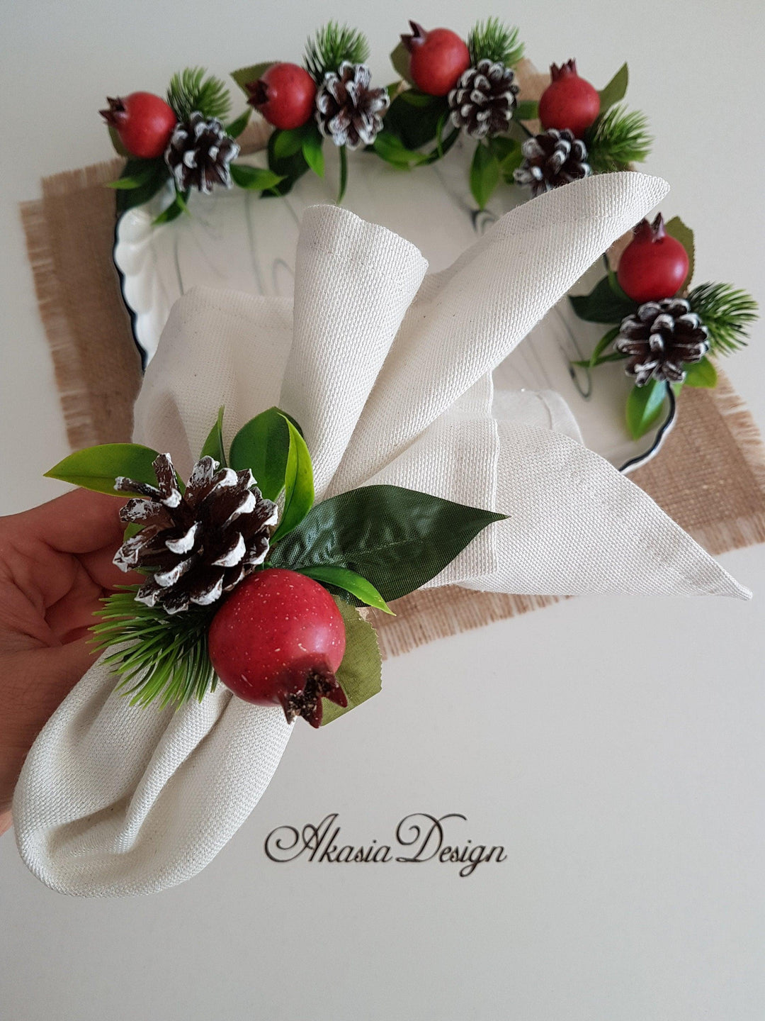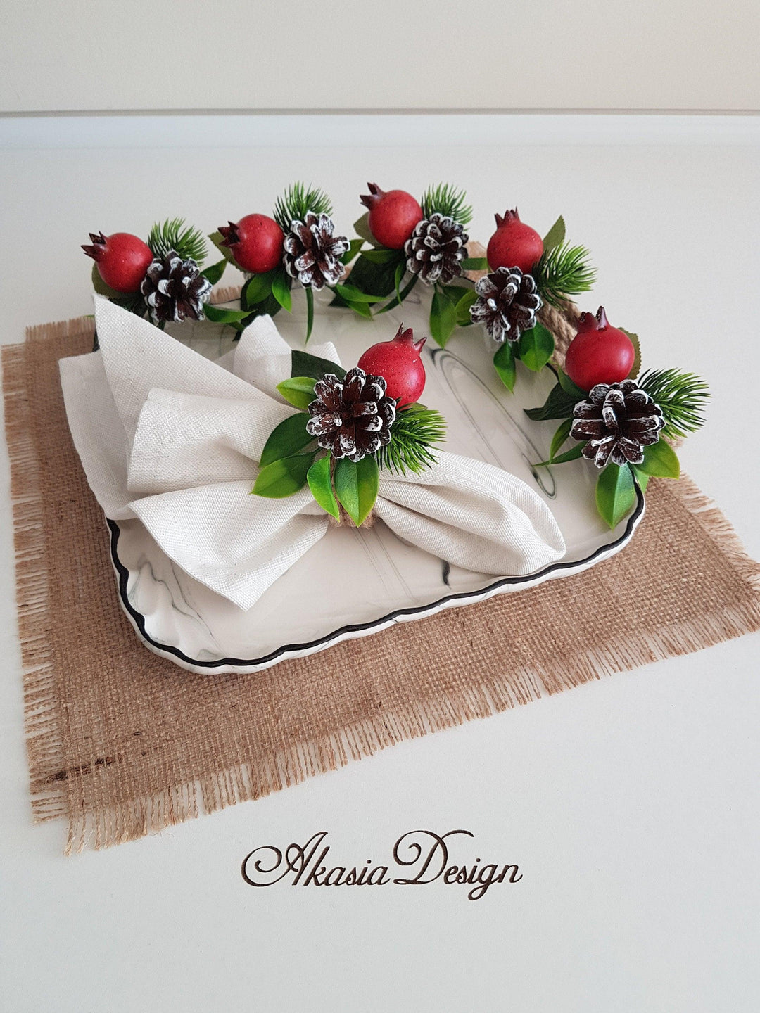 These rustic jute rope napkin rings with natural pinecones, faux pomegranate and artificial greenery are the perfect dining accessory and also a perfect kitchen decor.