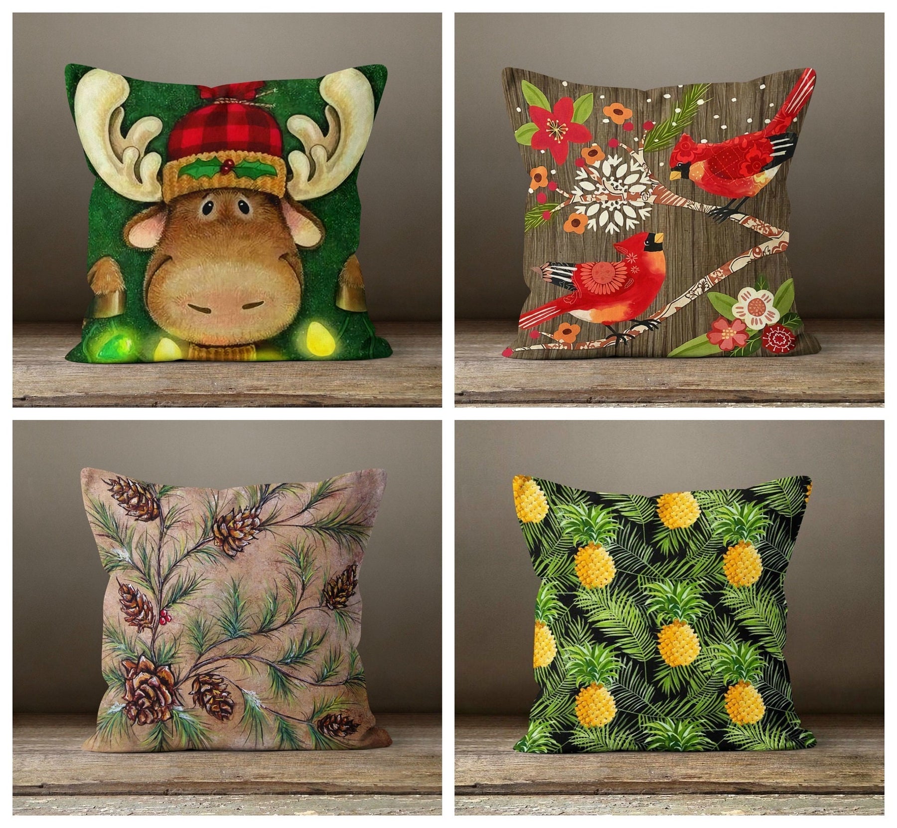 These elegant square decorative rustic farmhouse throw cushion covers with cartoon deer, pineapples and birds;