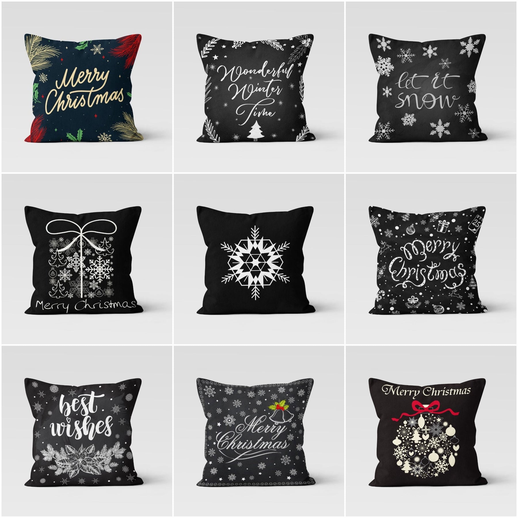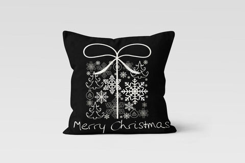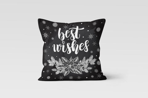 These elegant square decorative rustic farmhouse throw cushion covers with Merry Christmas, Wonderful Winter Time, Let It Snow, Best Wishes prints, black white snowflakes and black white design;