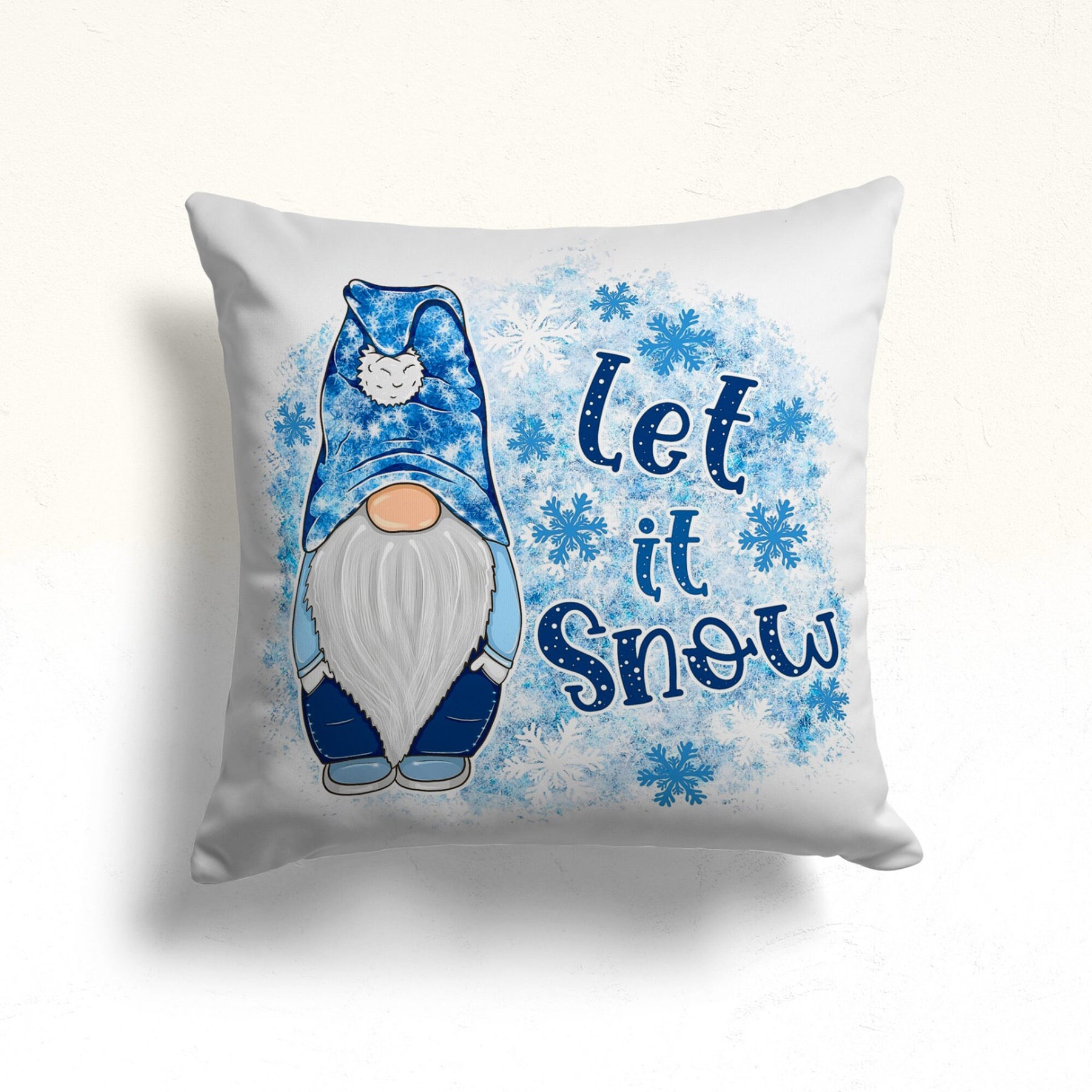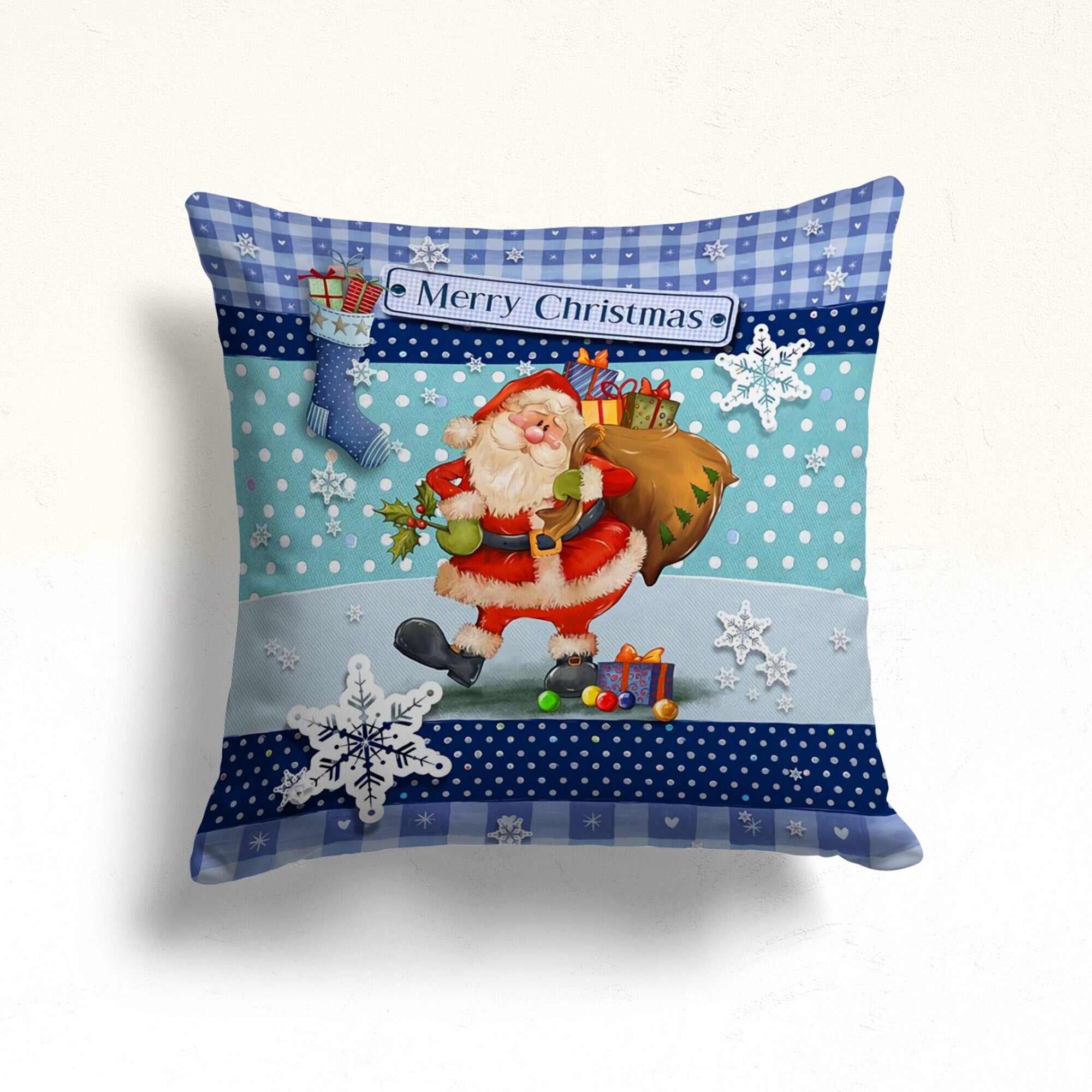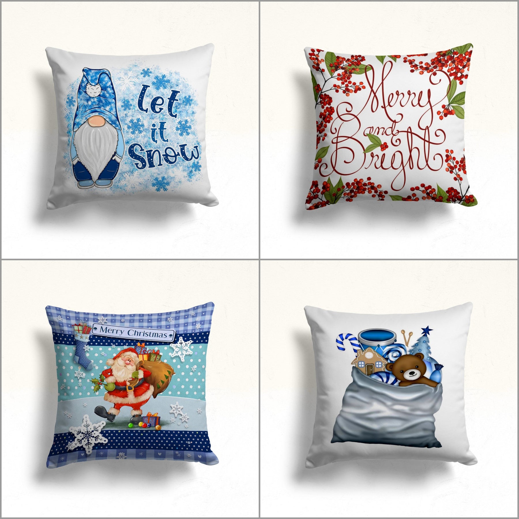 These elegant square decorative rustic farmhouse throw cushion covers with Blue Gnome, Merry and Bright, Let it Snow and Santa prints;