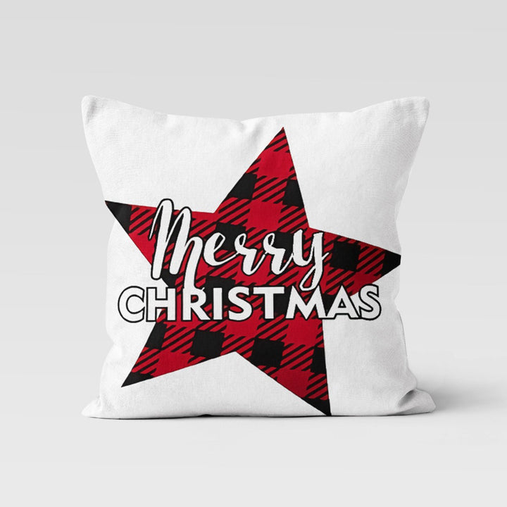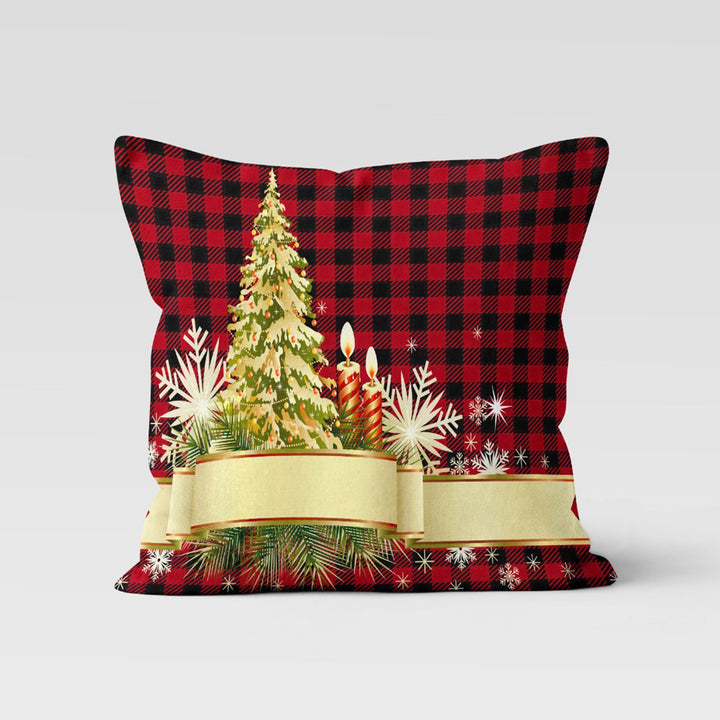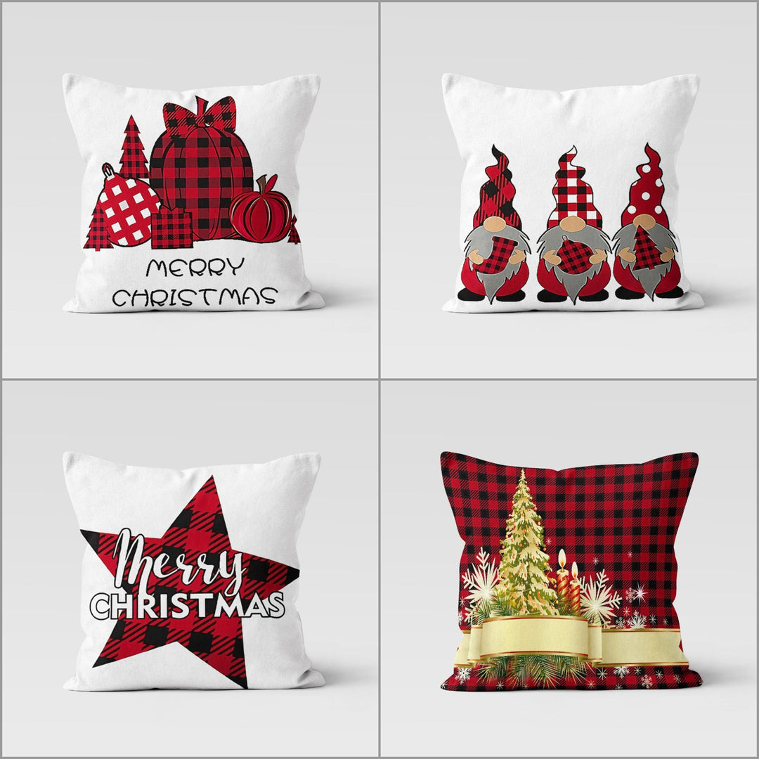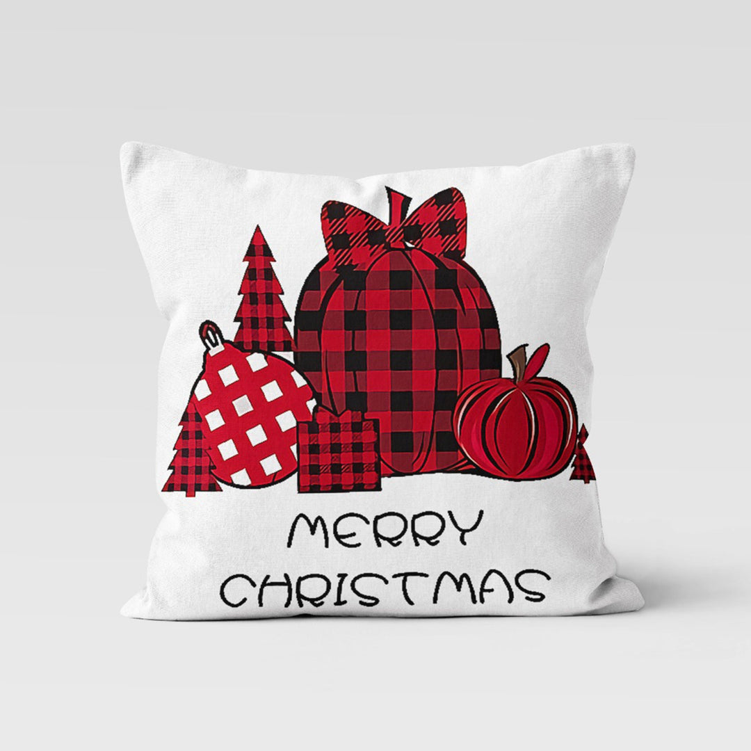 These elegant square decorative rustic farmhouse throw cushion covers with Gnome, Merry Xmas, Pumpkin, Xmas Tree, Star print on checkered background;