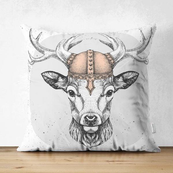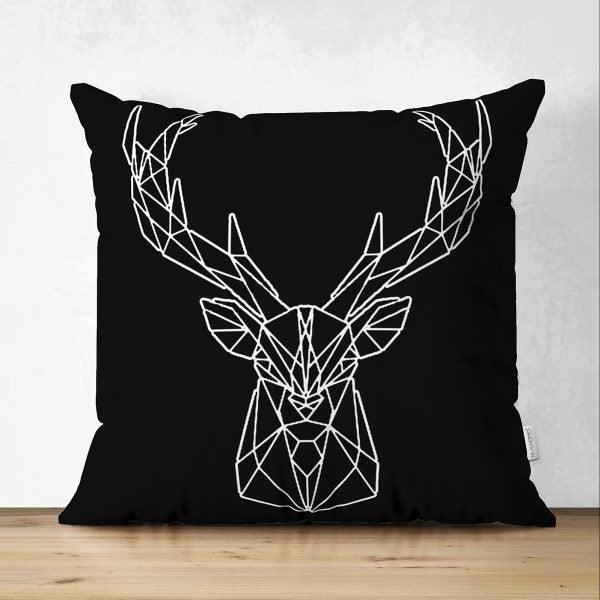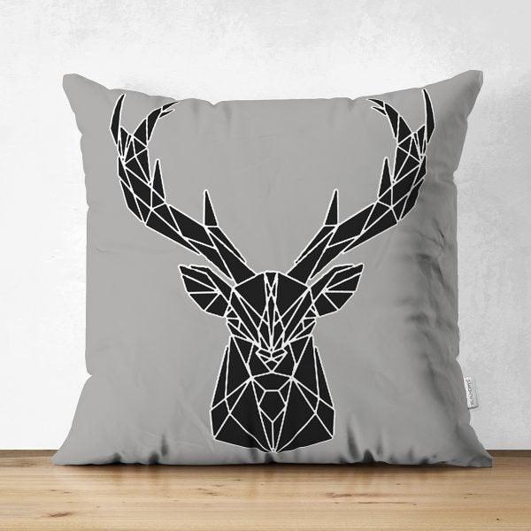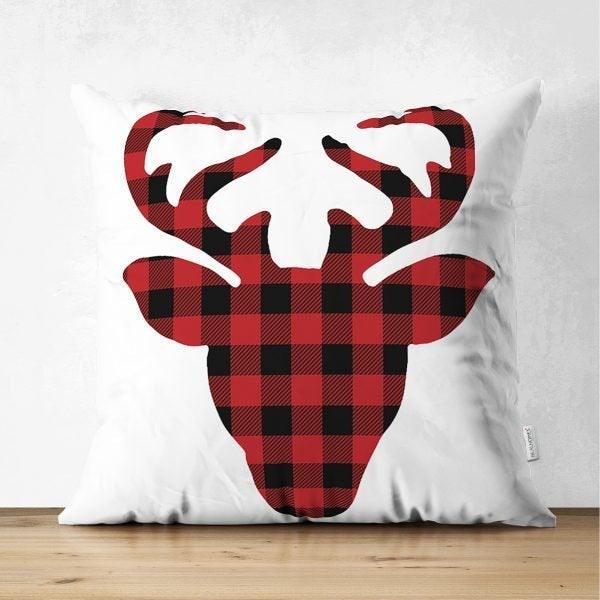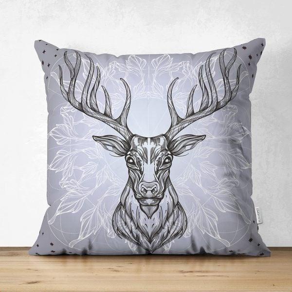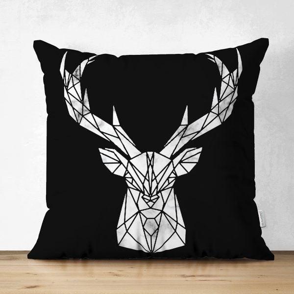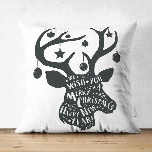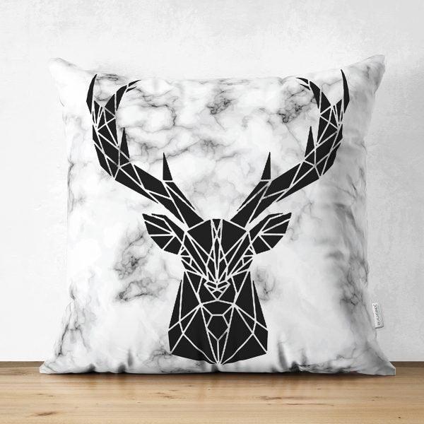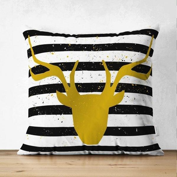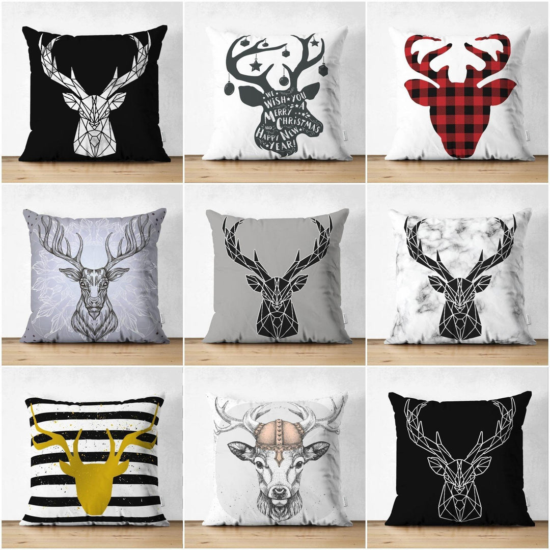 These elegant stylish and high quality suede square pillow covers with Xmas Deer heads, Merry Christmas, Happy New Year print, striped yellow deer head, plaid Xmas deer head, gray and white deer head on marble background;