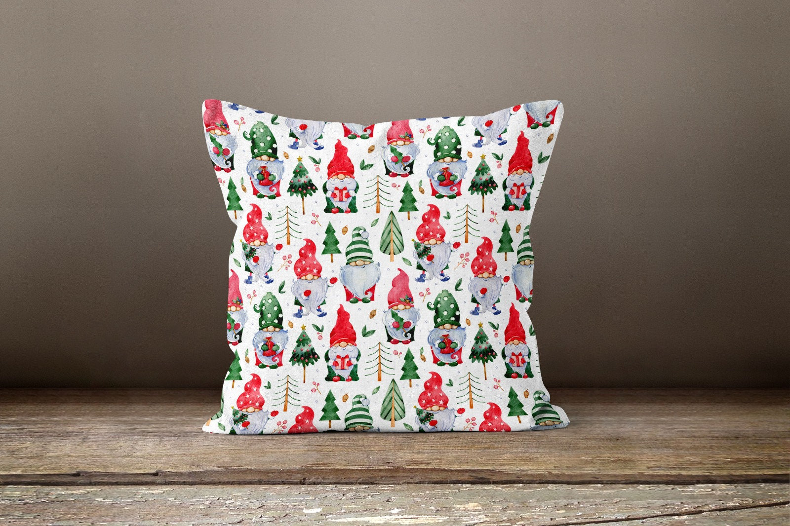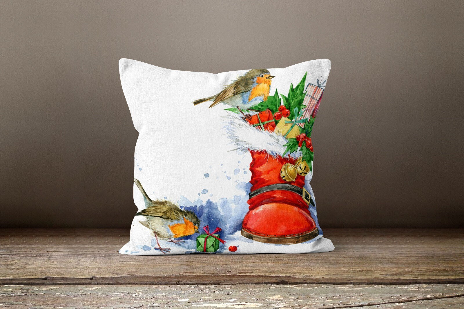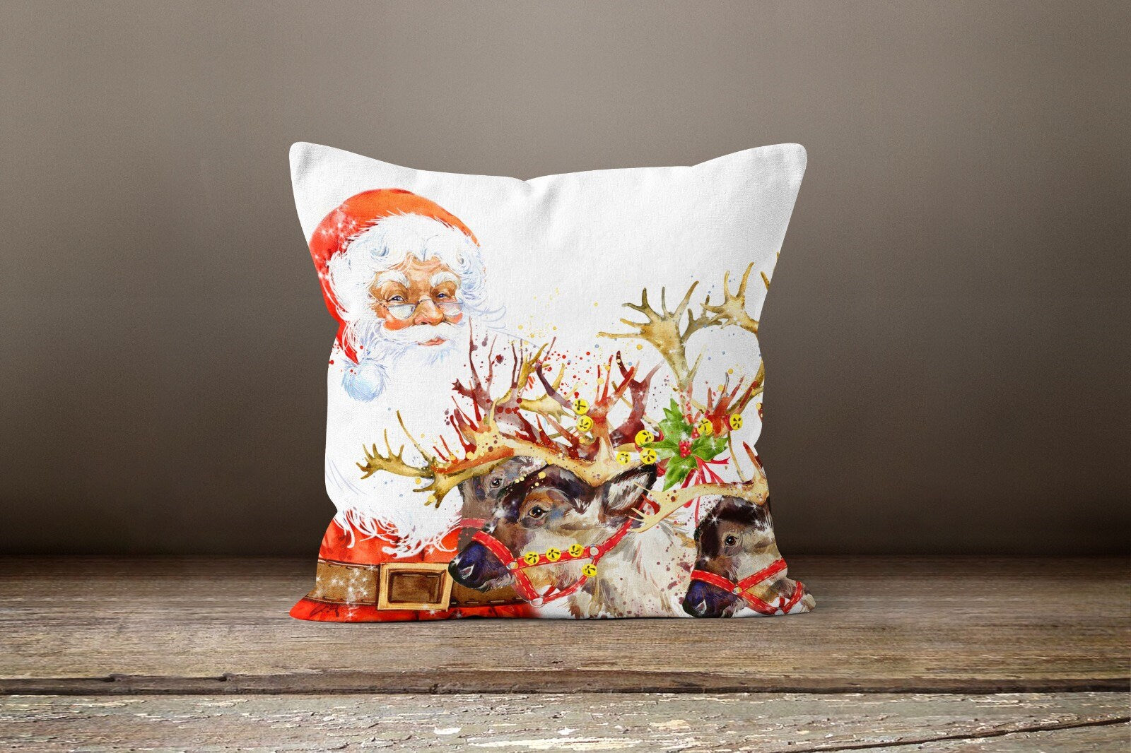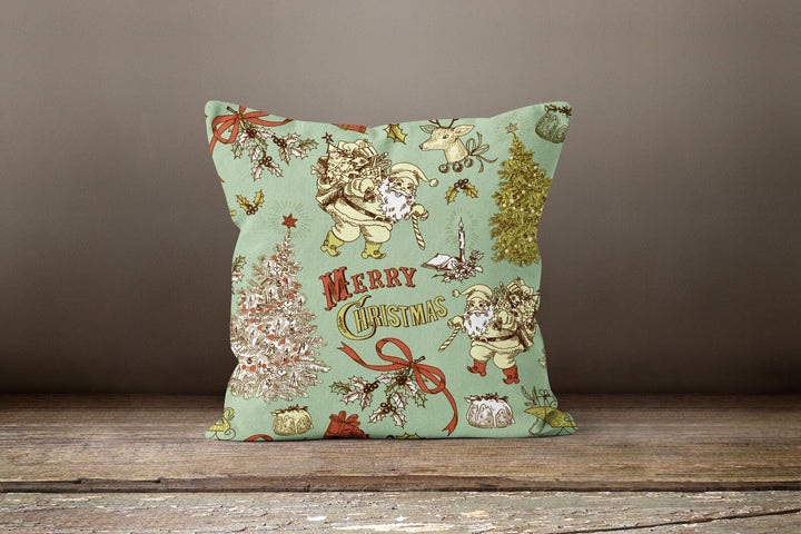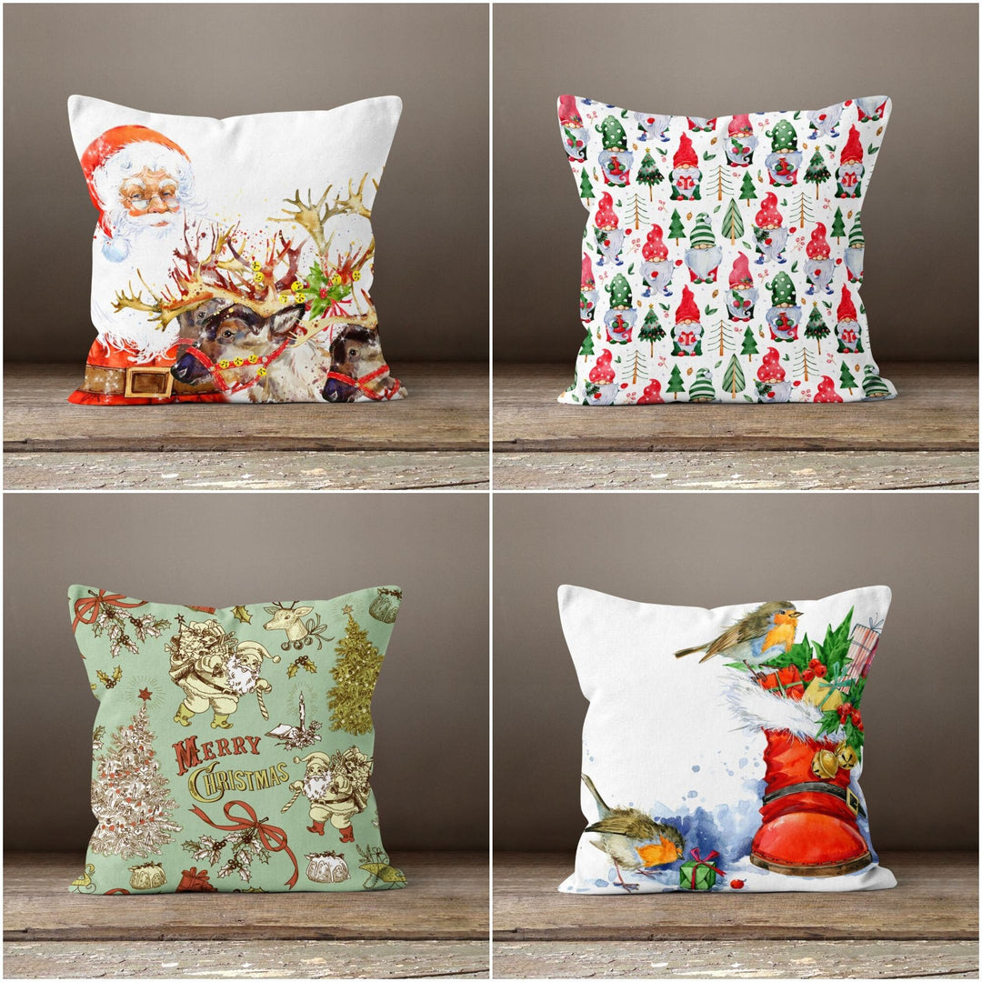 These elegant square decorative rustic farmhouse throw cushion covers with Santa Clause, deer, dwarf Santa/Gnome, snow birds, Xmas trees and Merry Christmas print;