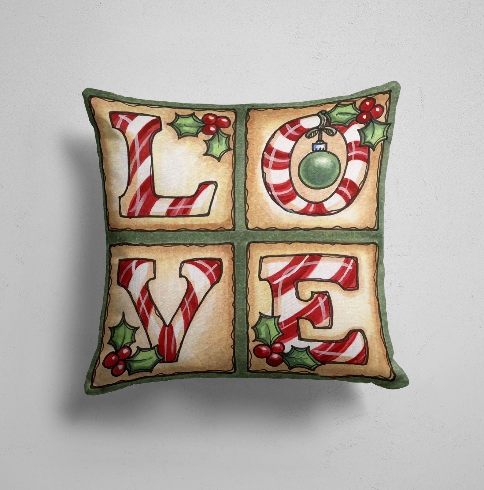 These elegant square decorative rustic farmhouse throw cushion covers with Merry Christmas, Joy, Love, Peace, Xmas tree, Horse and Cardinal Bird, Love print with candies, house under snow, horse with red berries;