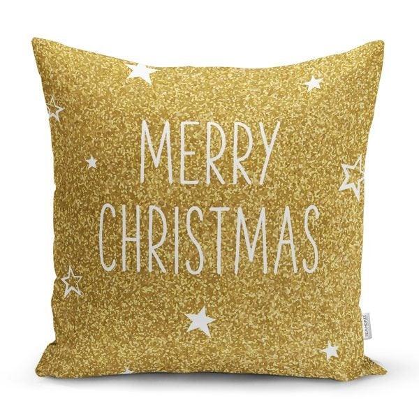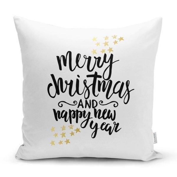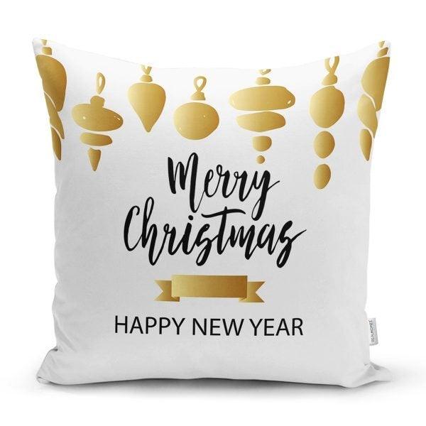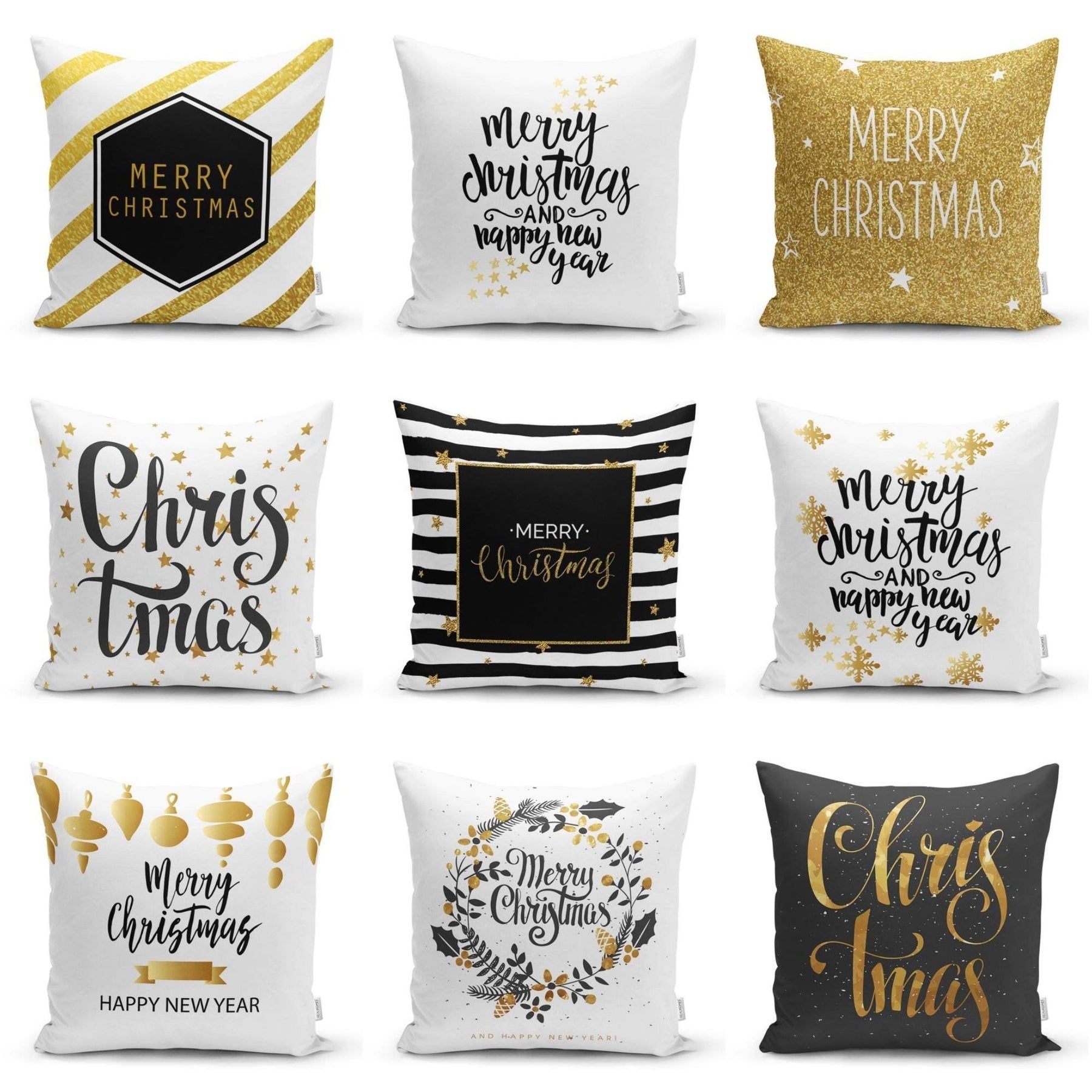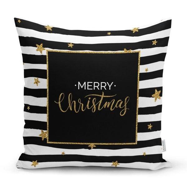 These elegant square decorative pillow covers with Merry Christmas, Happy New Year prints, gold stripes, floral frame;
