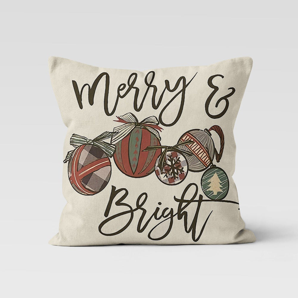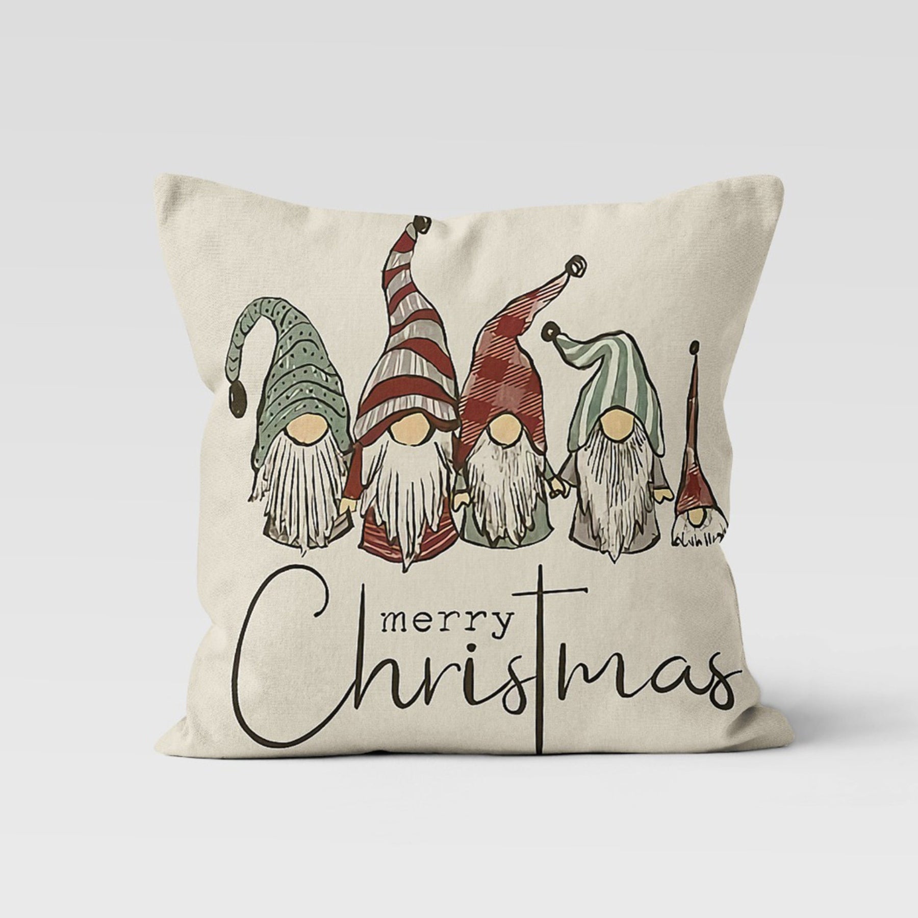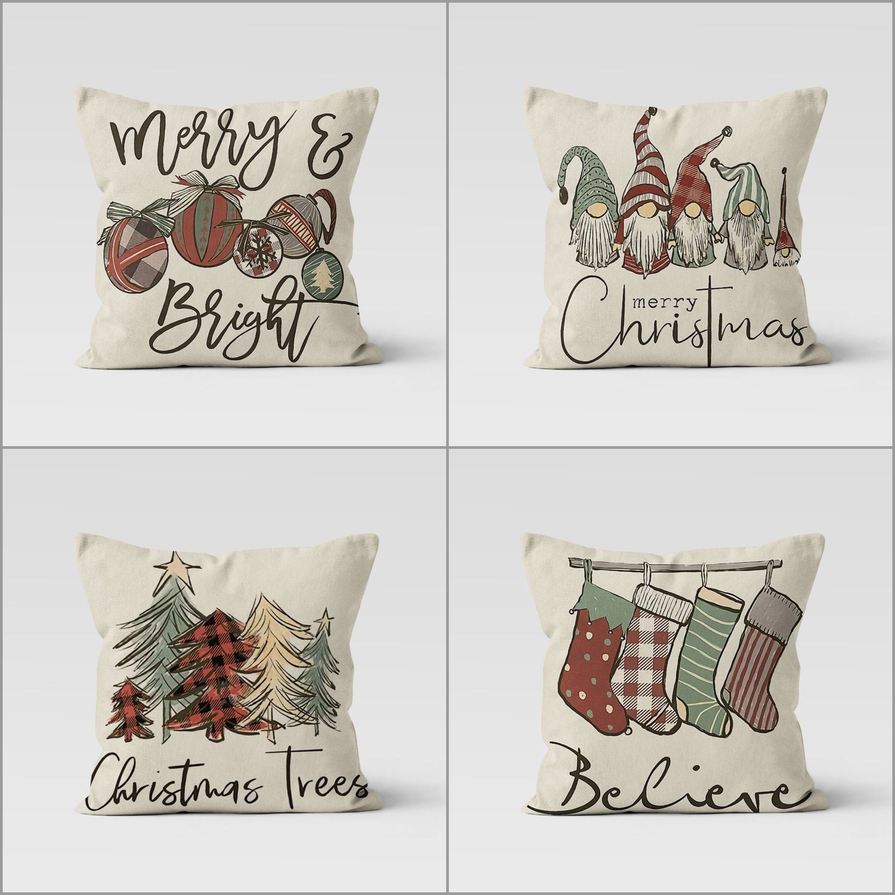 These elegant square decorative rustic farmhouse throw cushion covers with Merry and Bright, Merry Christmas, Christmas Trees, Believe prints, Xmas Ornaments, Gnome, Pine Trees, Xmas Socks and Xmas Ornaments;