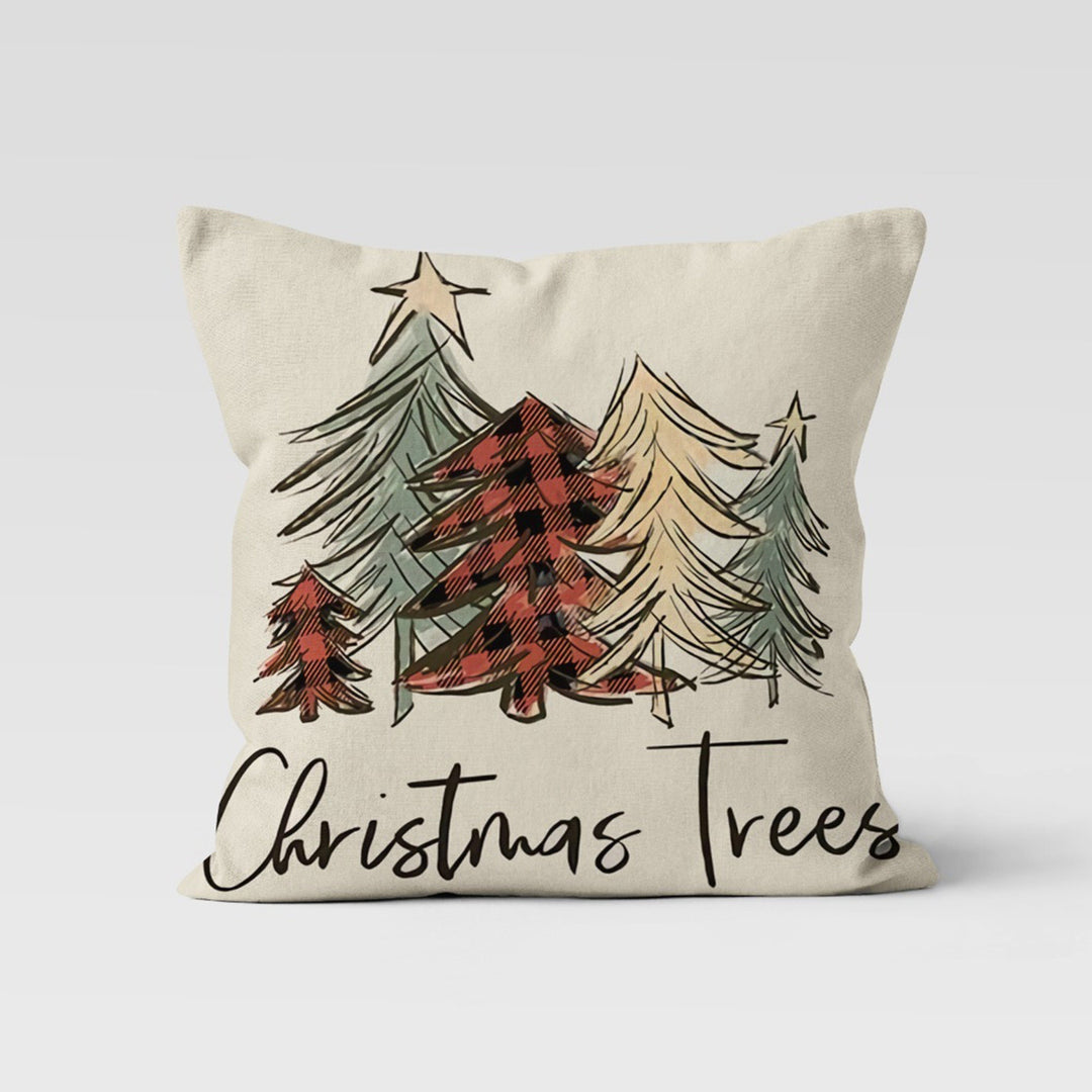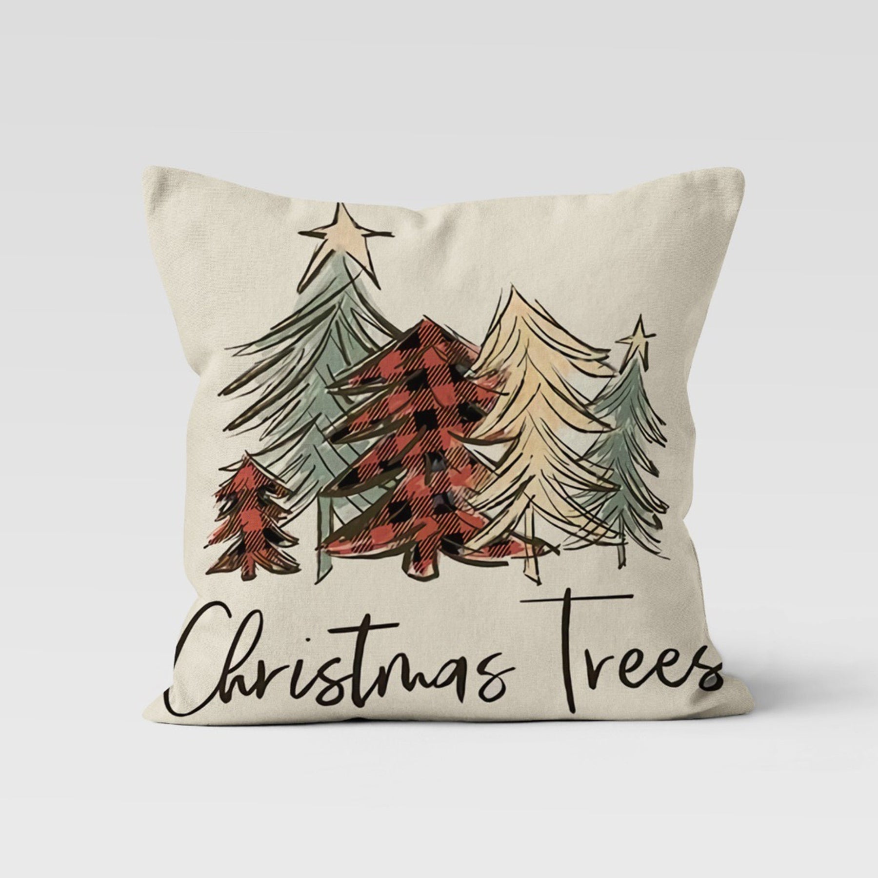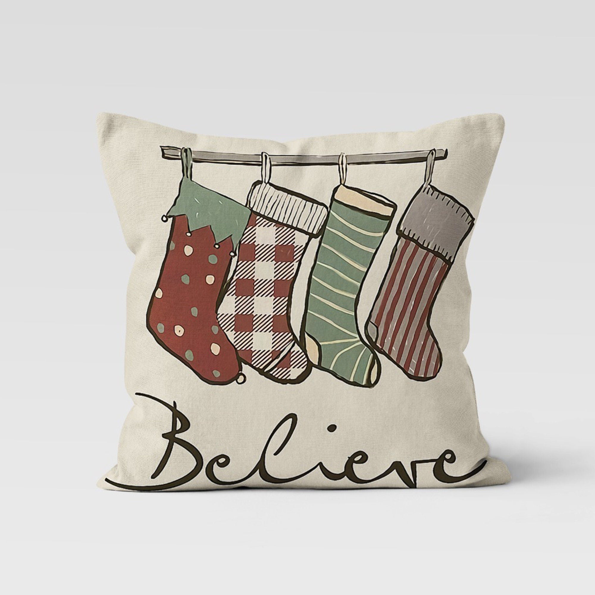 These elegant square decorative rustic farmhouse throw cushion covers with Merry and Bright, Merry Christmas, Christmas Trees, Believe prints, Xmas Ornaments, Gnome, Pine Trees, Xmas Socks and Xmas Ornaments;