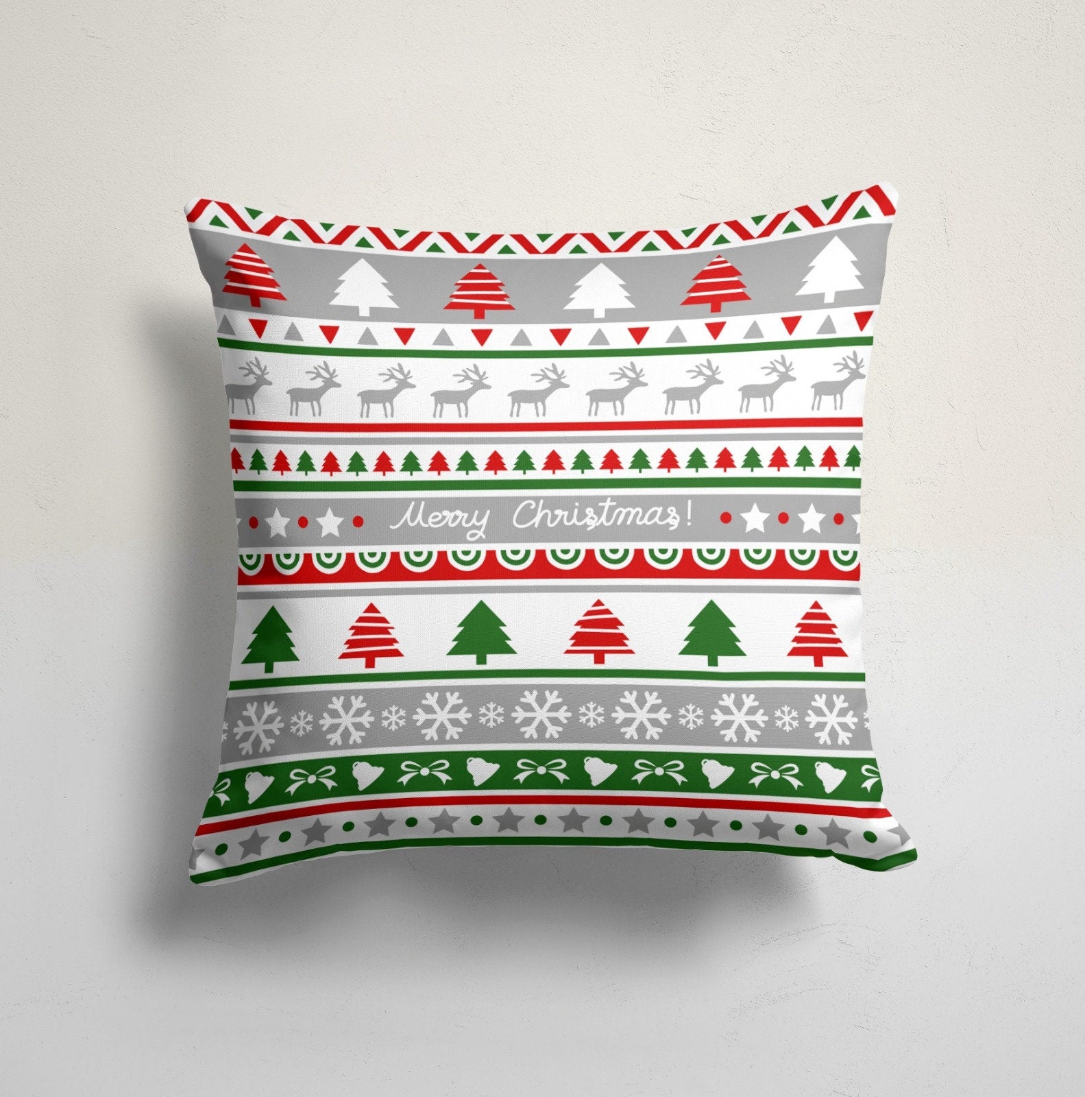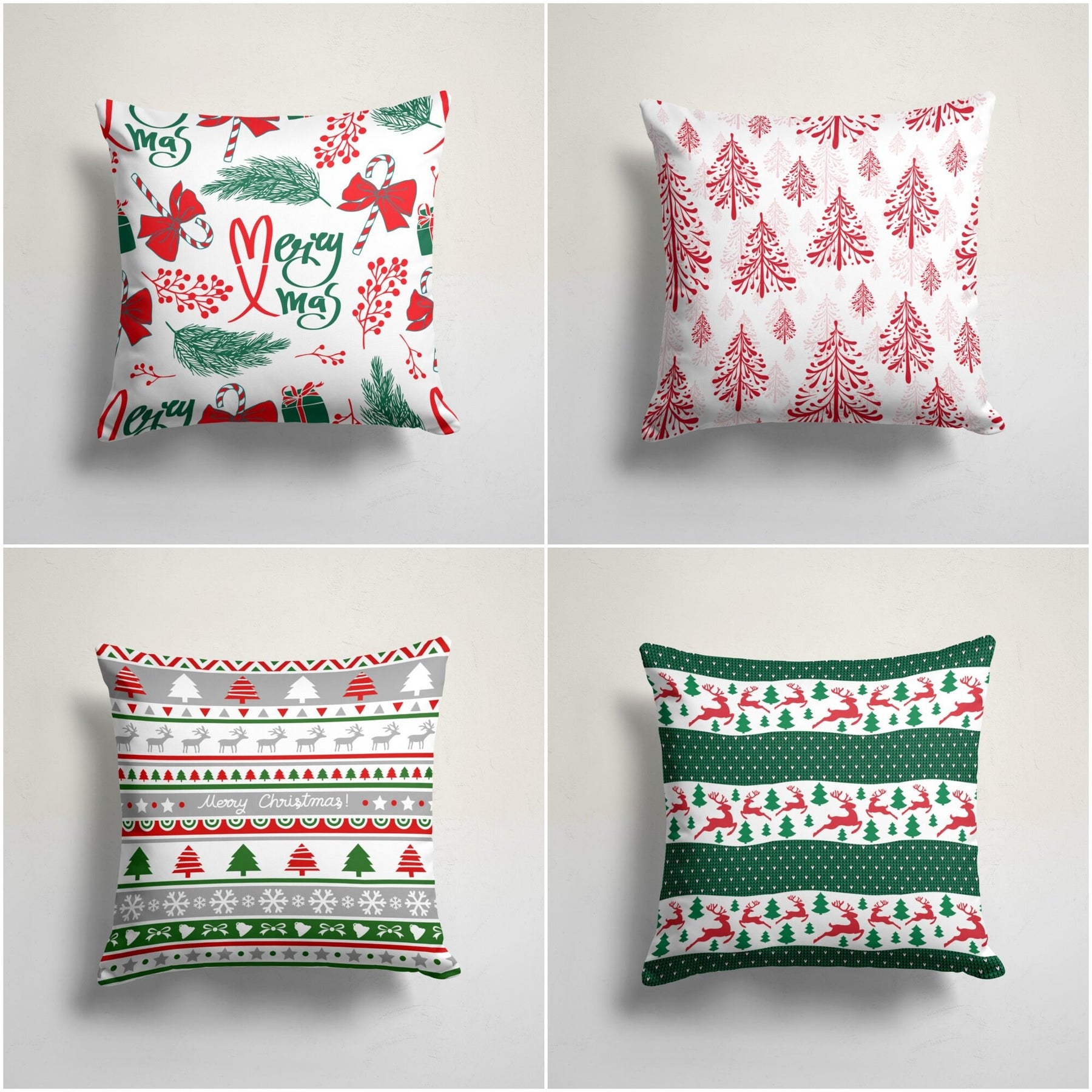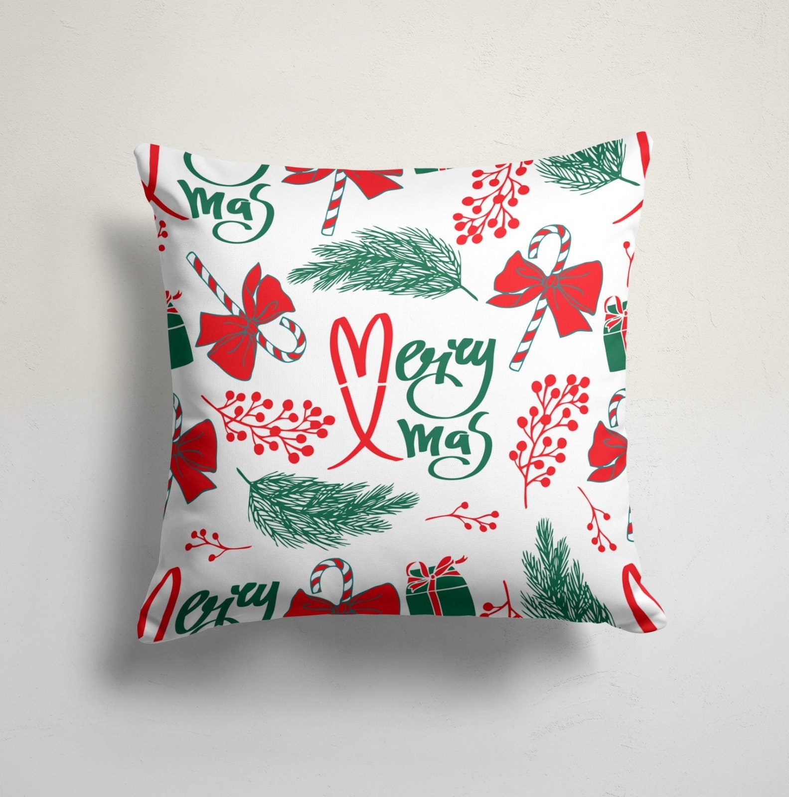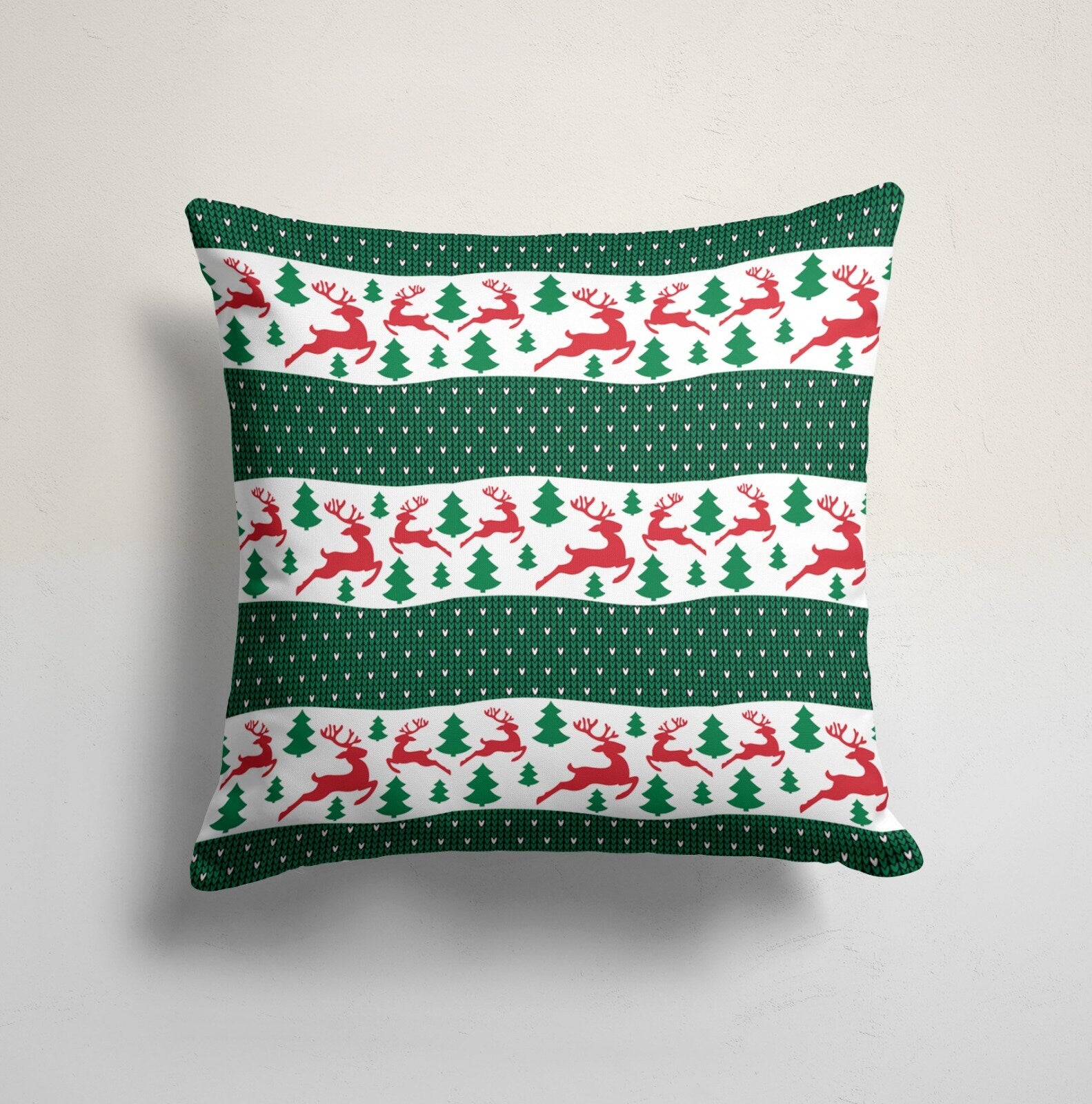 These elegant square decorative rustic farmhouse throw cushion covers with red/white/green design and Merry Christmas, Merry Xmas Print, Xmas deer, Xmas tree, snowflake;