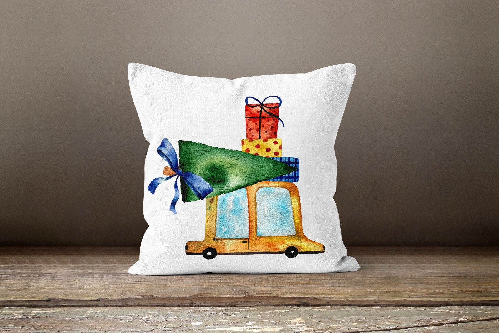 These elegant square decorative rustic farmhouse throw cushion covers with pine trees, bird nest with Merry Christmas print, blue and yellow cars;