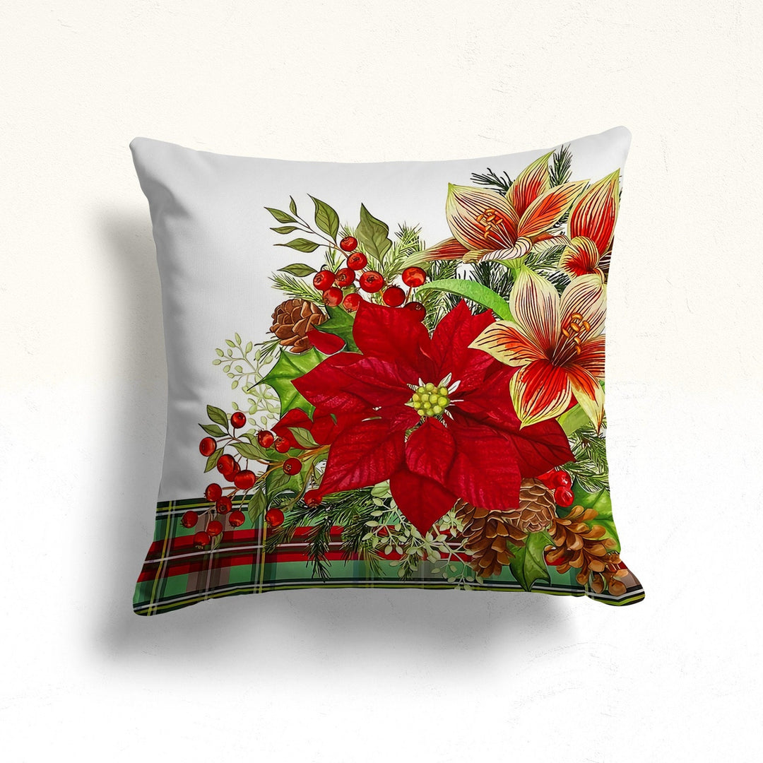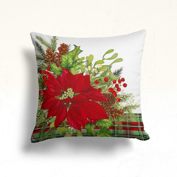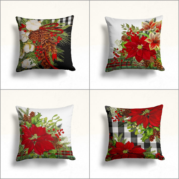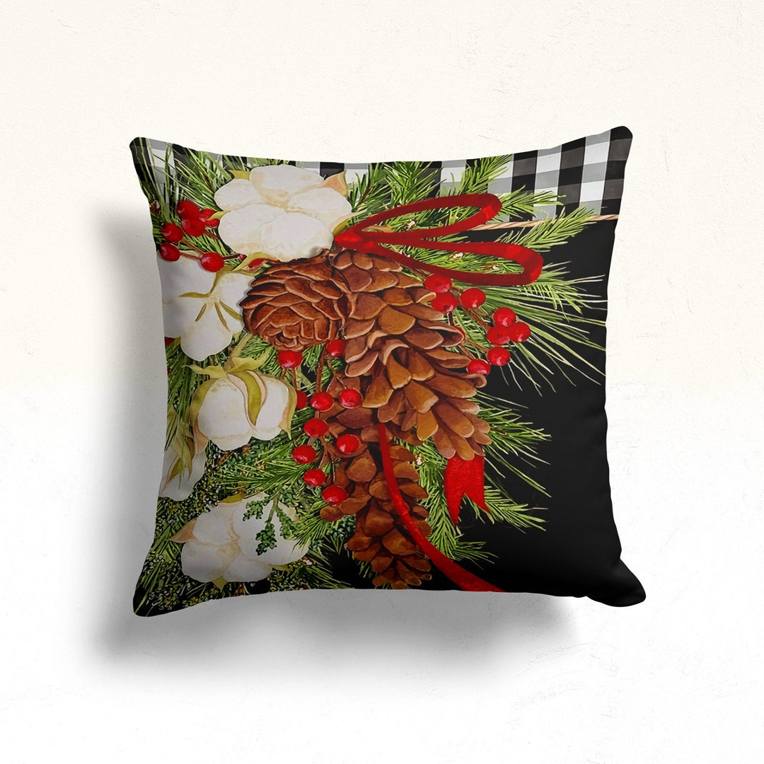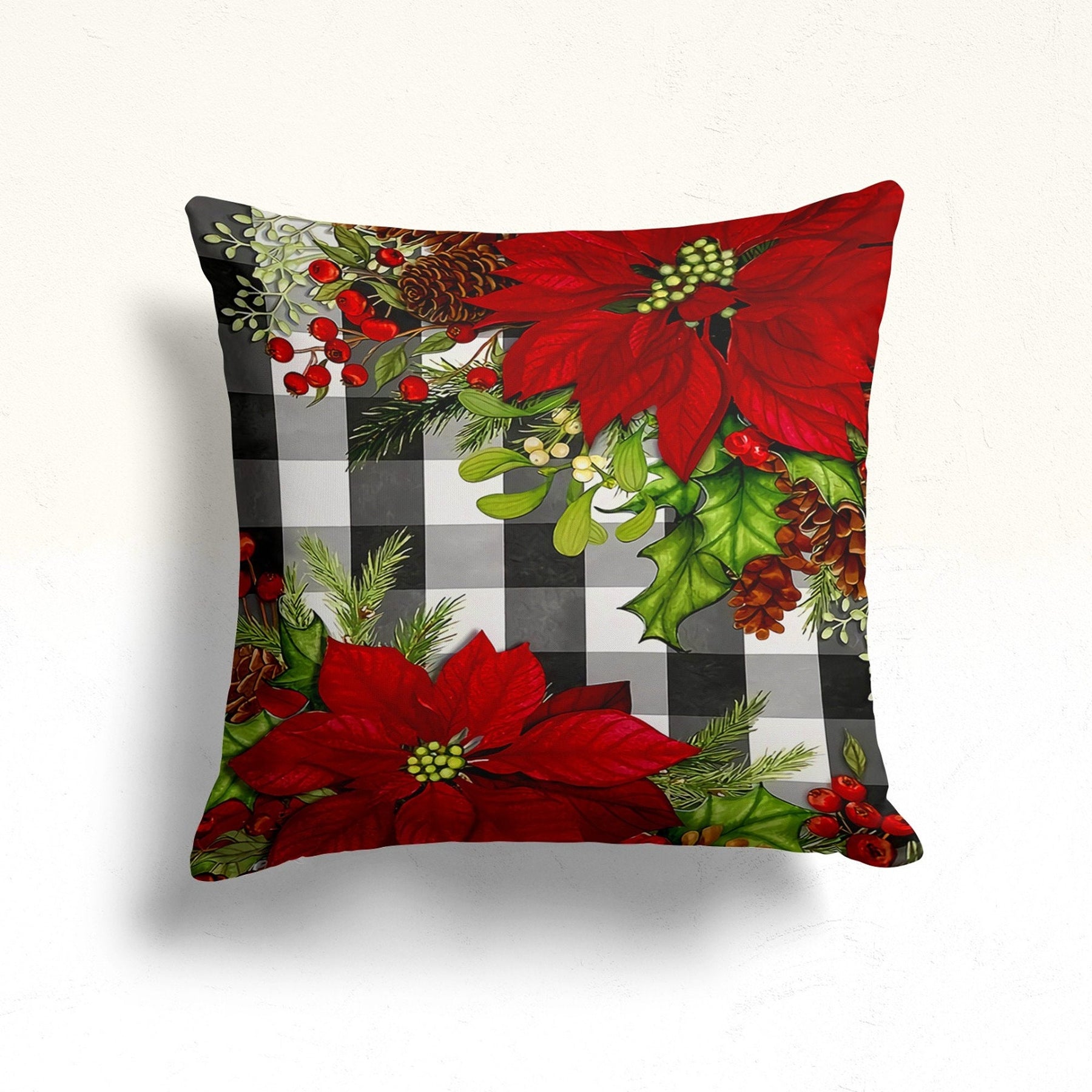 These elegant square decorative rustic farmhouse throw cushion covers with Poinsettia and Pine Cone print on checkered background;