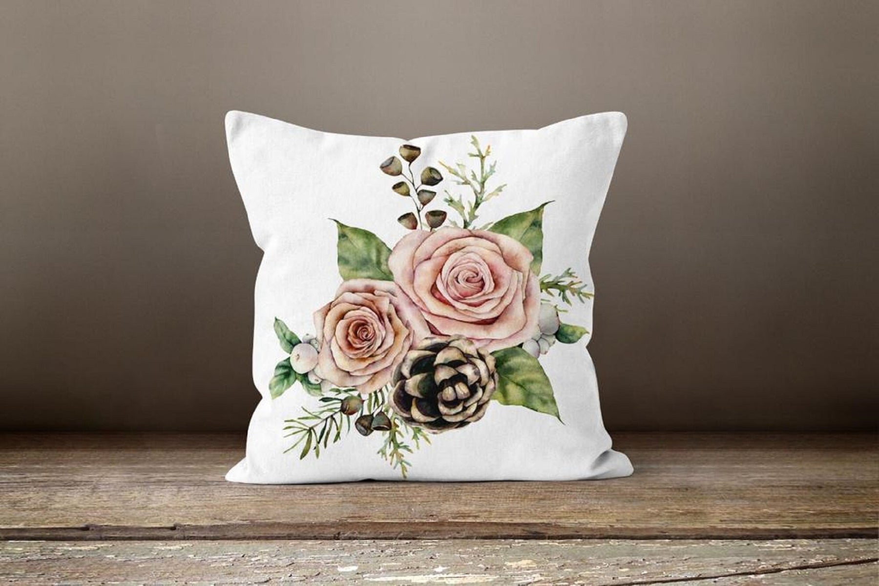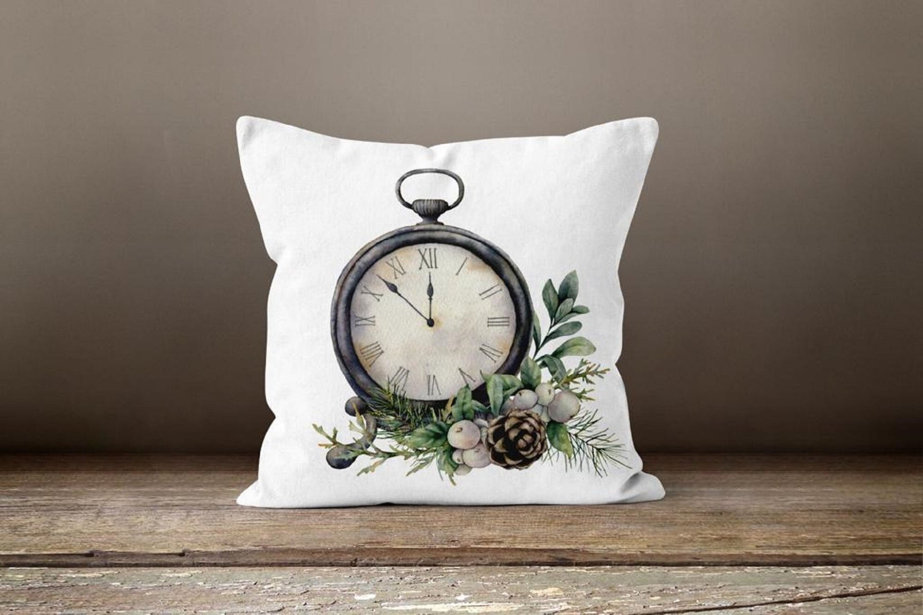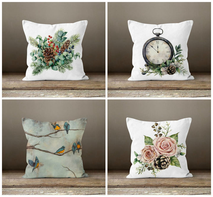 These elegant square decorative rustic farmhouse throw cushion covers with bird, pocket watch and xmas ornaments;