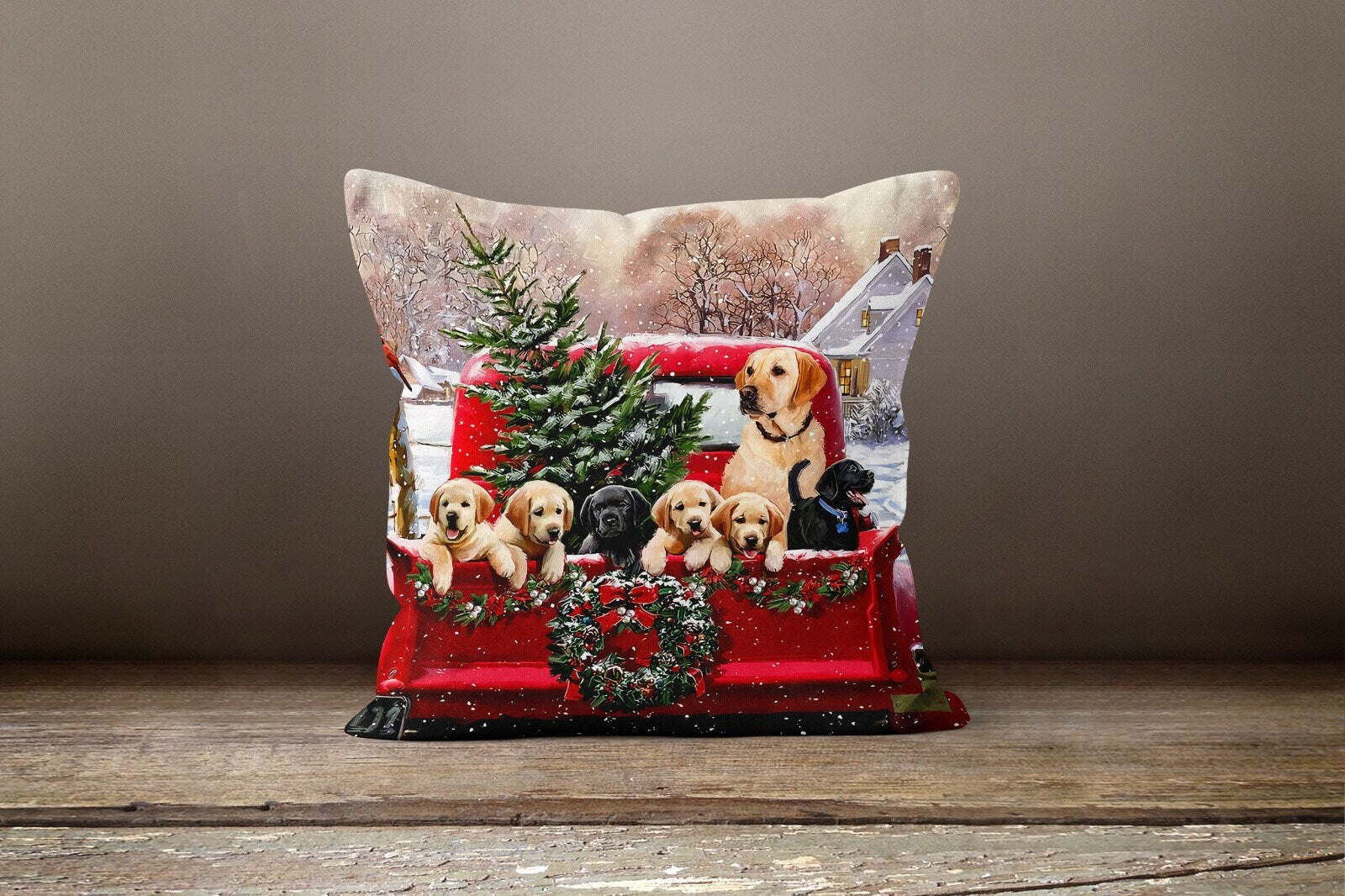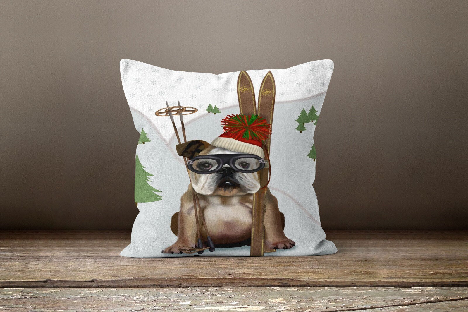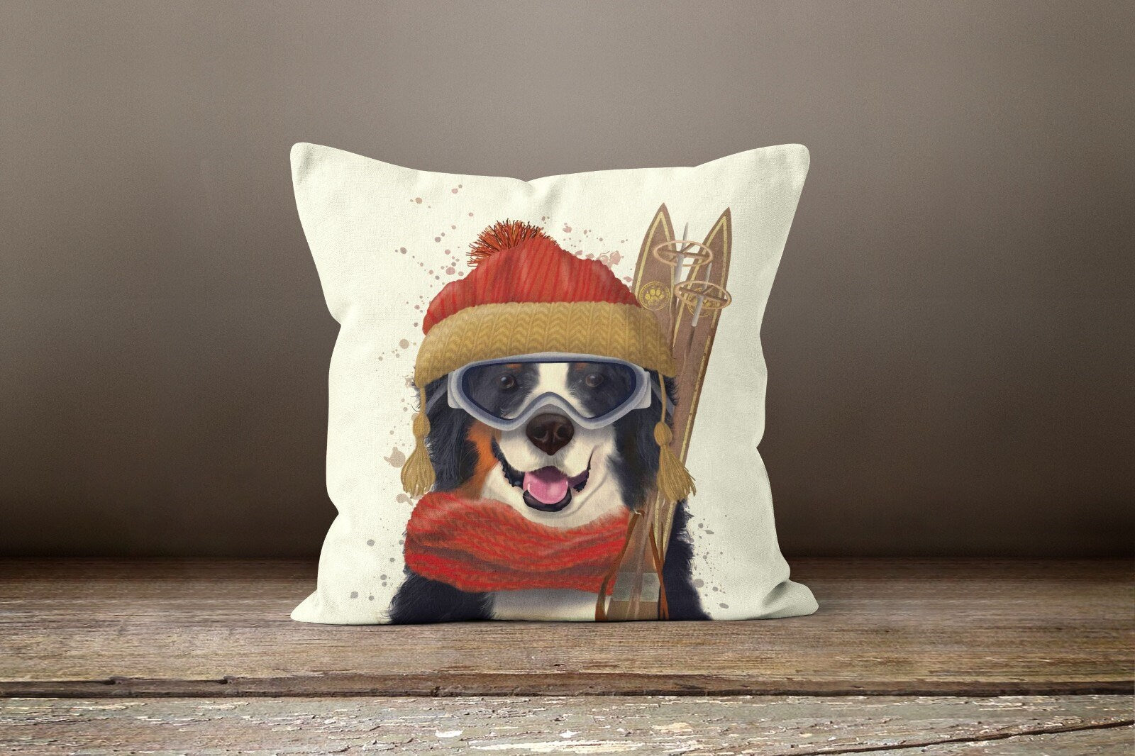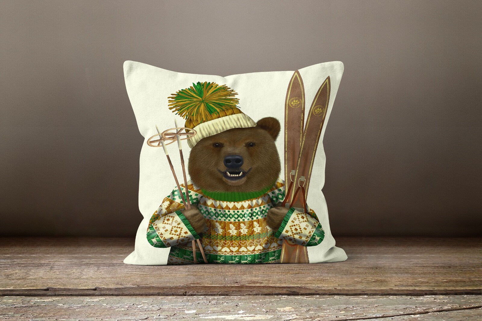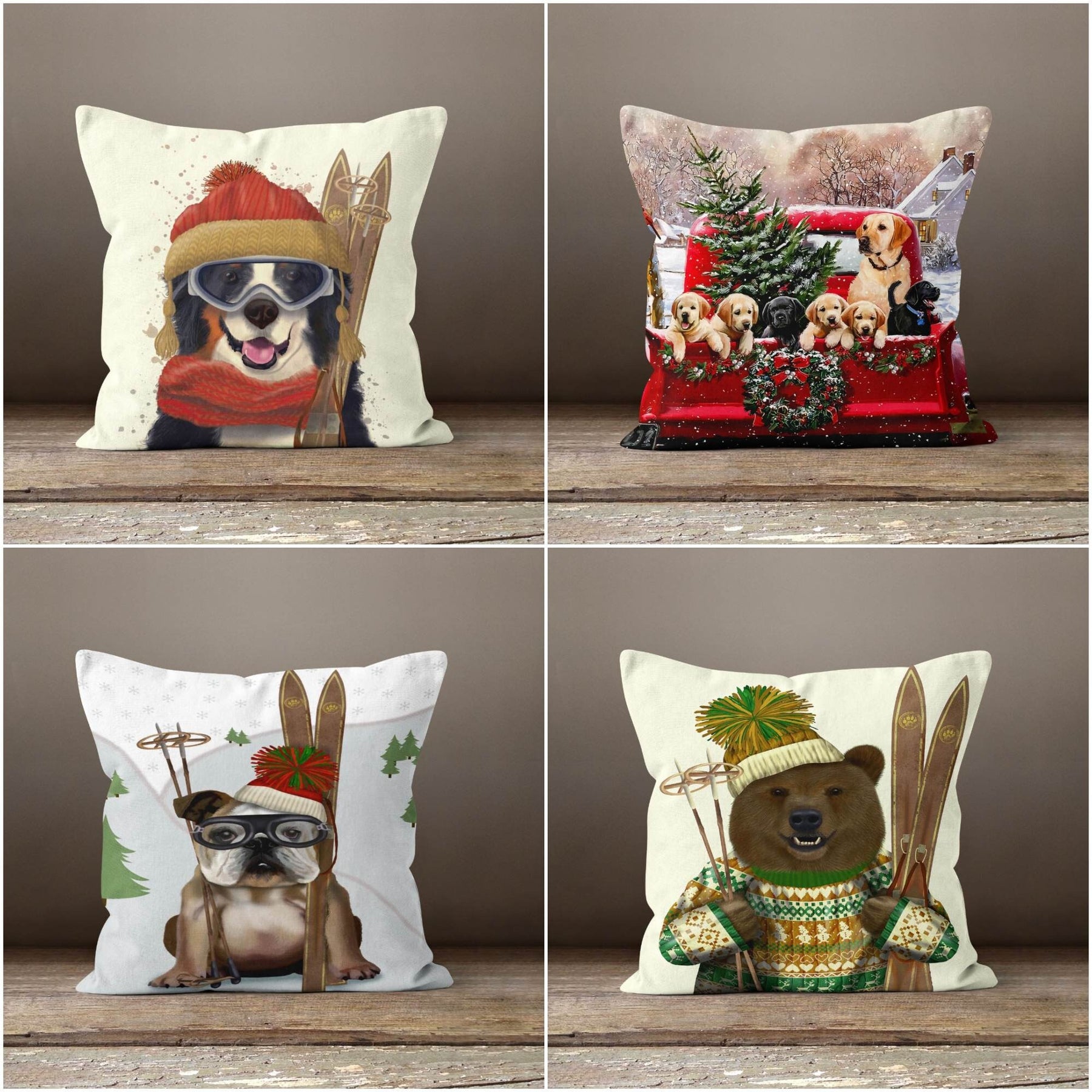 These elegant square decorative rustic farmhouse throw cushion covers with dogs and bear in ski suit, cute dogs with Xmas tree;