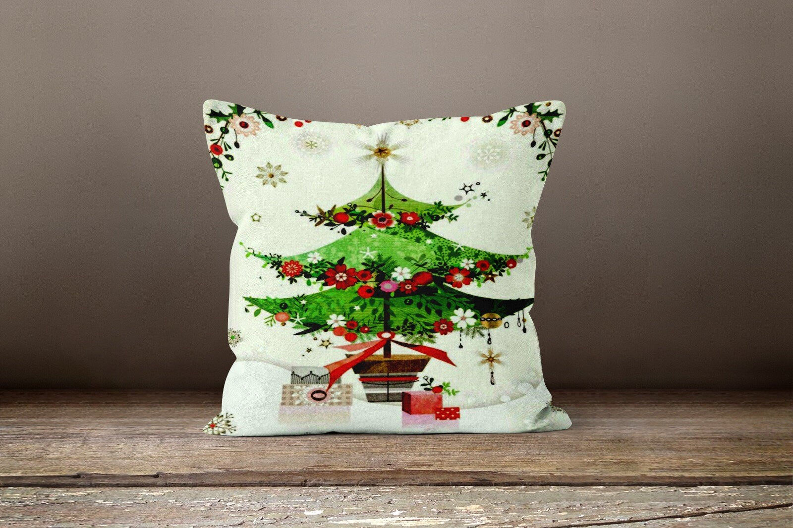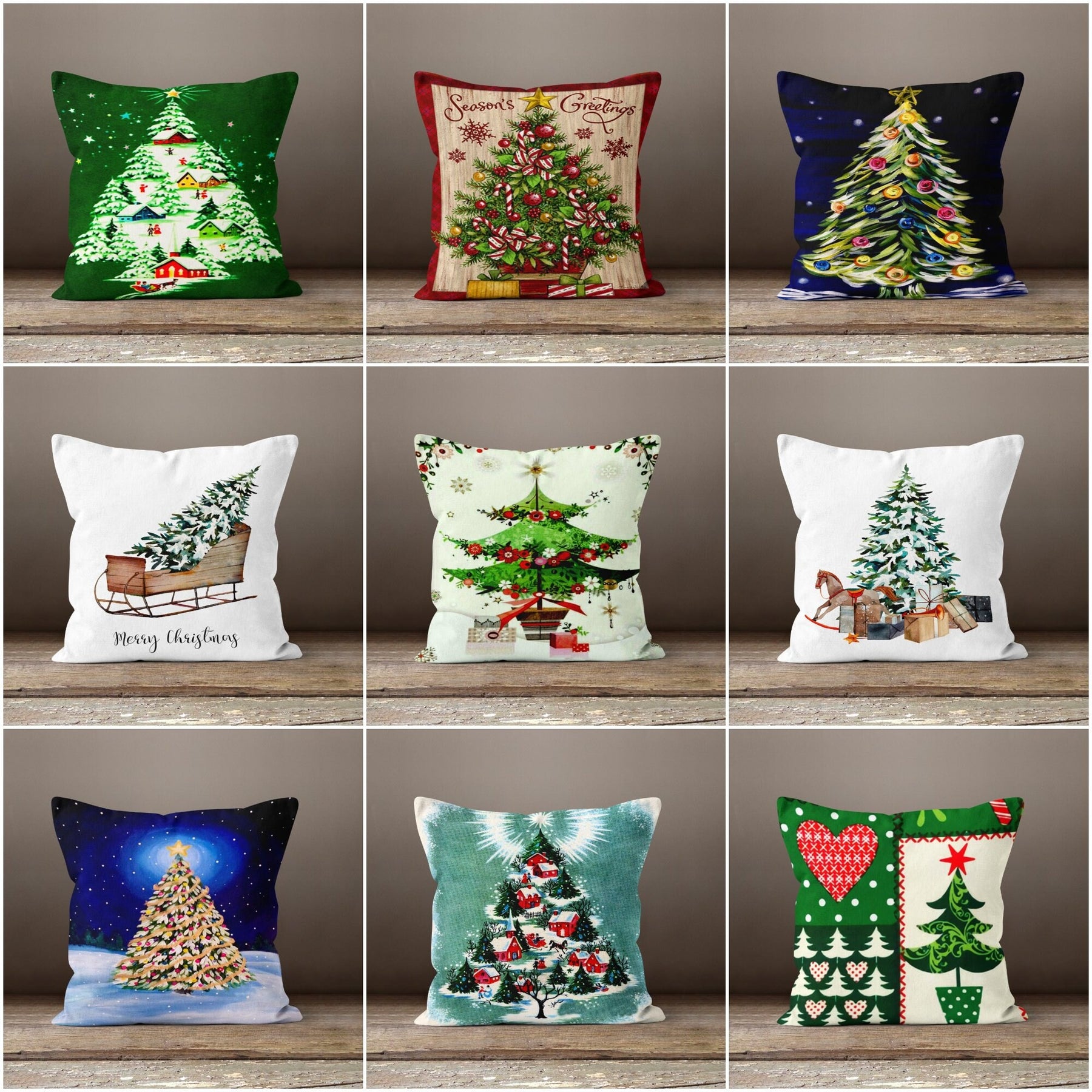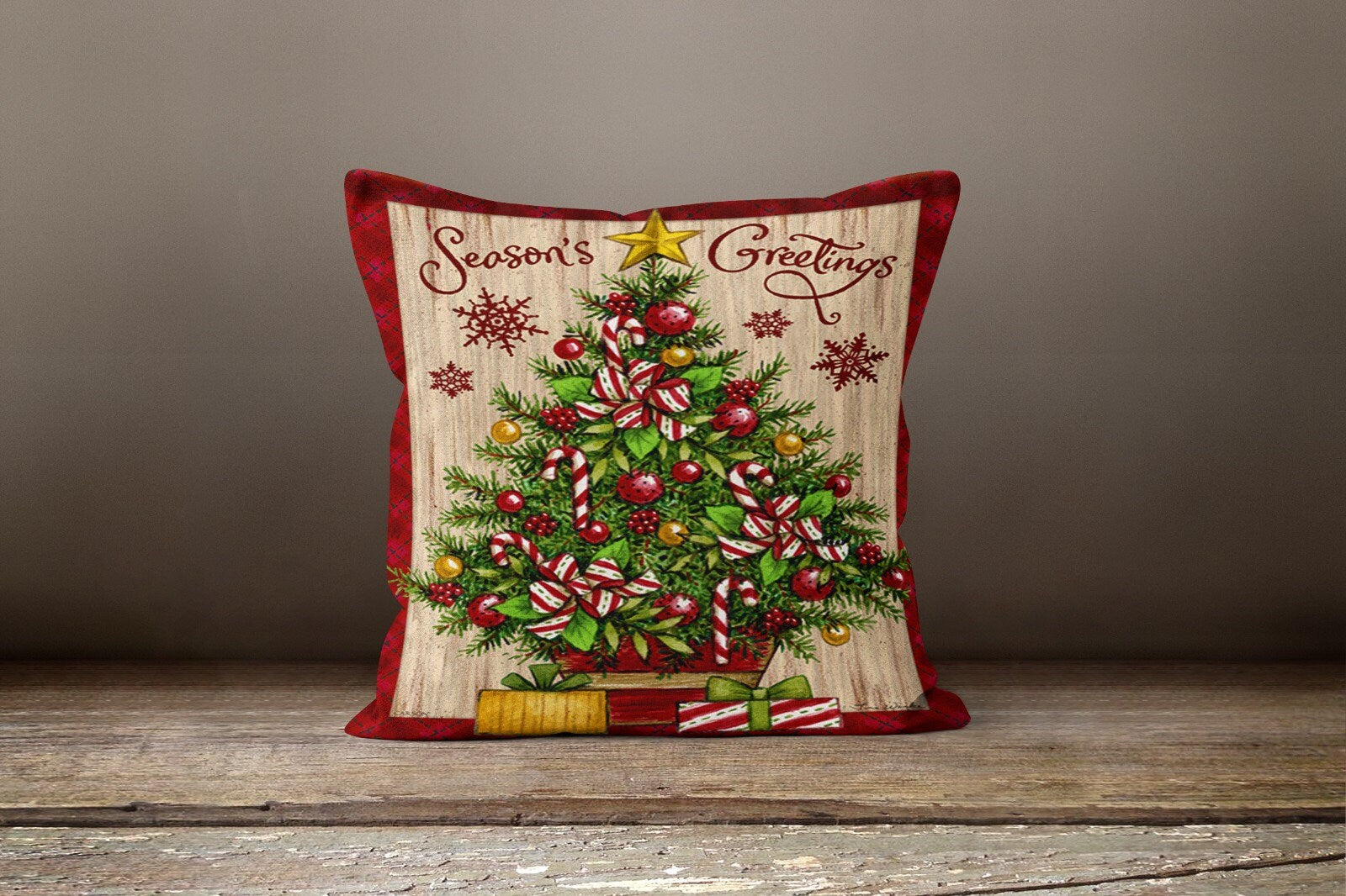 These elegant square decorative rustic farmhouse throw cushion covers with Xmas trees, Season's Greetings and Merry Christmas prints;