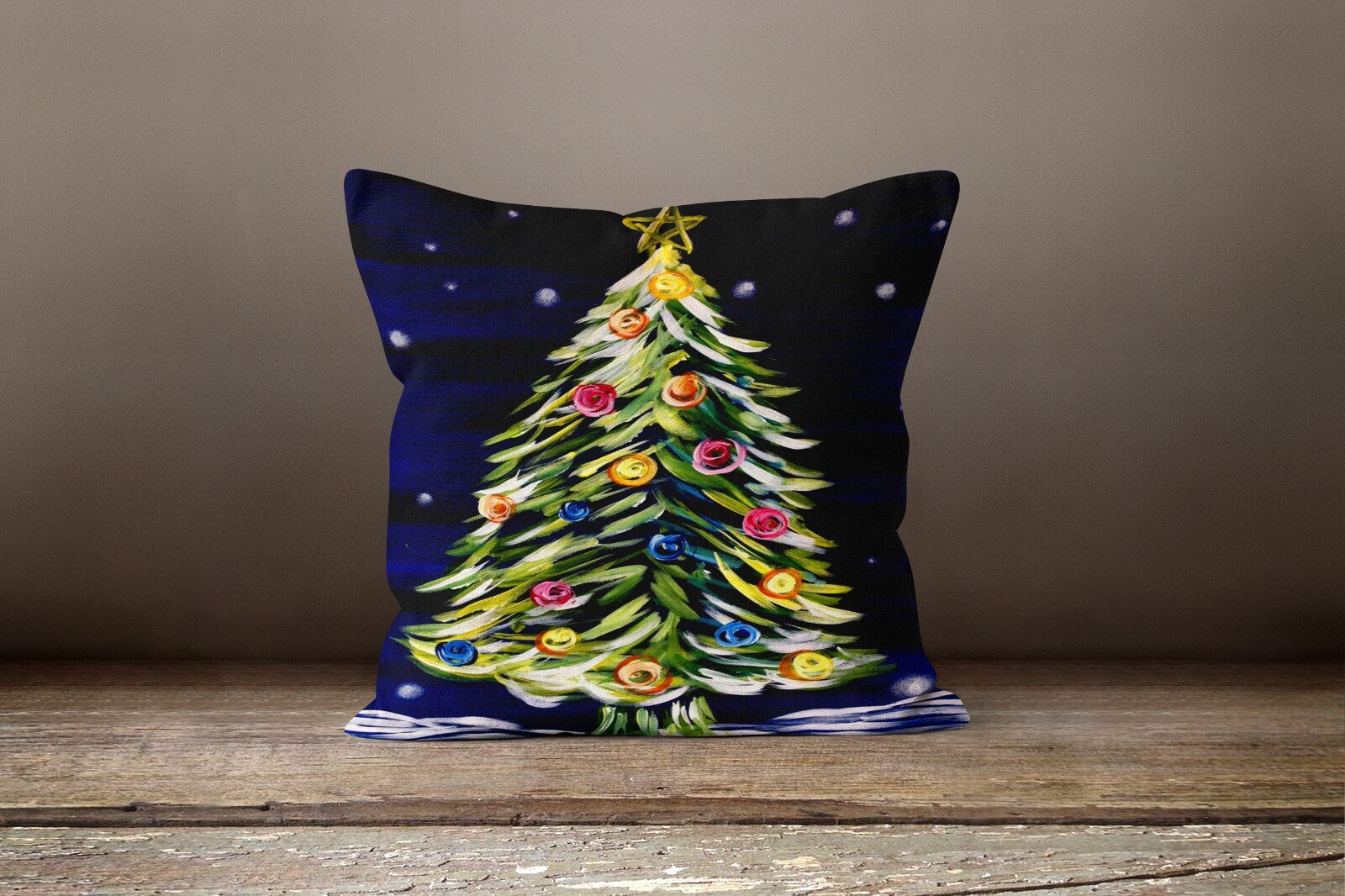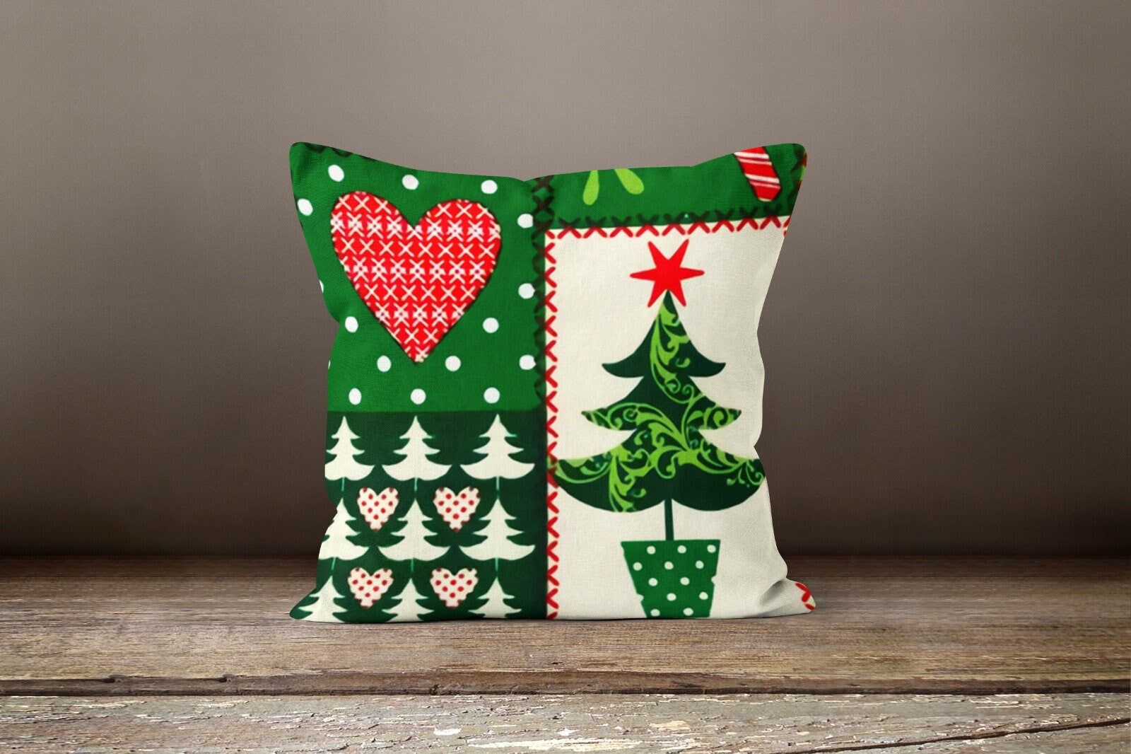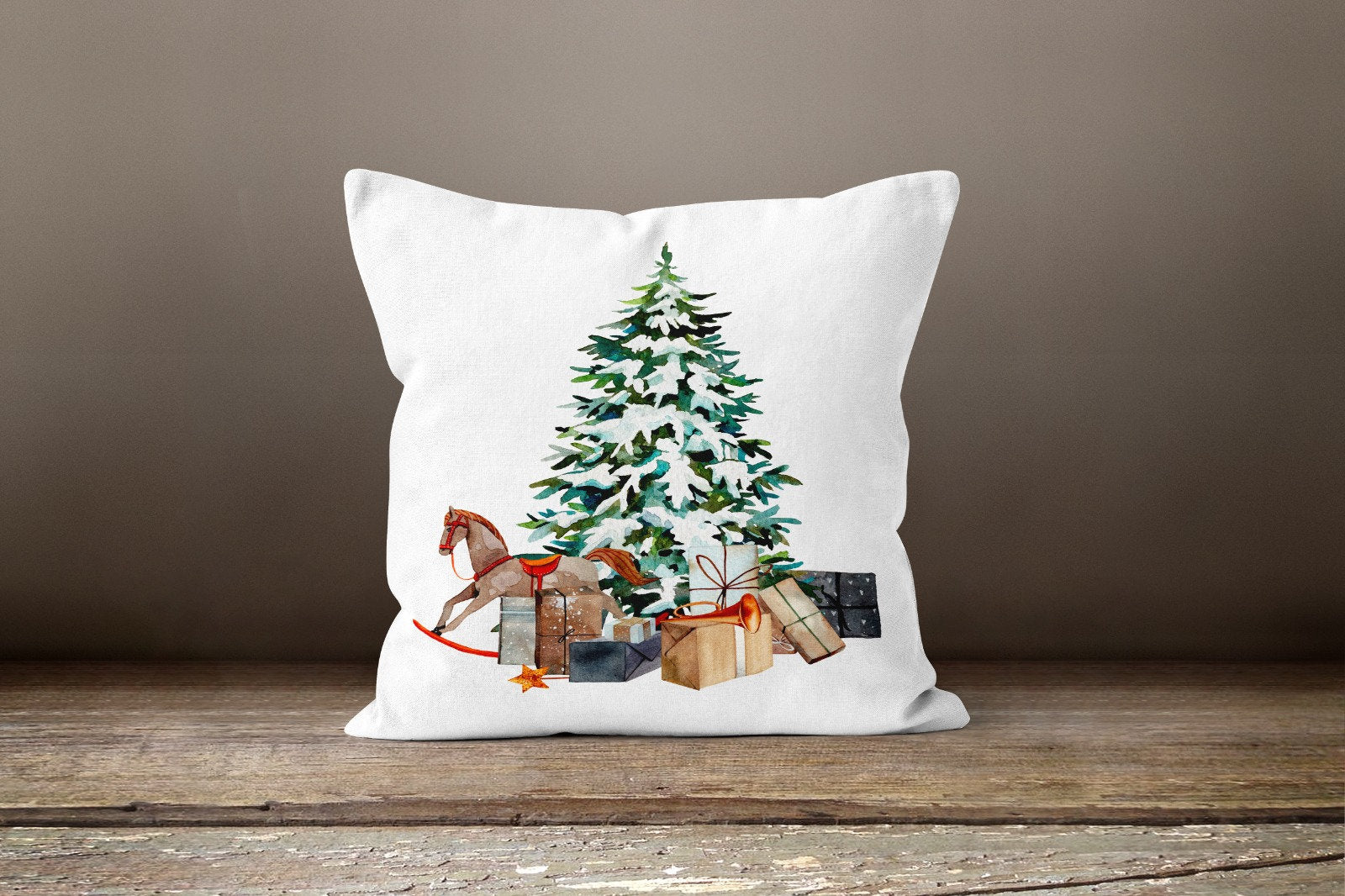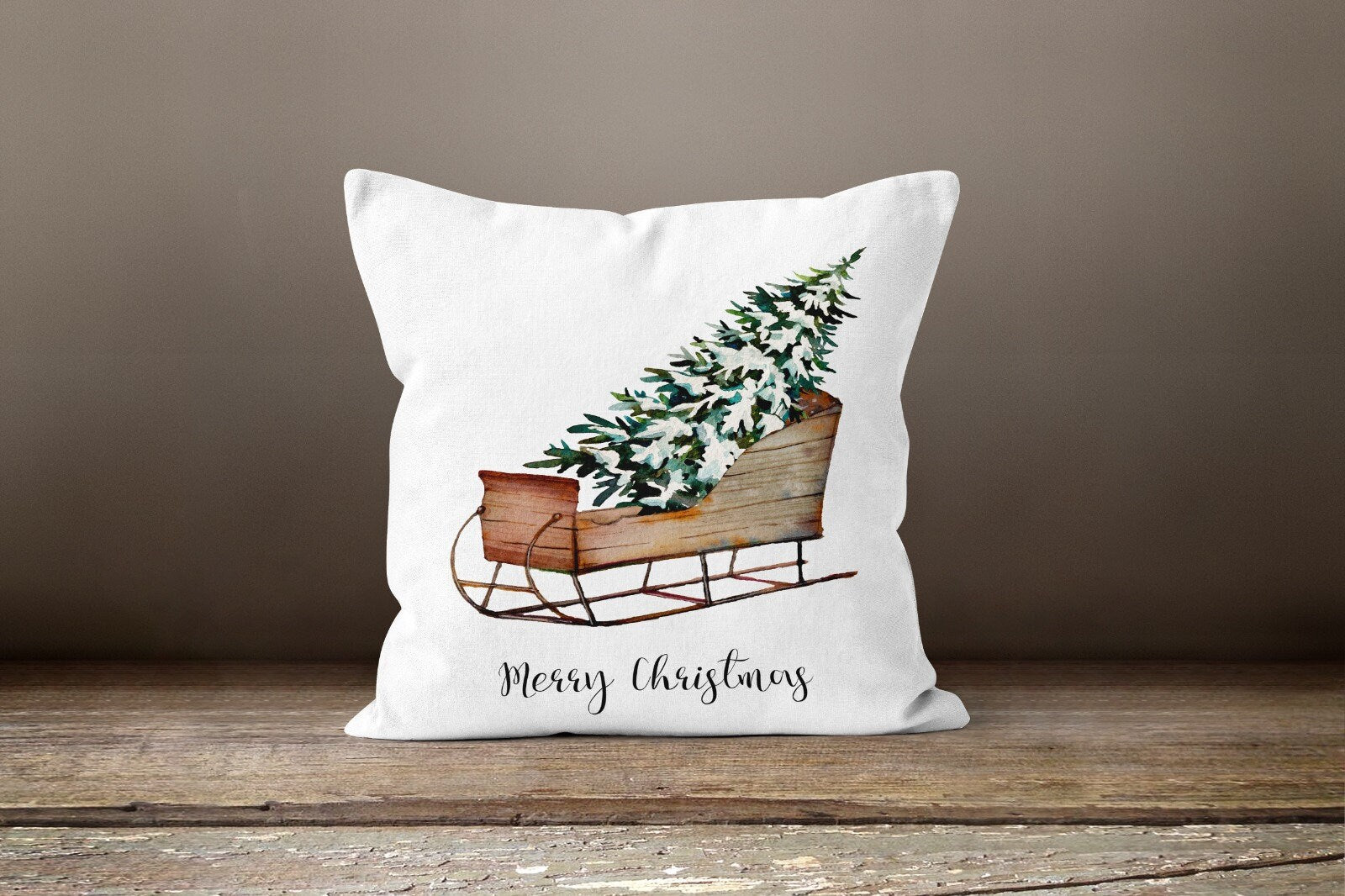 These elegant square decorative rustic farmhouse throw cushion covers with Xmas trees, Season's Greetings and Merry Christmas prints;
