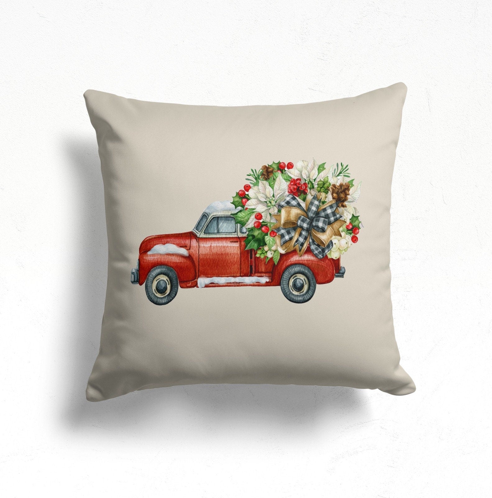 These elegant square decorative rustic farmhouse throw cushion covers with pine trees, Xmas trees, truck carrying pine tree and red/white poinsettia flowers, Farm Fresh Christmas Trees print, checkered Xmas truck;