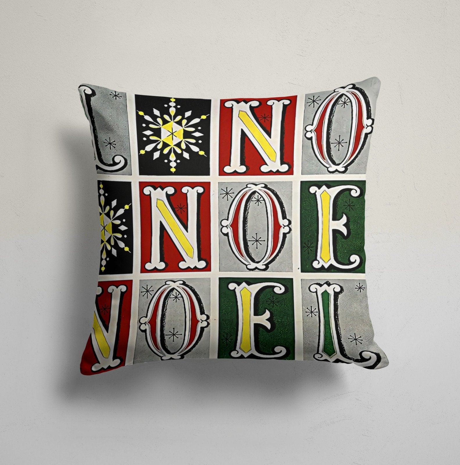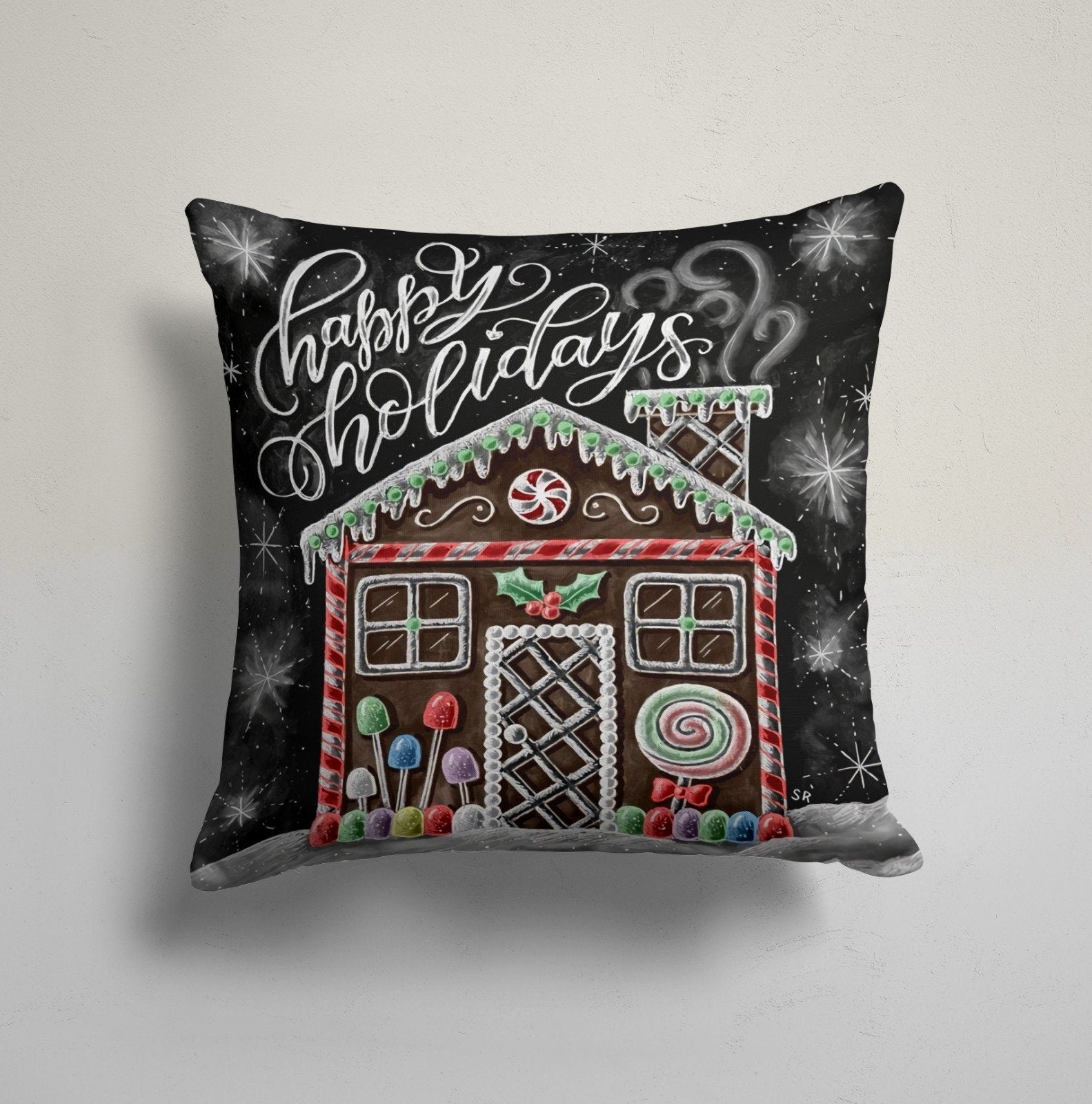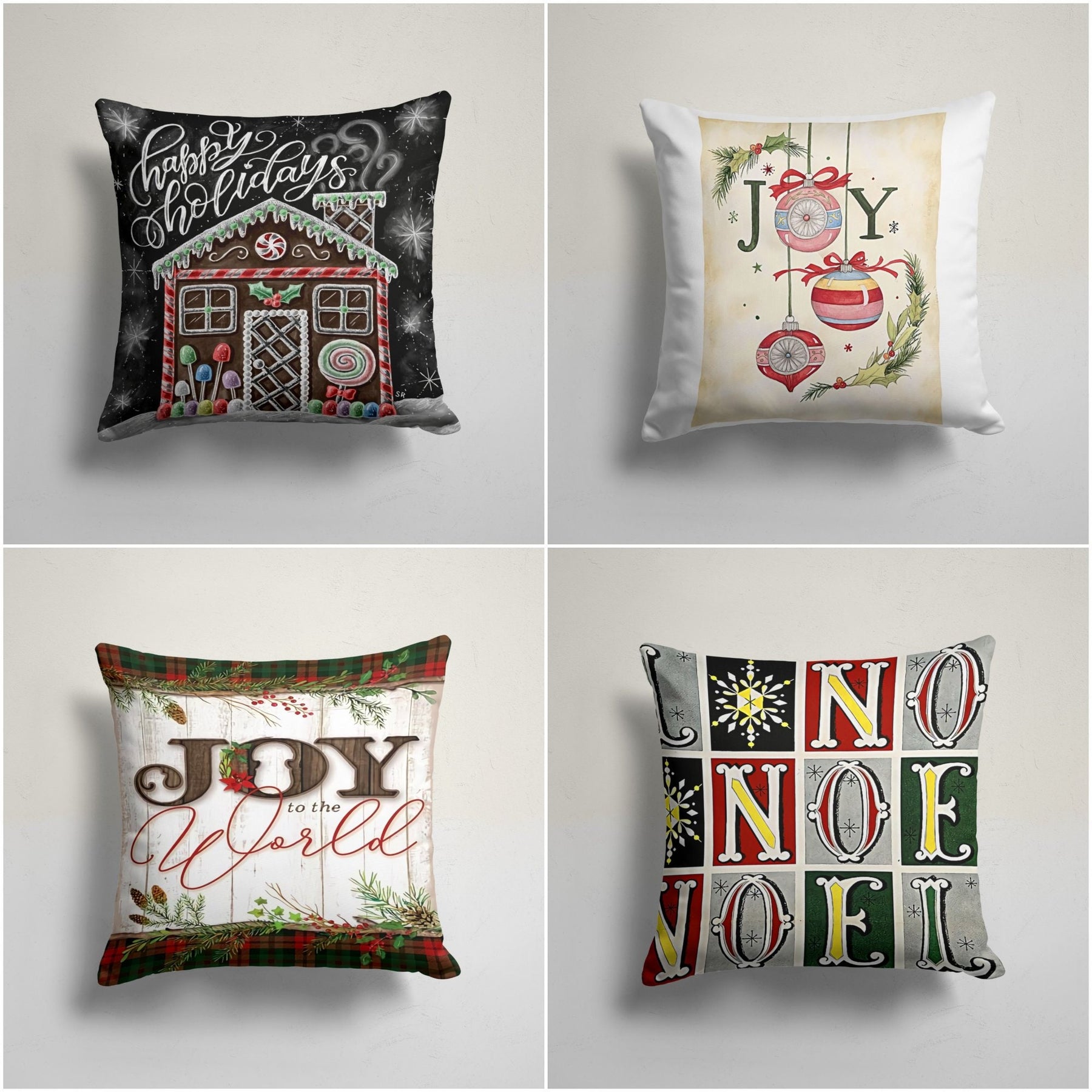 These elegant square decorative farmhouse throw cushion covers with Happy Holidays, Joy to the World, Noel prints, candy house, red berries, Xmas ornaments;